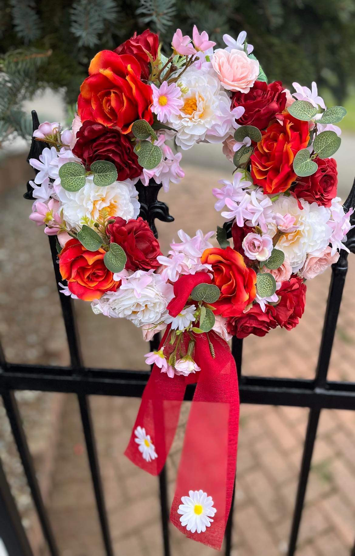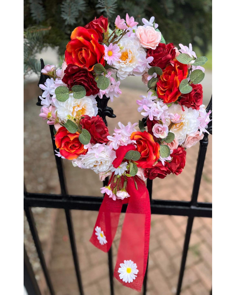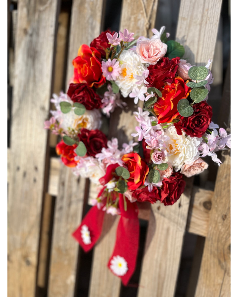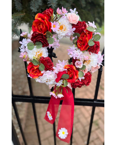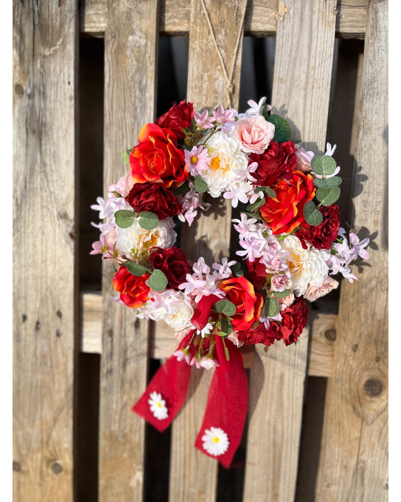 Veniec plný kvetov v bielej, ružovej, červenej až bordovej farbe s mašľou.Priemer venca je 35 cm.