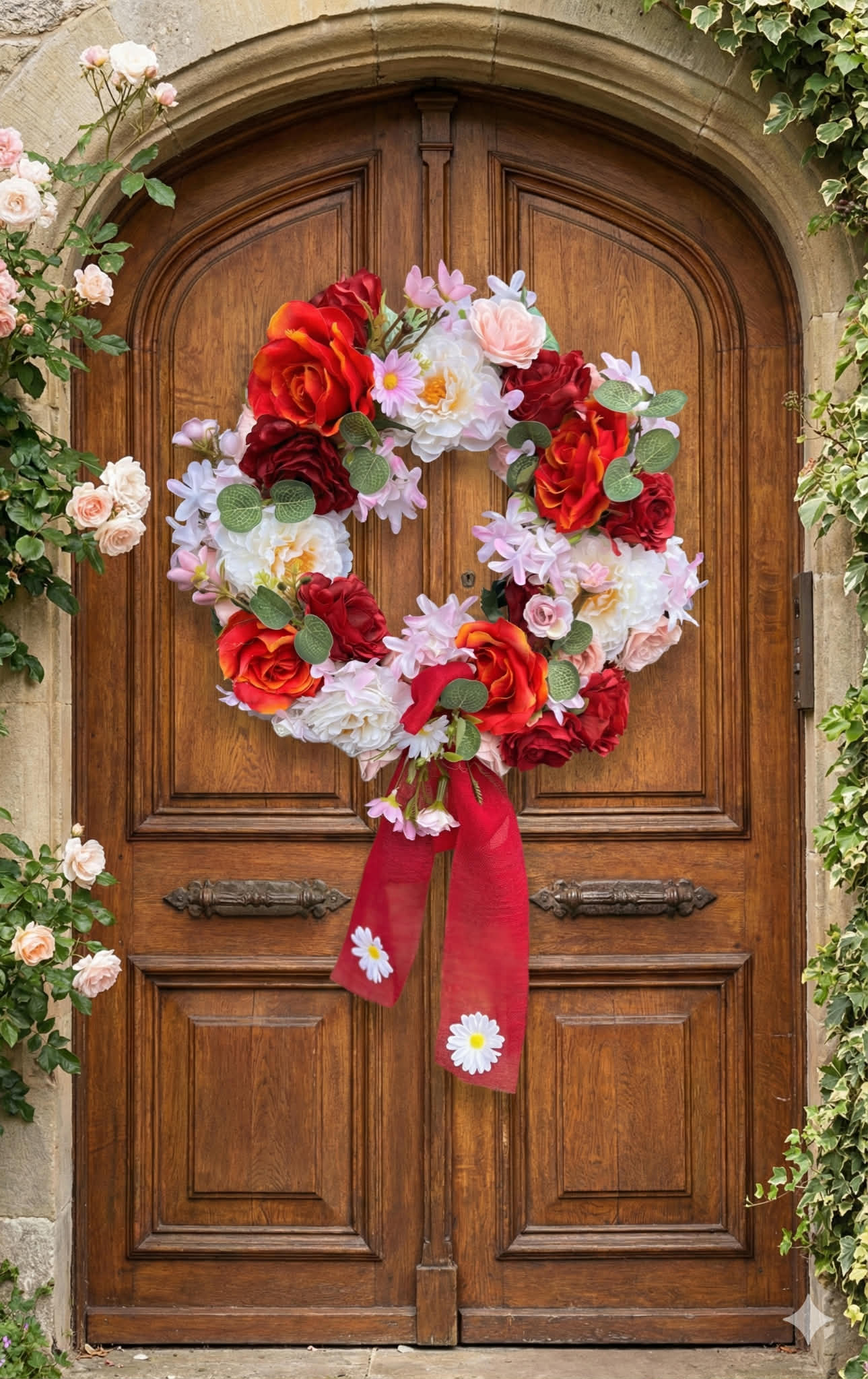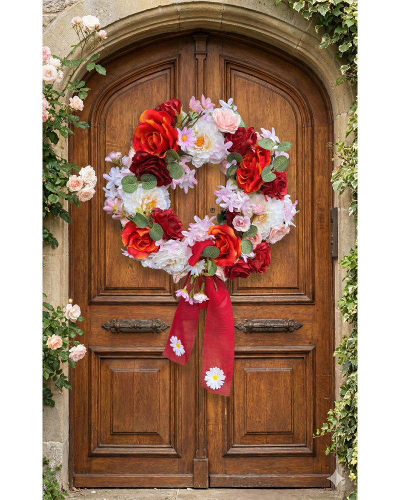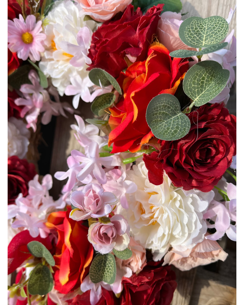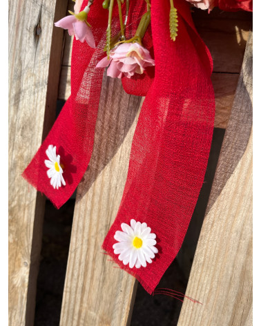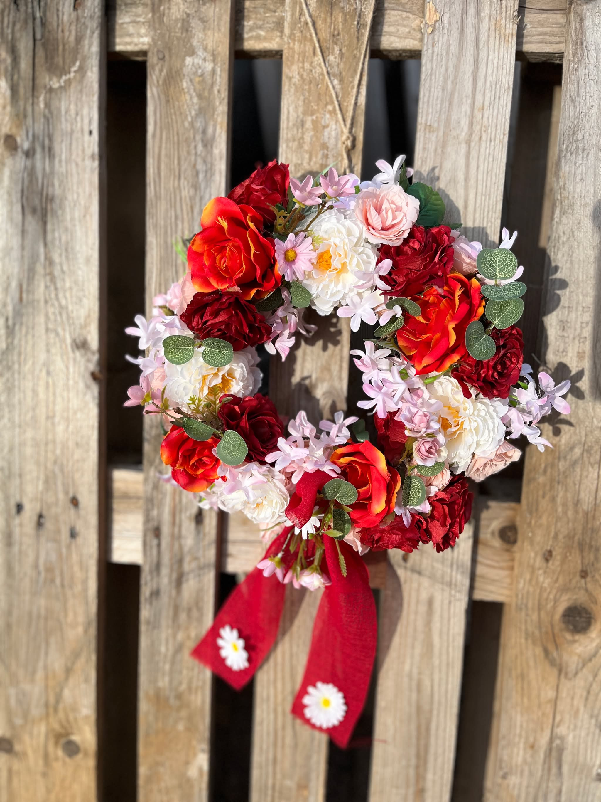 Veniec plný kvetov v bielej, ružovej, červenej až bordovej farbe s mašľou.Priemer venca je 35 cm.