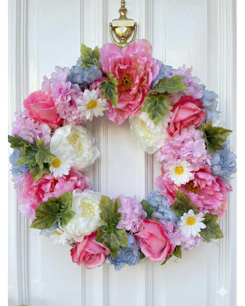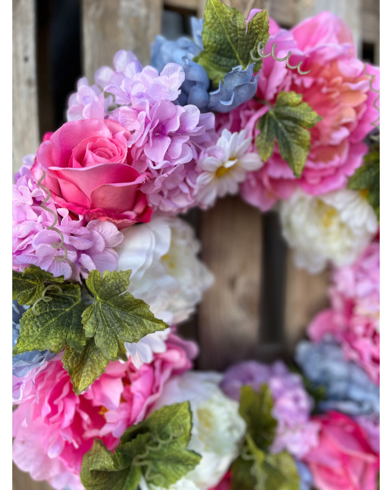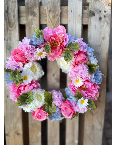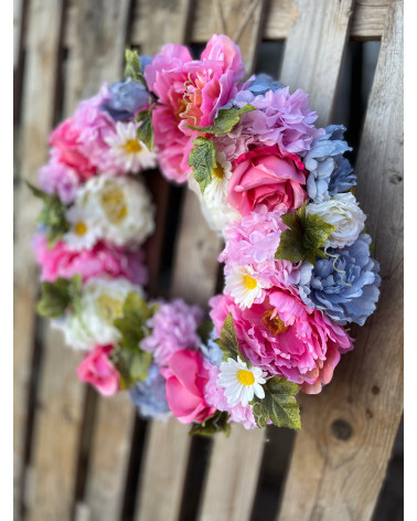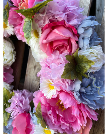 Veľký bohato zdobený veniec plný kvetov ladený prevažne do sviežej ružovej farby.