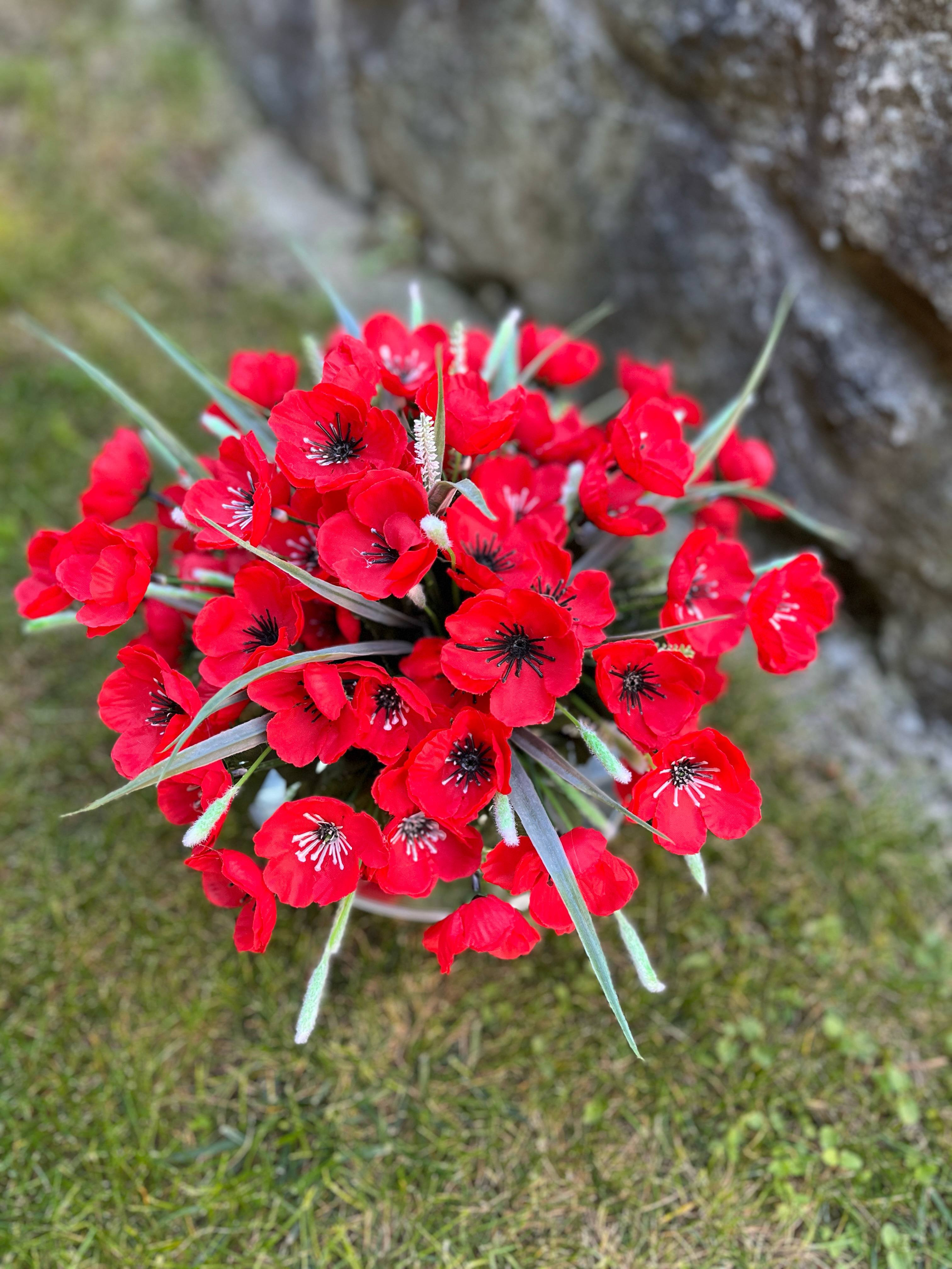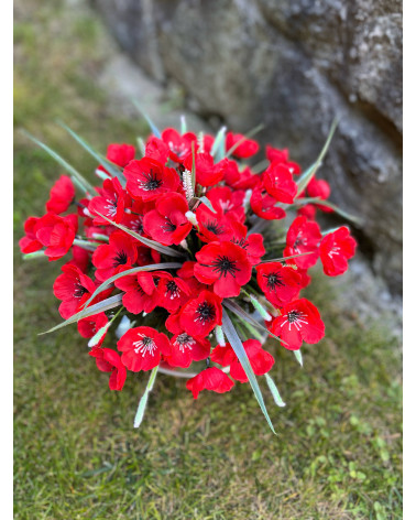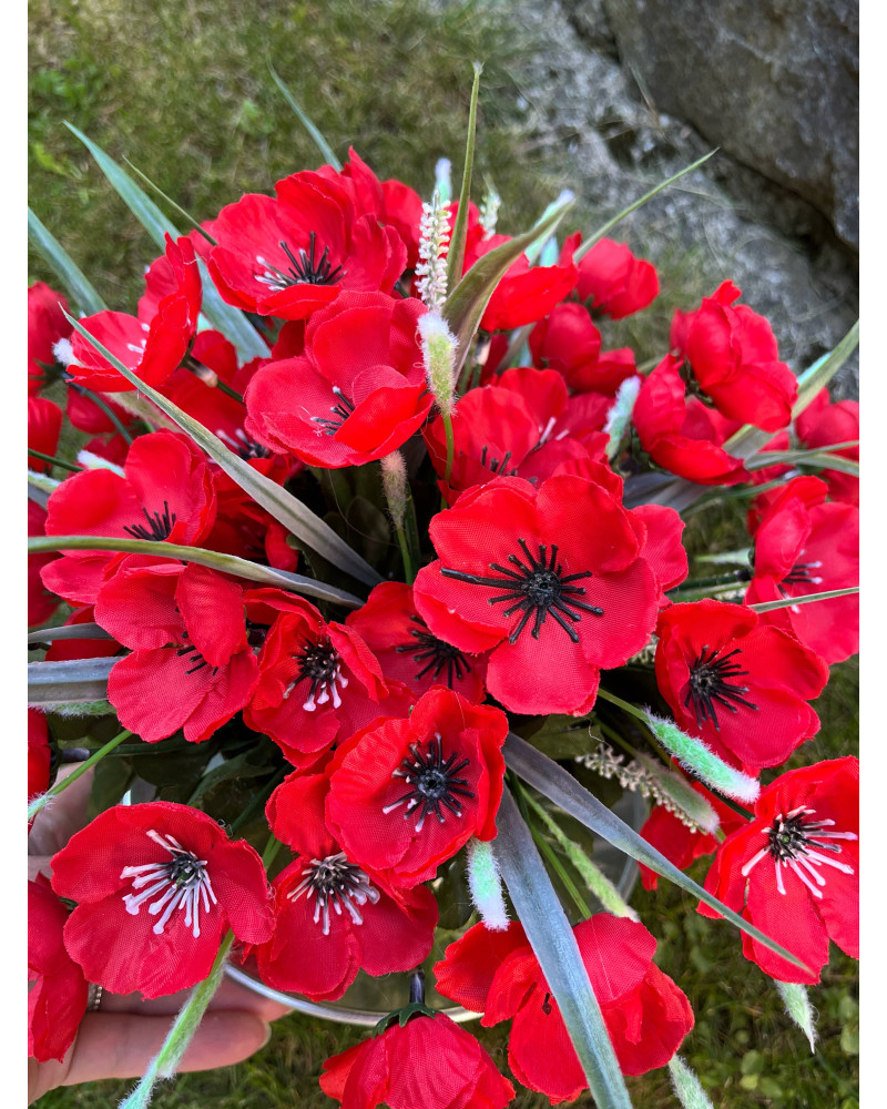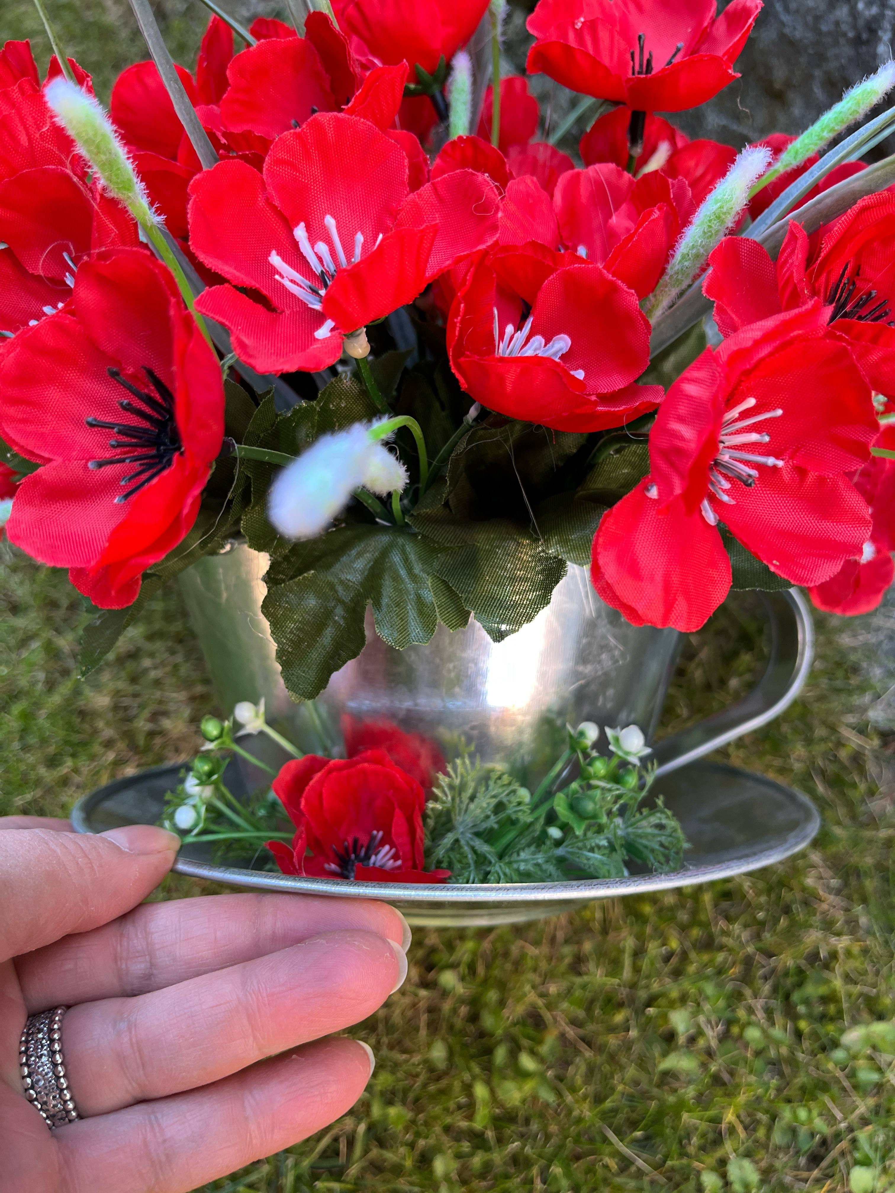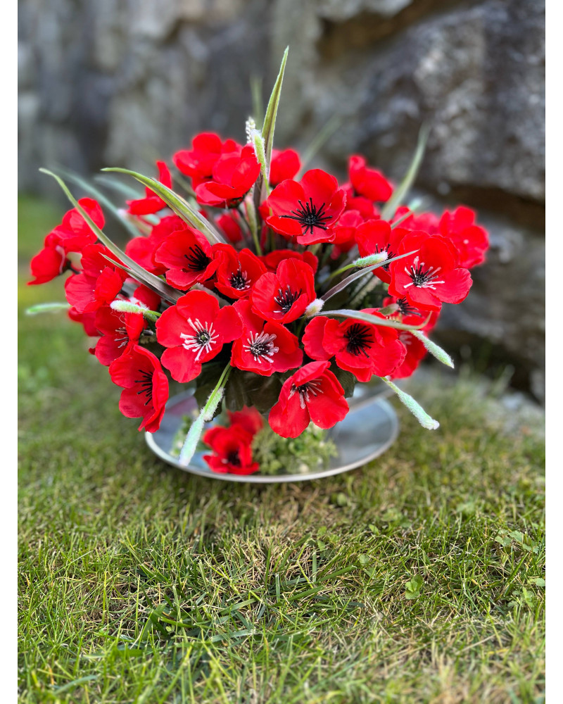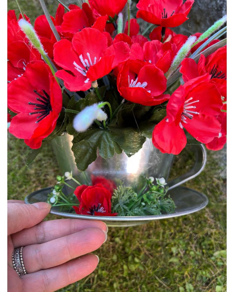 Kovová šálka plná makov, bohatá, spodok ikebanky je tiež dozdobený, vhodné aj ako darček.