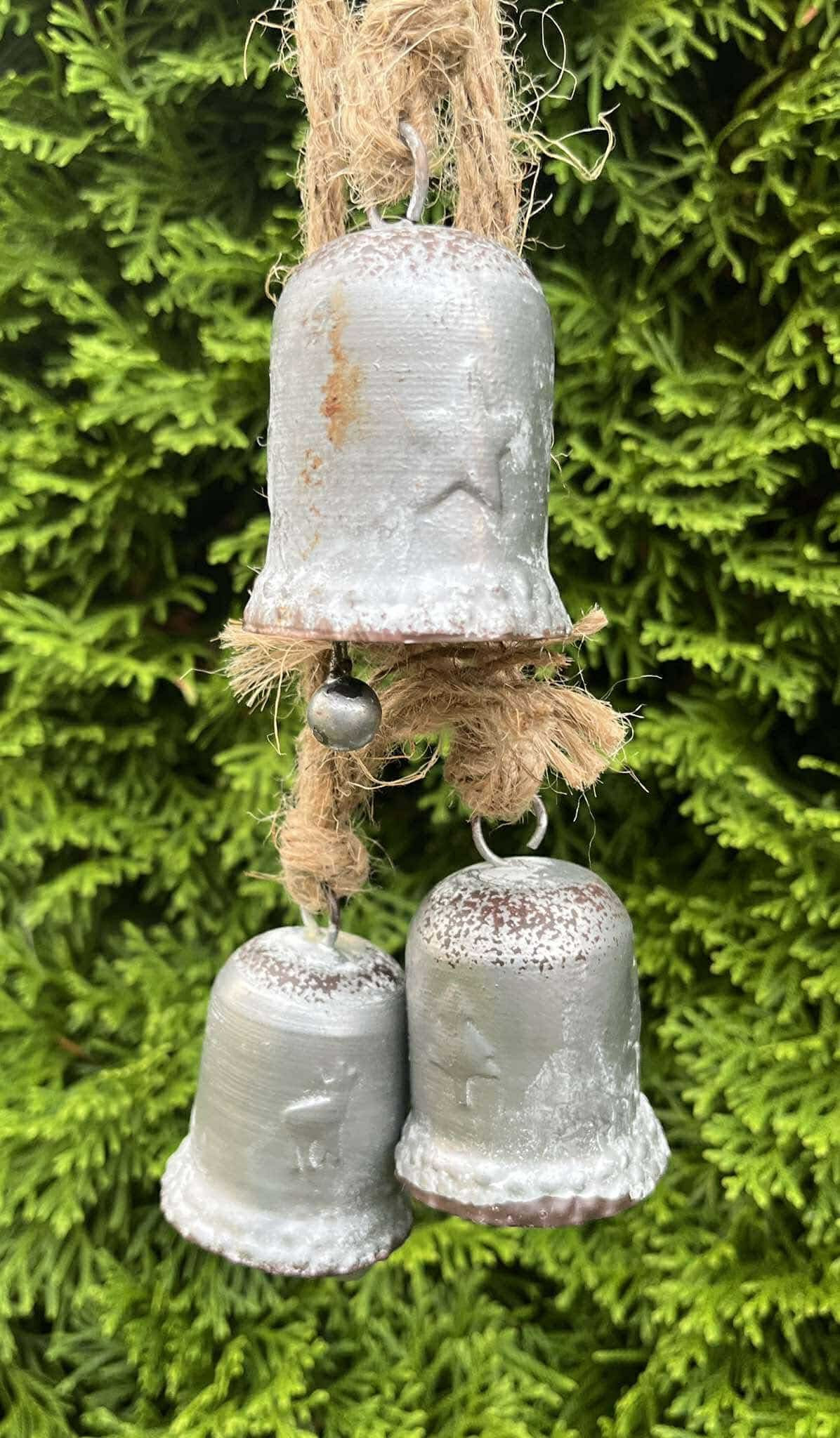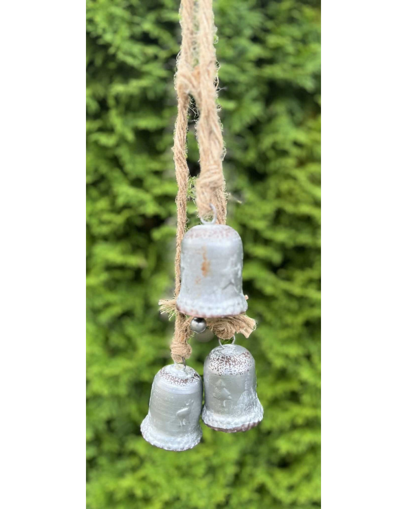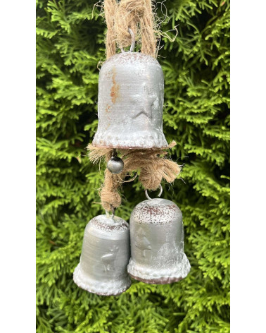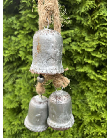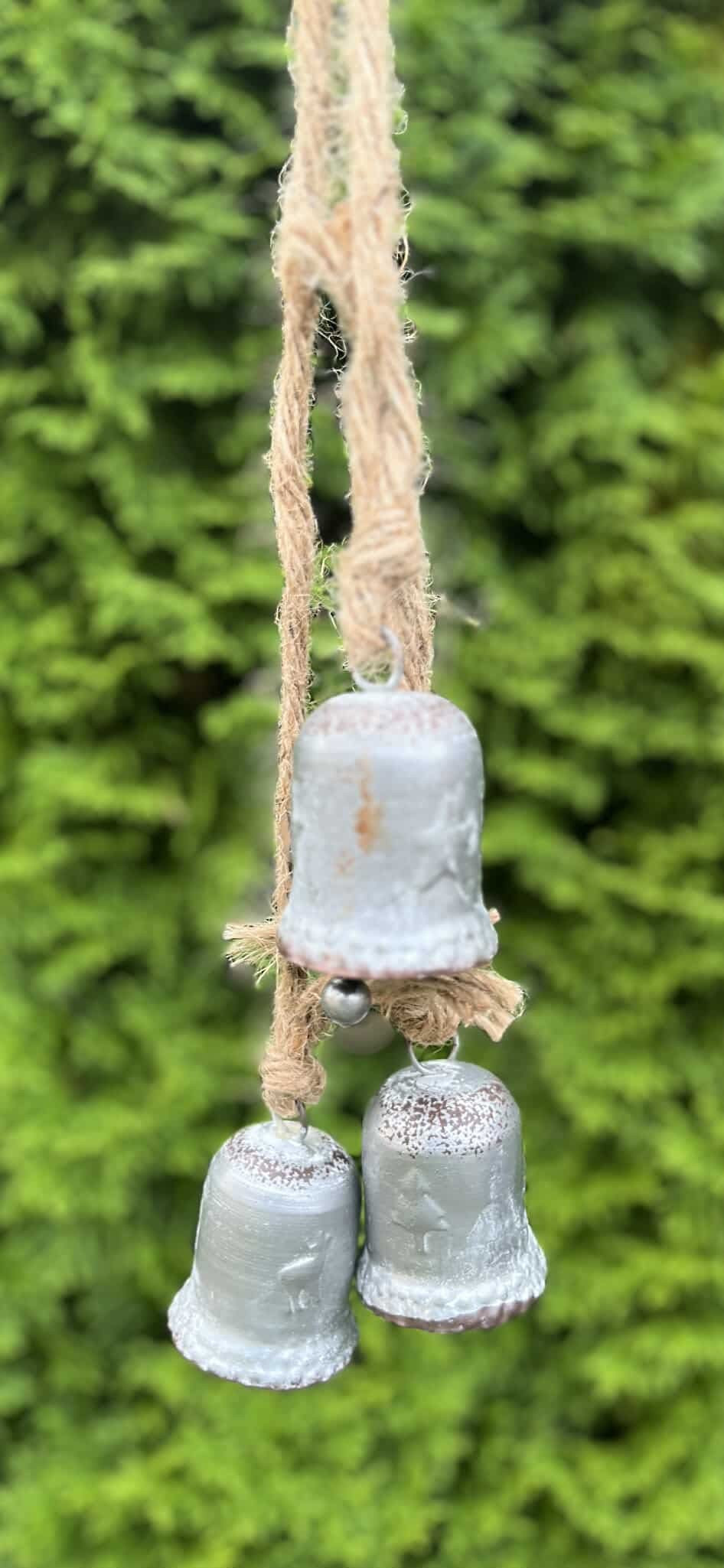 Krásne strieborné zvony vo vintage štýle, krásne zvonia, sú na jutovom špagáte.