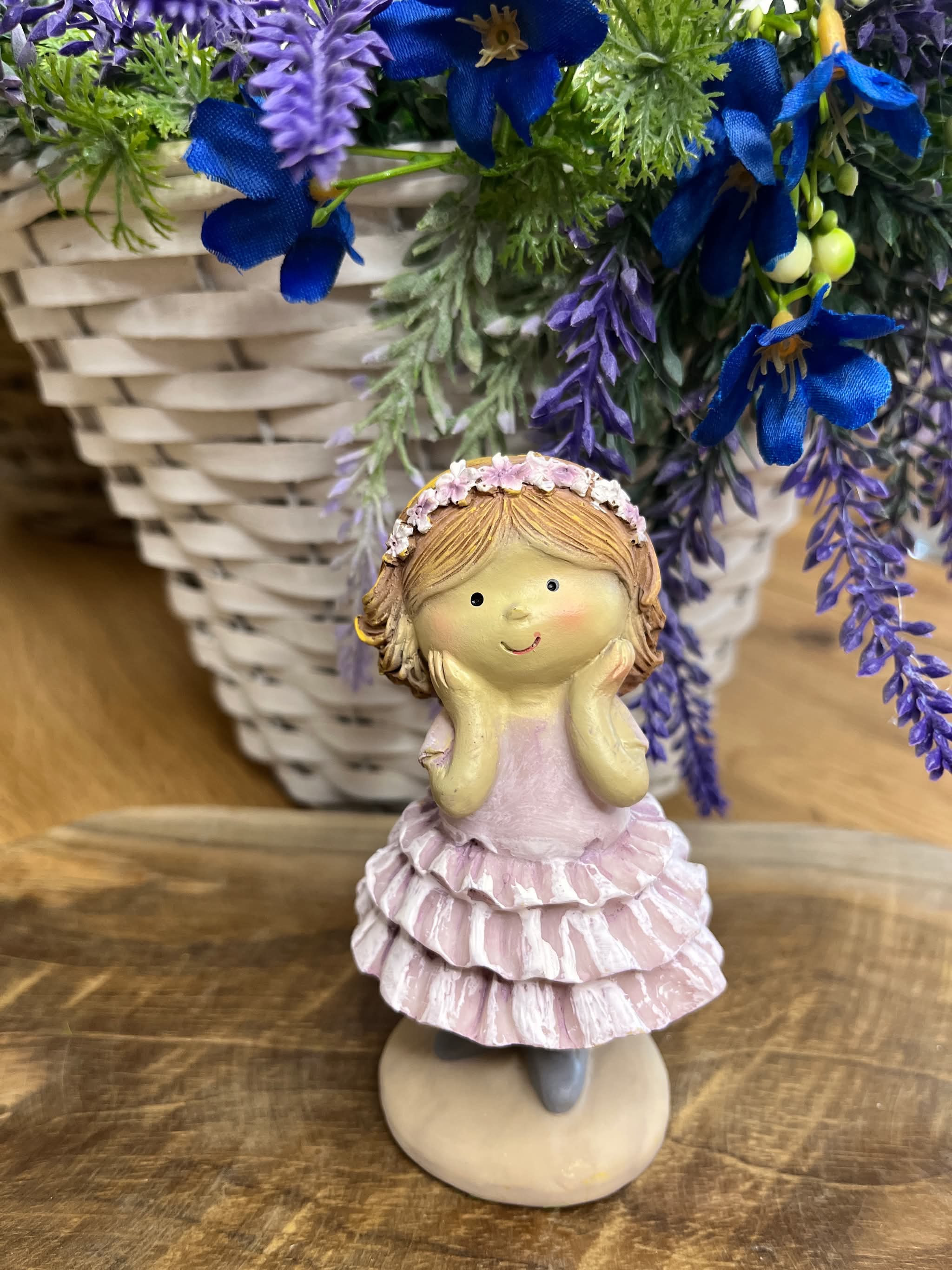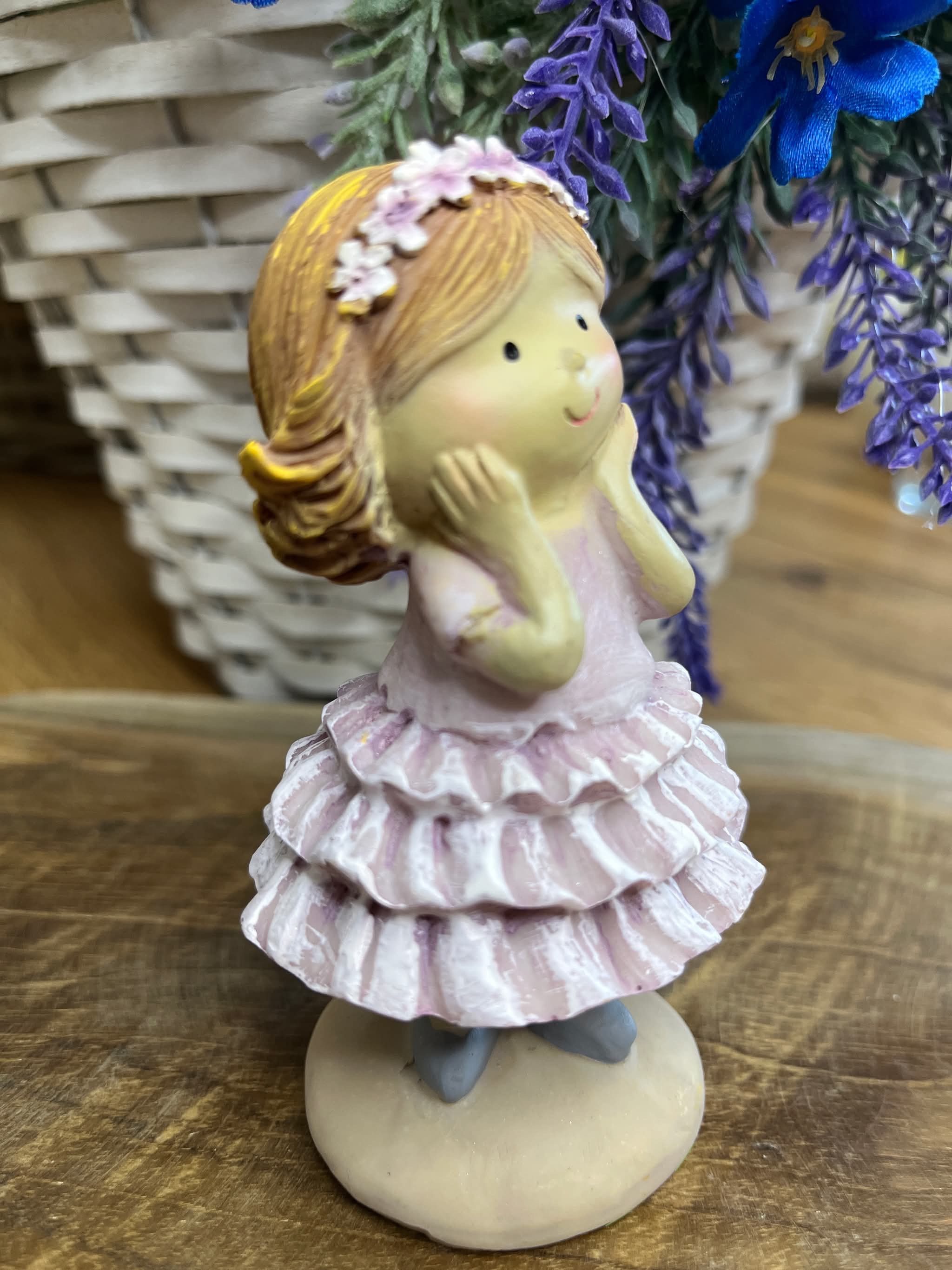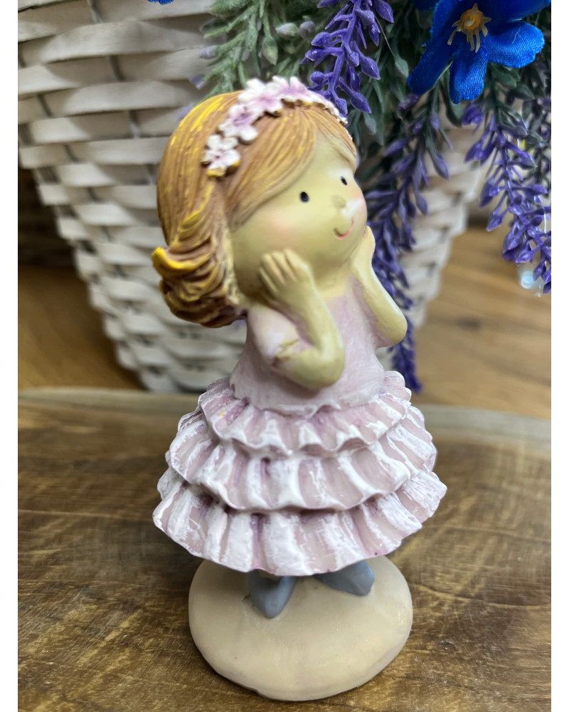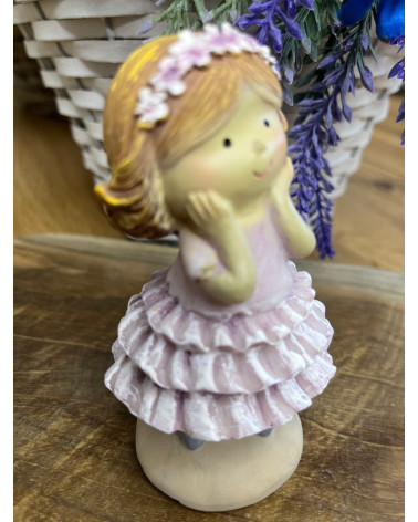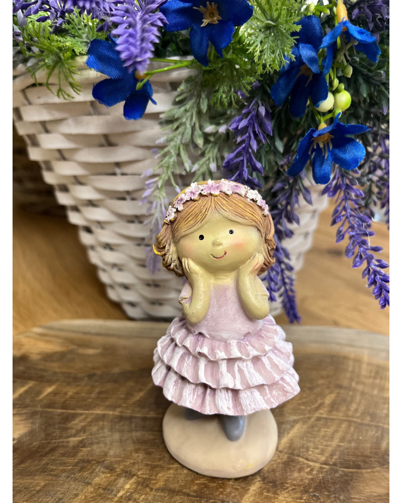 Dievčatko z polyrezinu v jemne fialových šatách so sukňou s volánmi, s čelenkou.