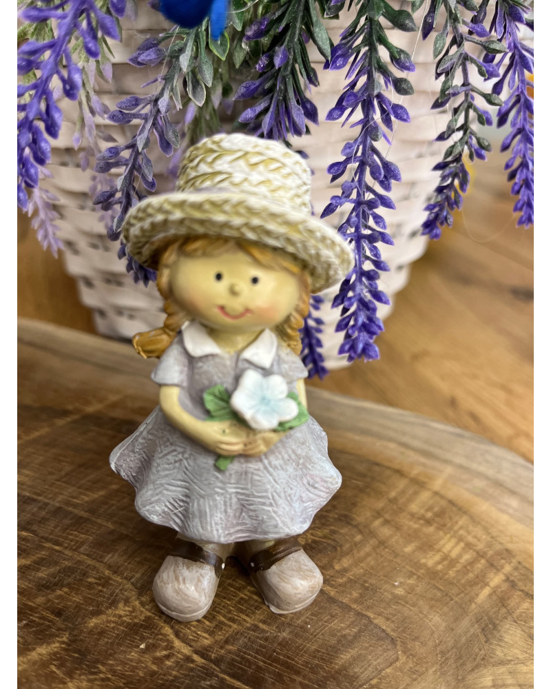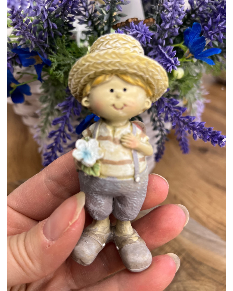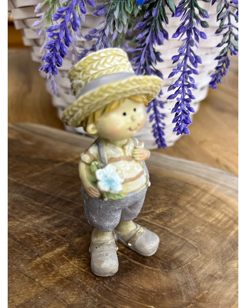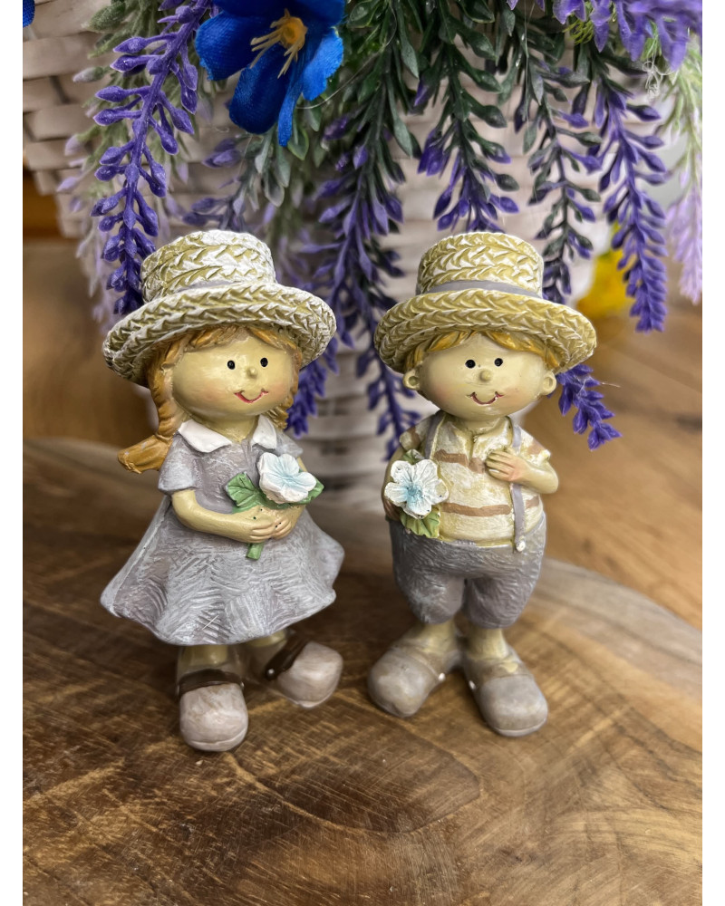 Párik chlapčeka a dievčatka v slamenných klobúkoch z polyrezinu v jemných provensálskych farbách.