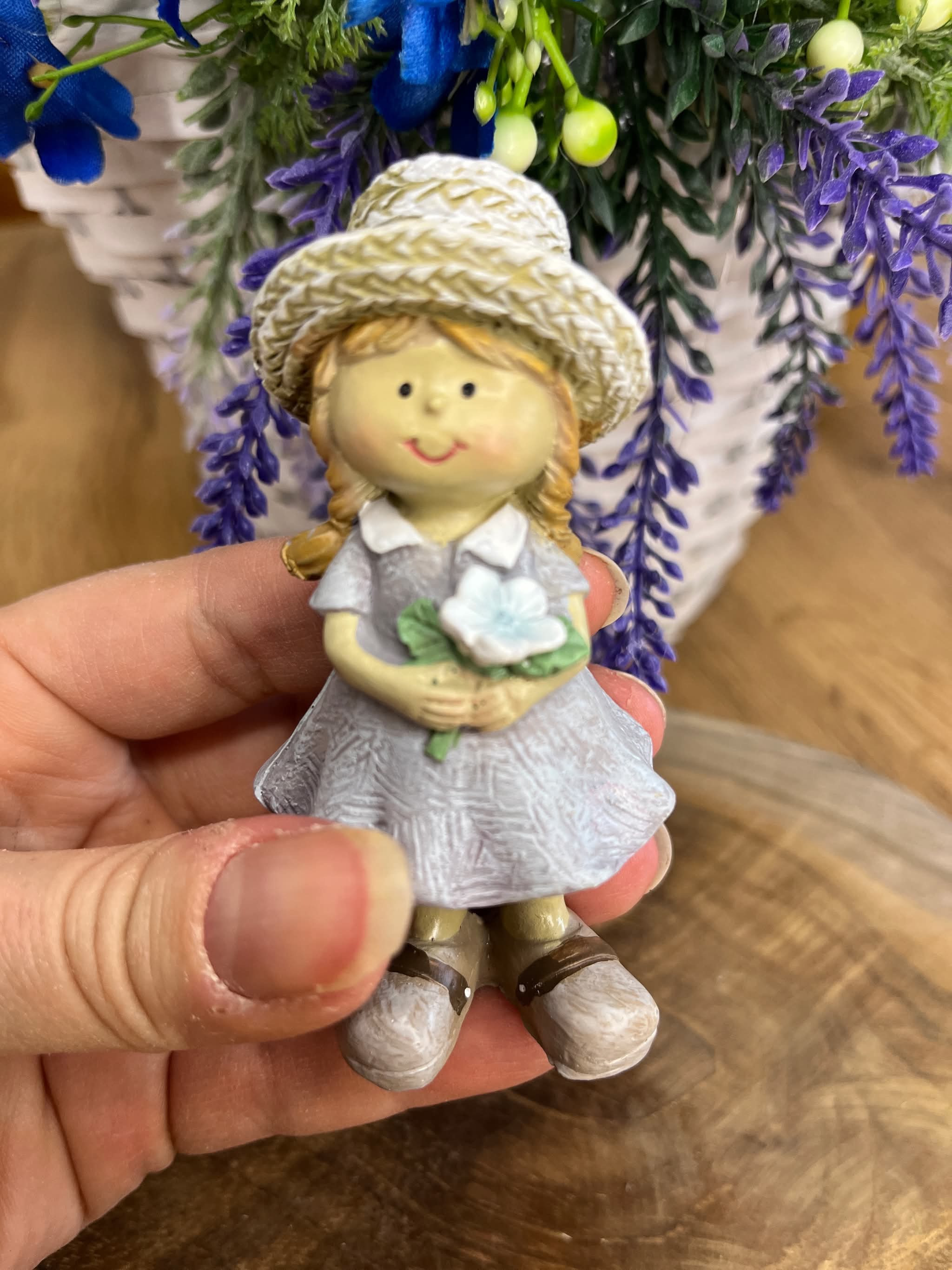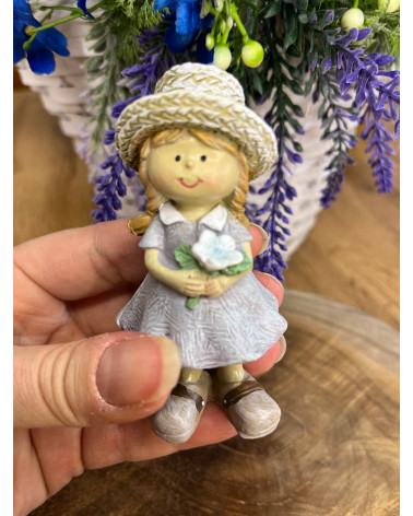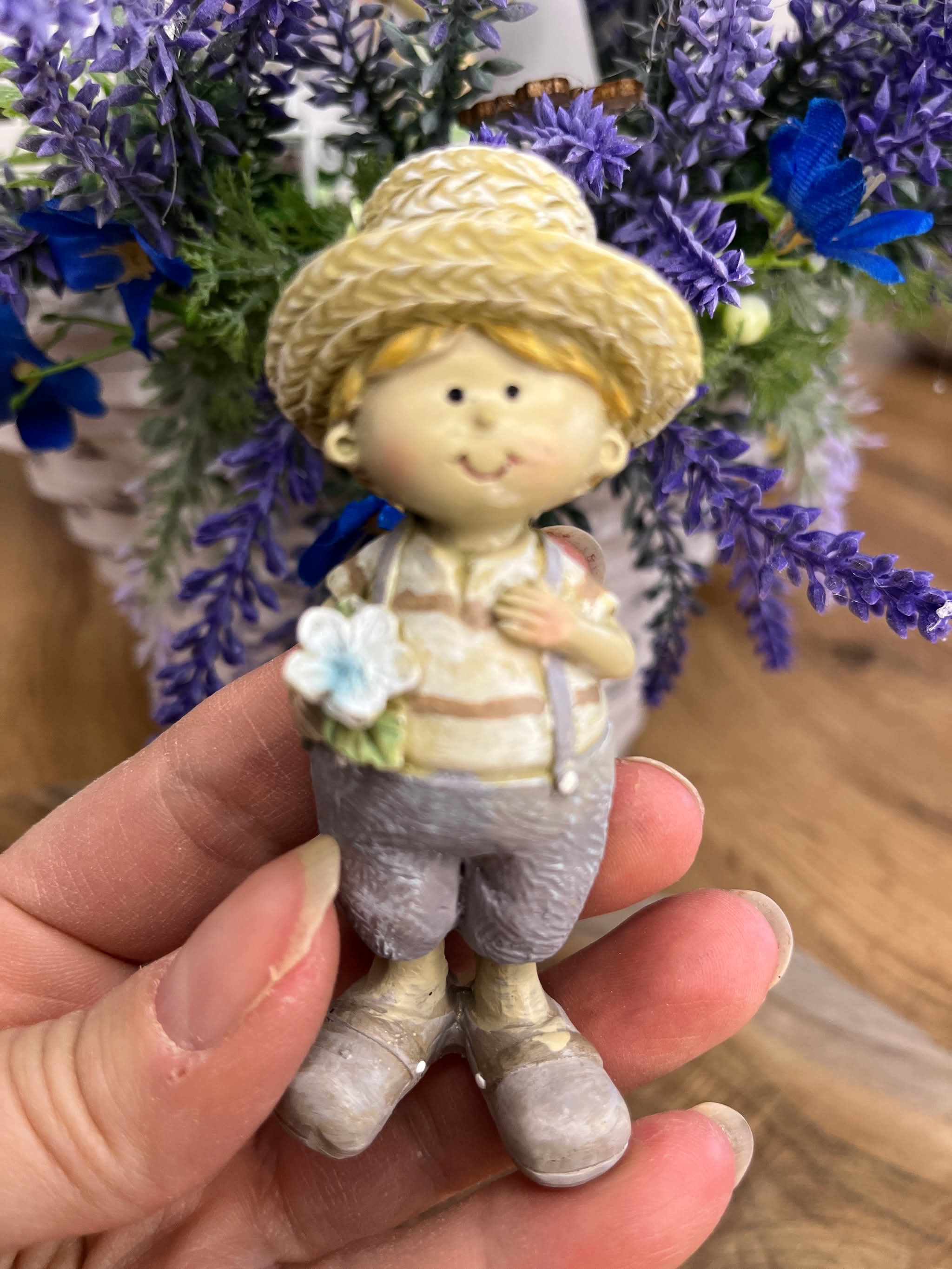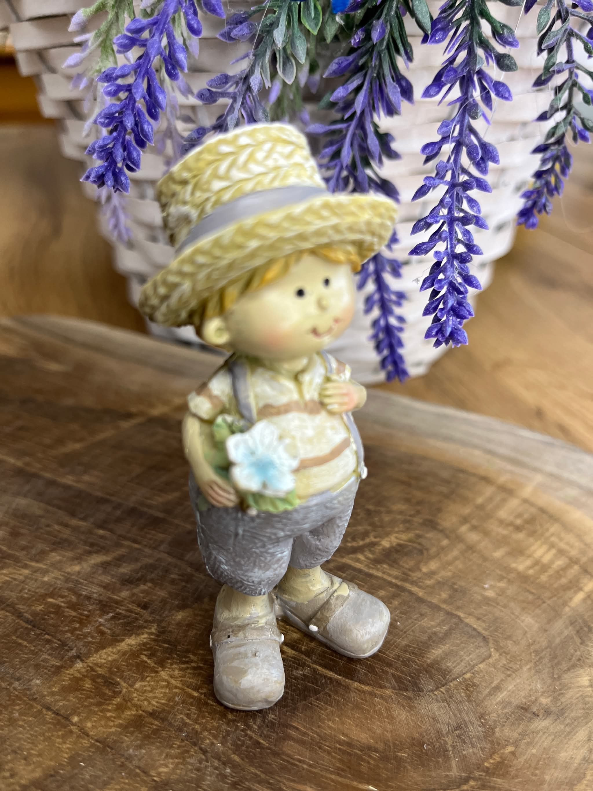 Párik chlapčeka a dievčatka v slamenných klobúkoch z polyrezinu v jemných provensálskych farbách.