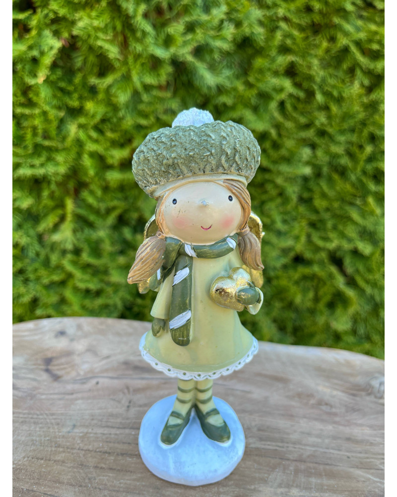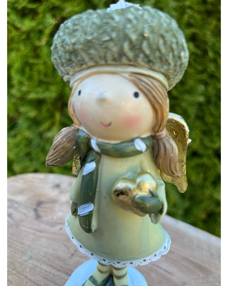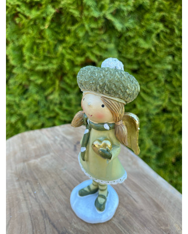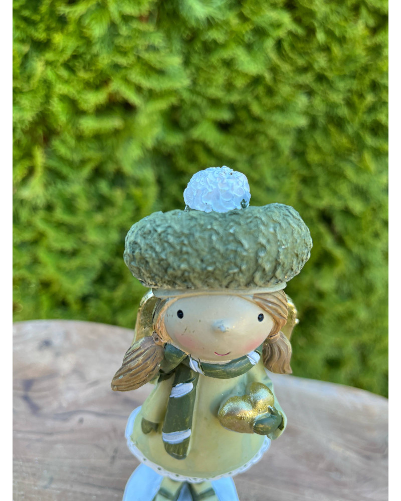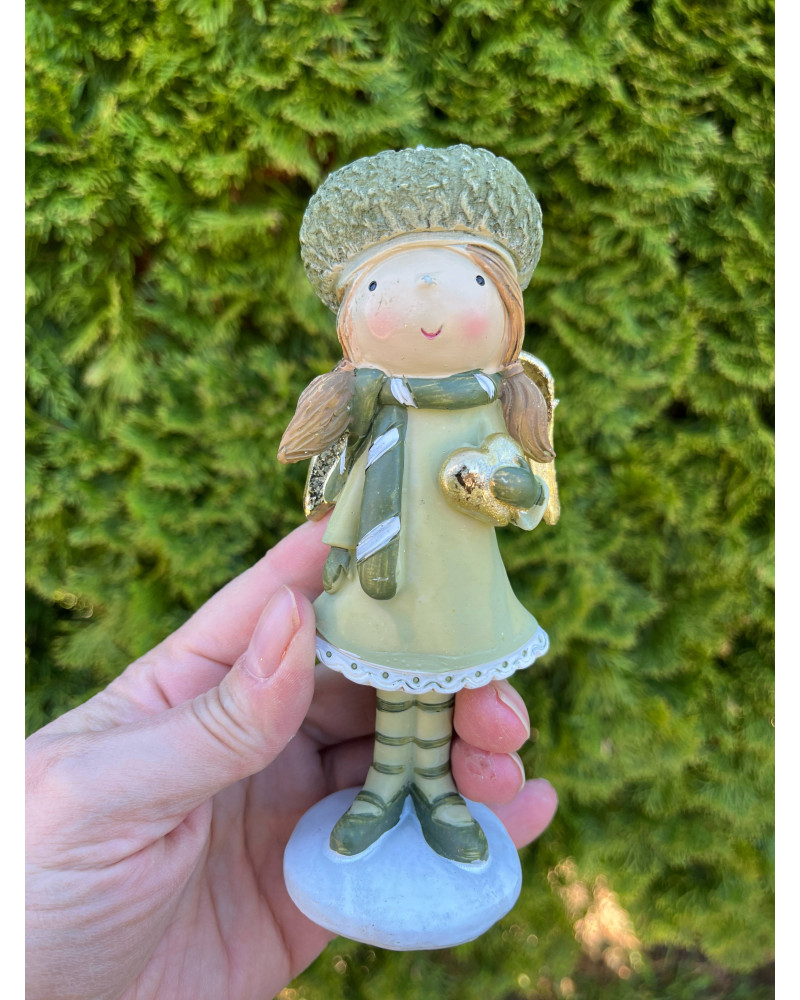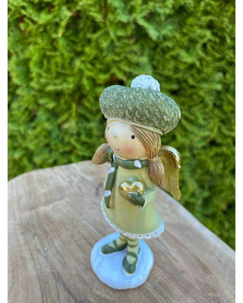 Anjelik z polyrezinu v príjemnej zelenej farbe v čiapke so zlatým srdiečkom a zlatÿmi krídlami.