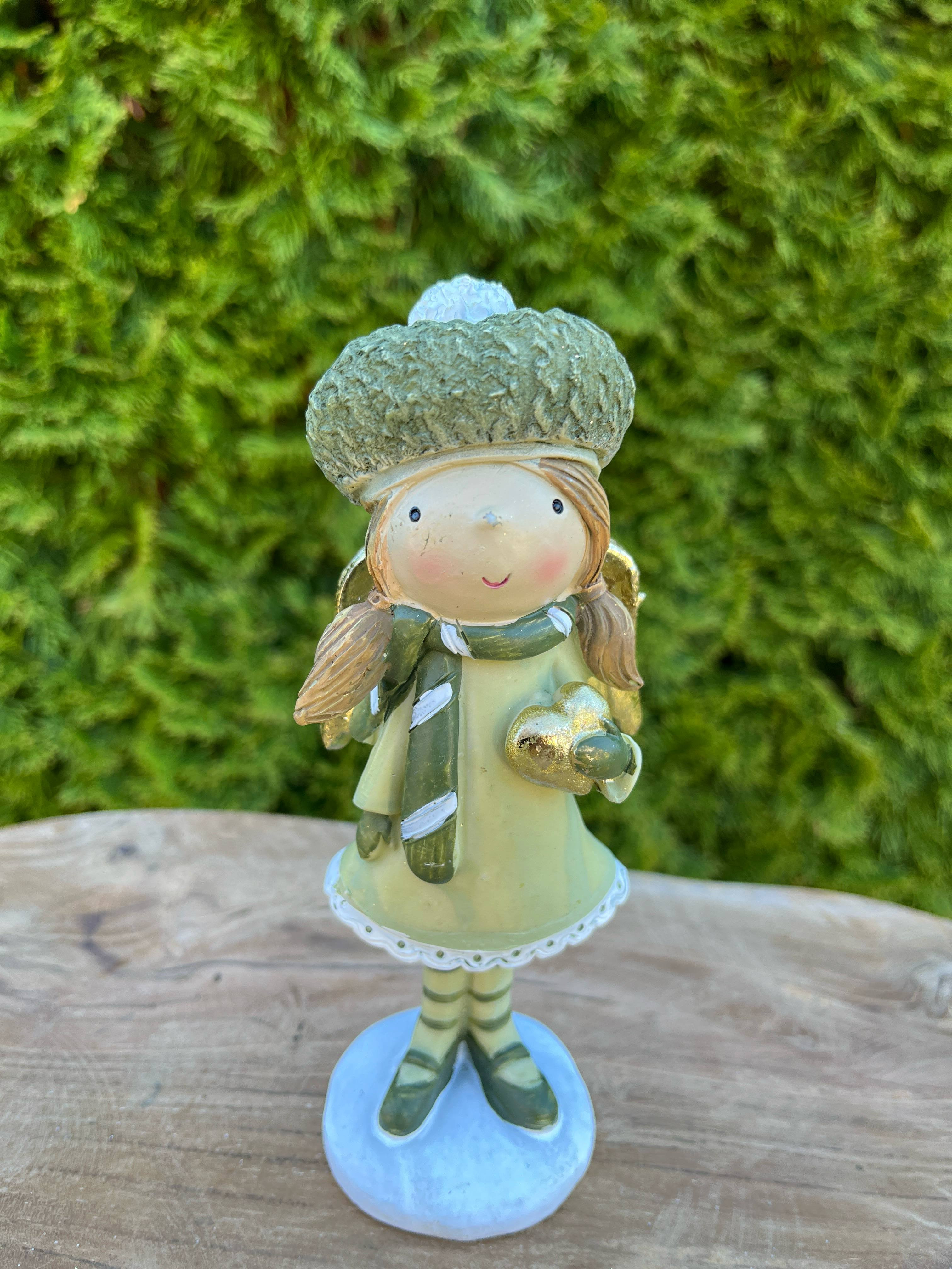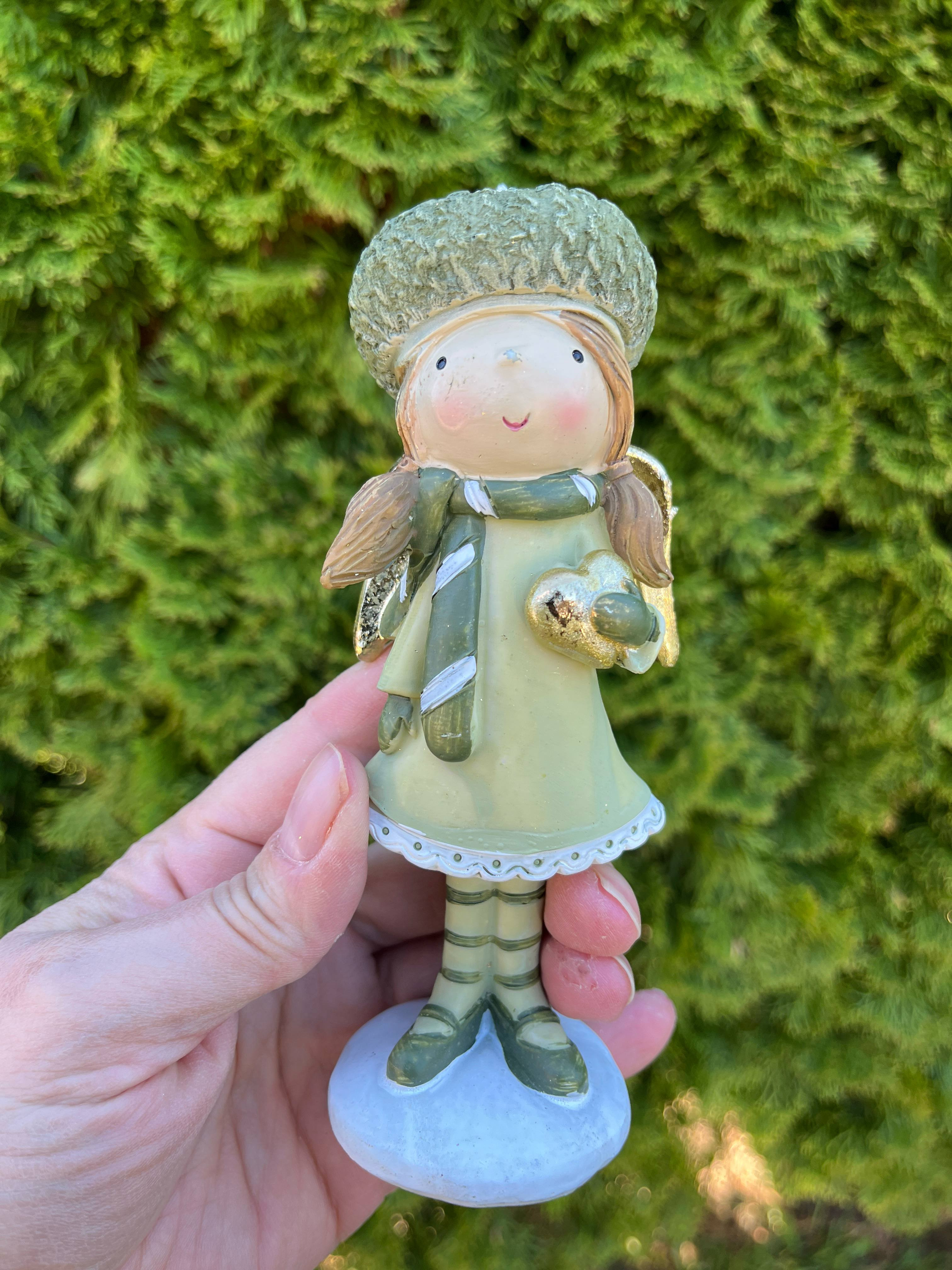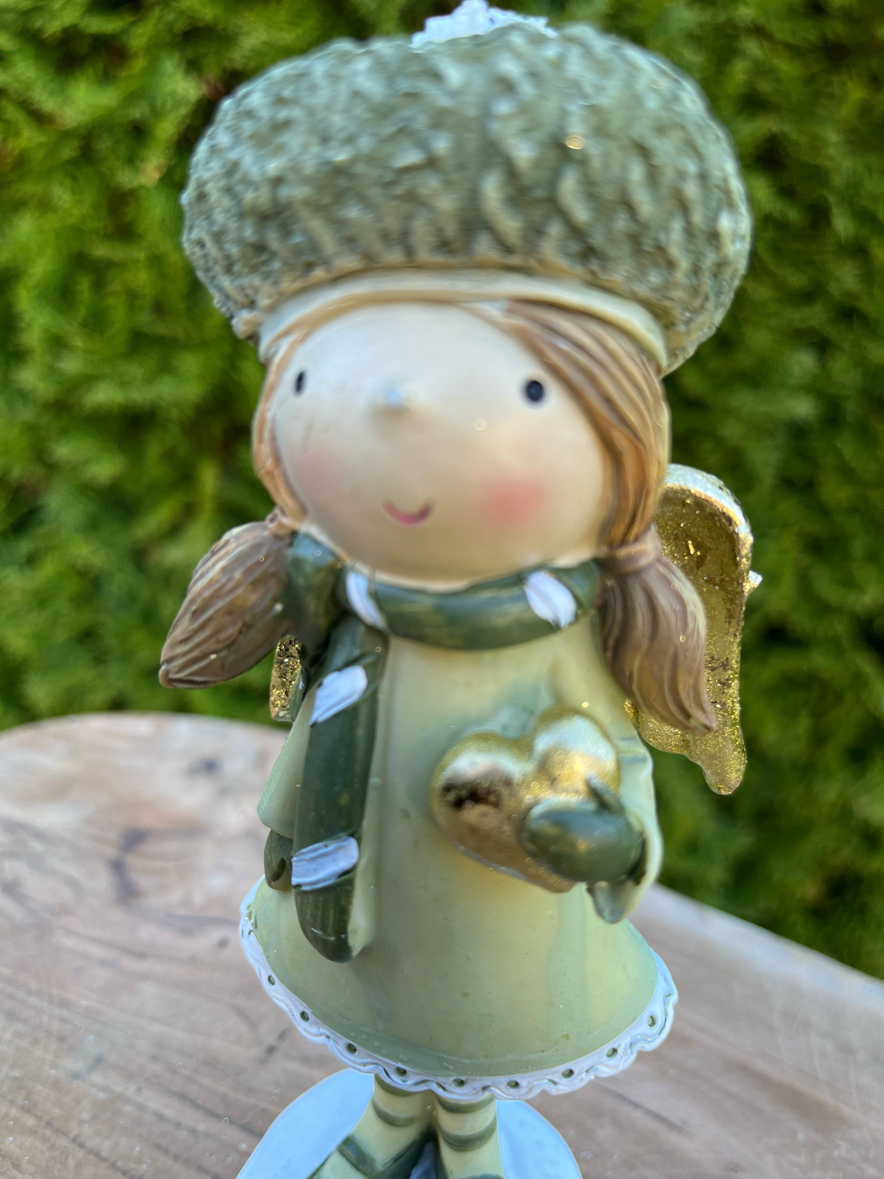 Anjelik z polyrezinu v príjemnej zelenej farbe v čiapke so zlatým srdiečkom a zlatÿmi krídlami.