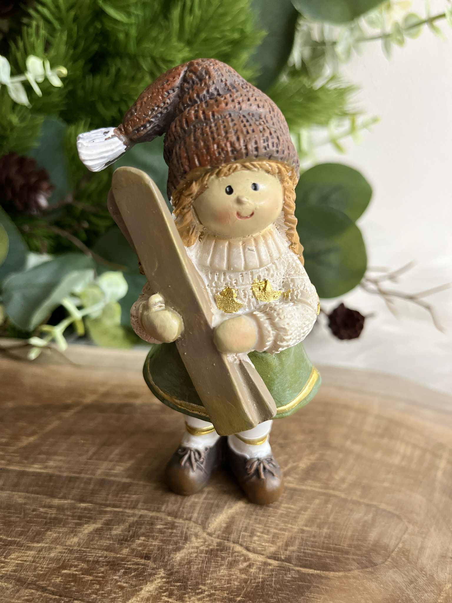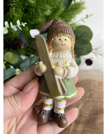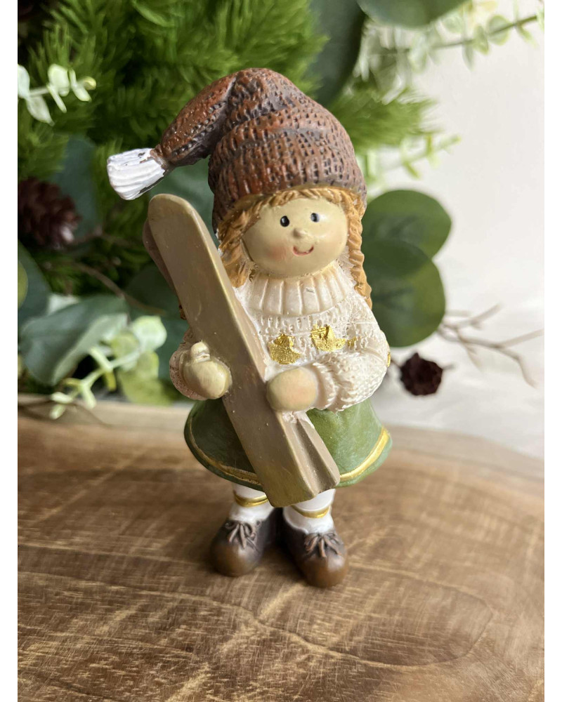 Dievčatko v zelenej sukni v hnedej čiapke. Dá sa k nemu priobjednať aj lyžiar. Materiál: polyrezin.