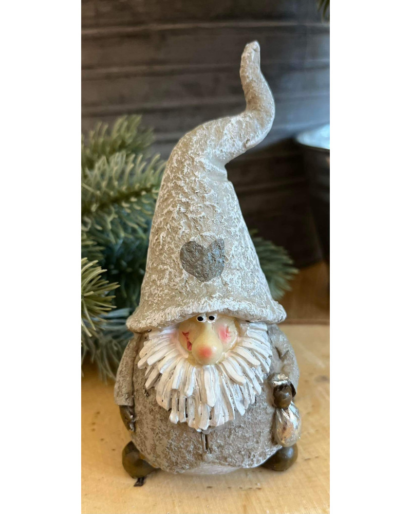 Sivý škriatok v rozkošnej čiapke so strieborným batôžkom v ruke.