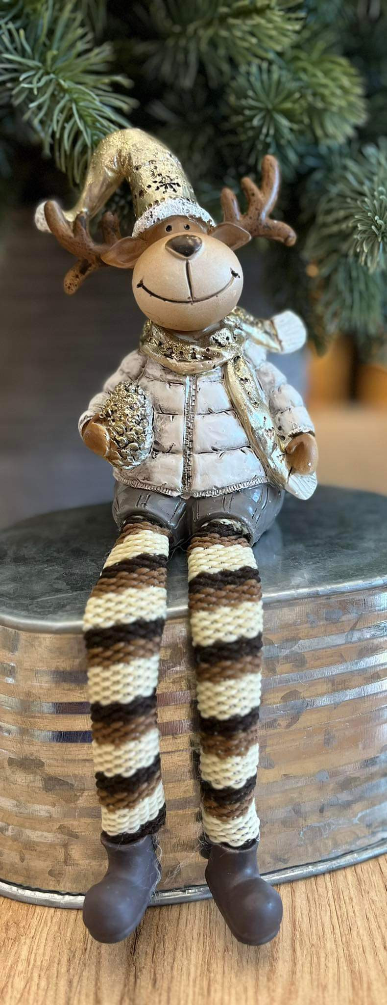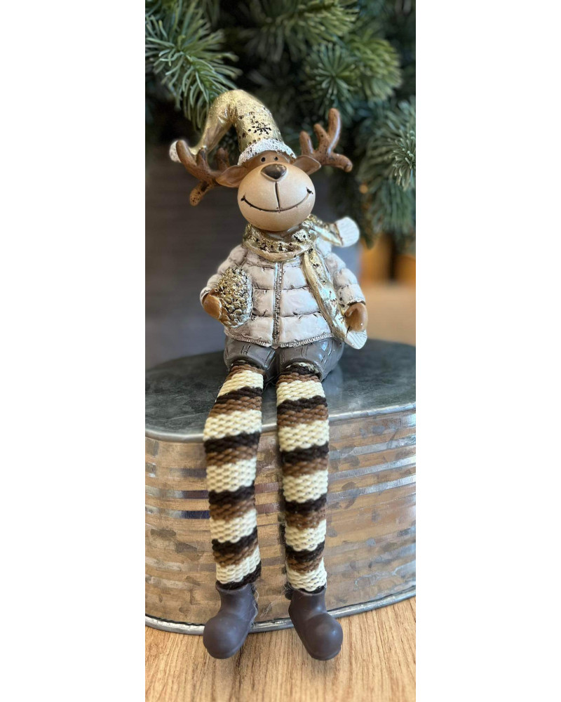 Nádherný sediaci sob so zlatou šiškou v čiapke a v šáliku, nohy má štrikované. Do páriku sa dá doobjednať sob