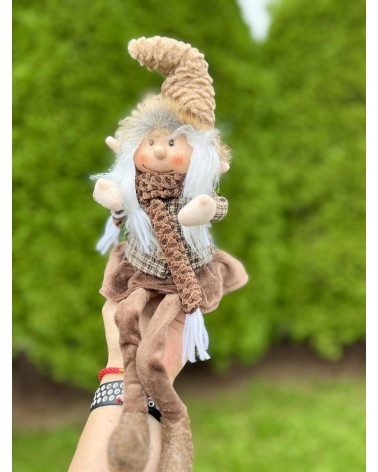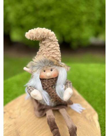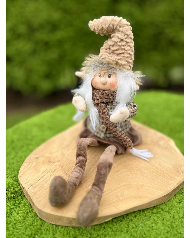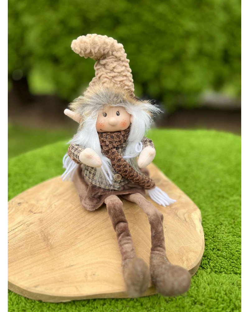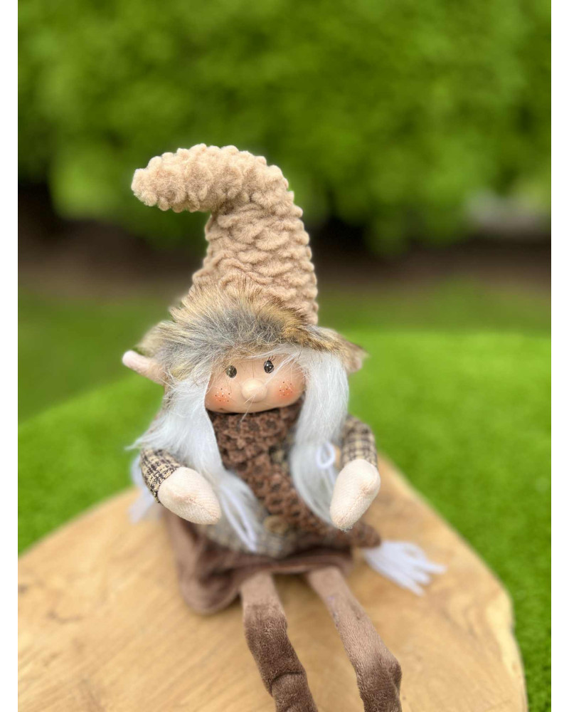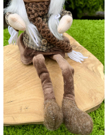 Nádherný čokoládovo hnedý škriatok s visiacimi nohami, v ktorých je drôt, teda sa dajú ohnúť a upraviť podľa potreby. Škriatok má keramickú hlavičku.
