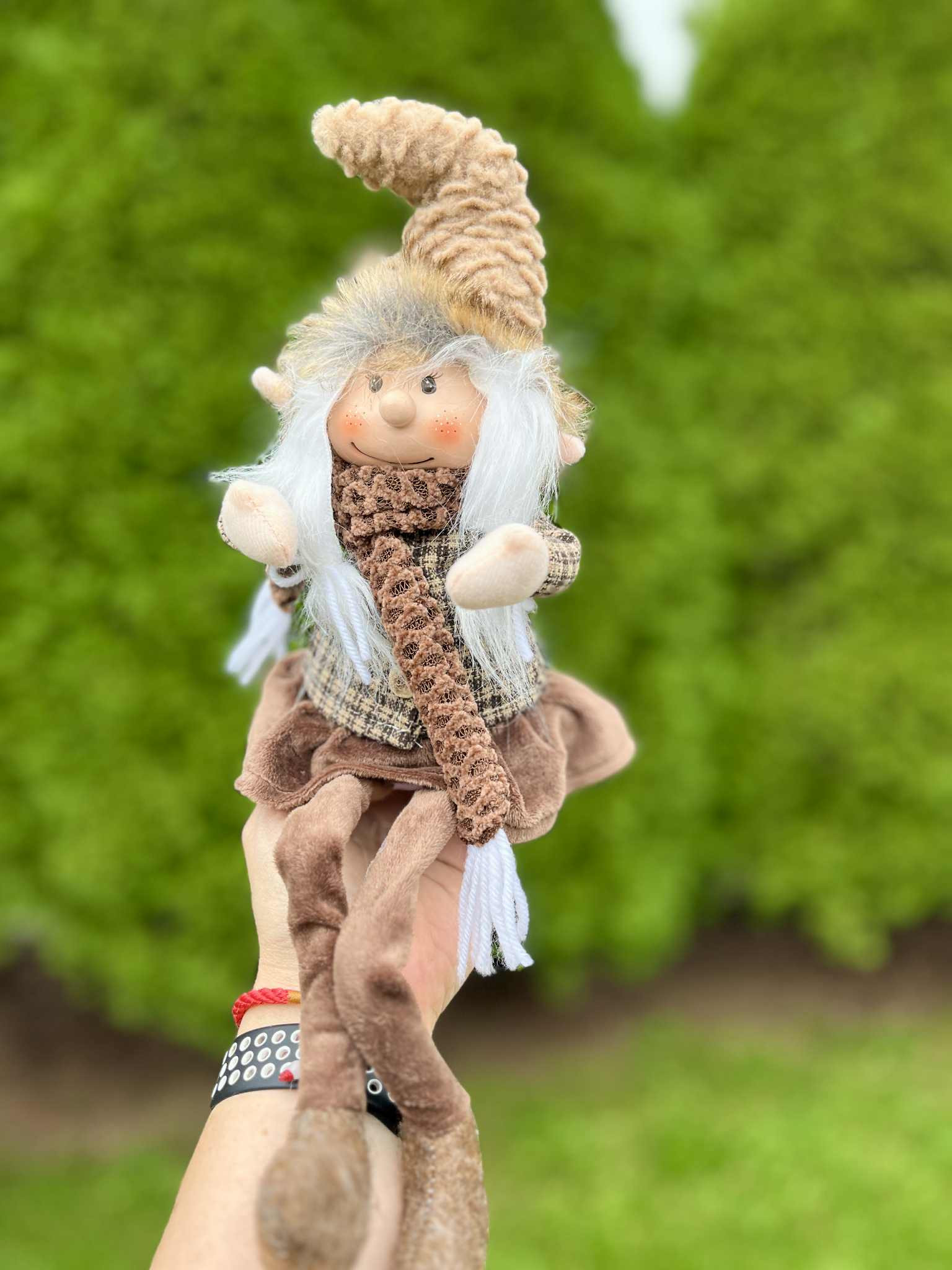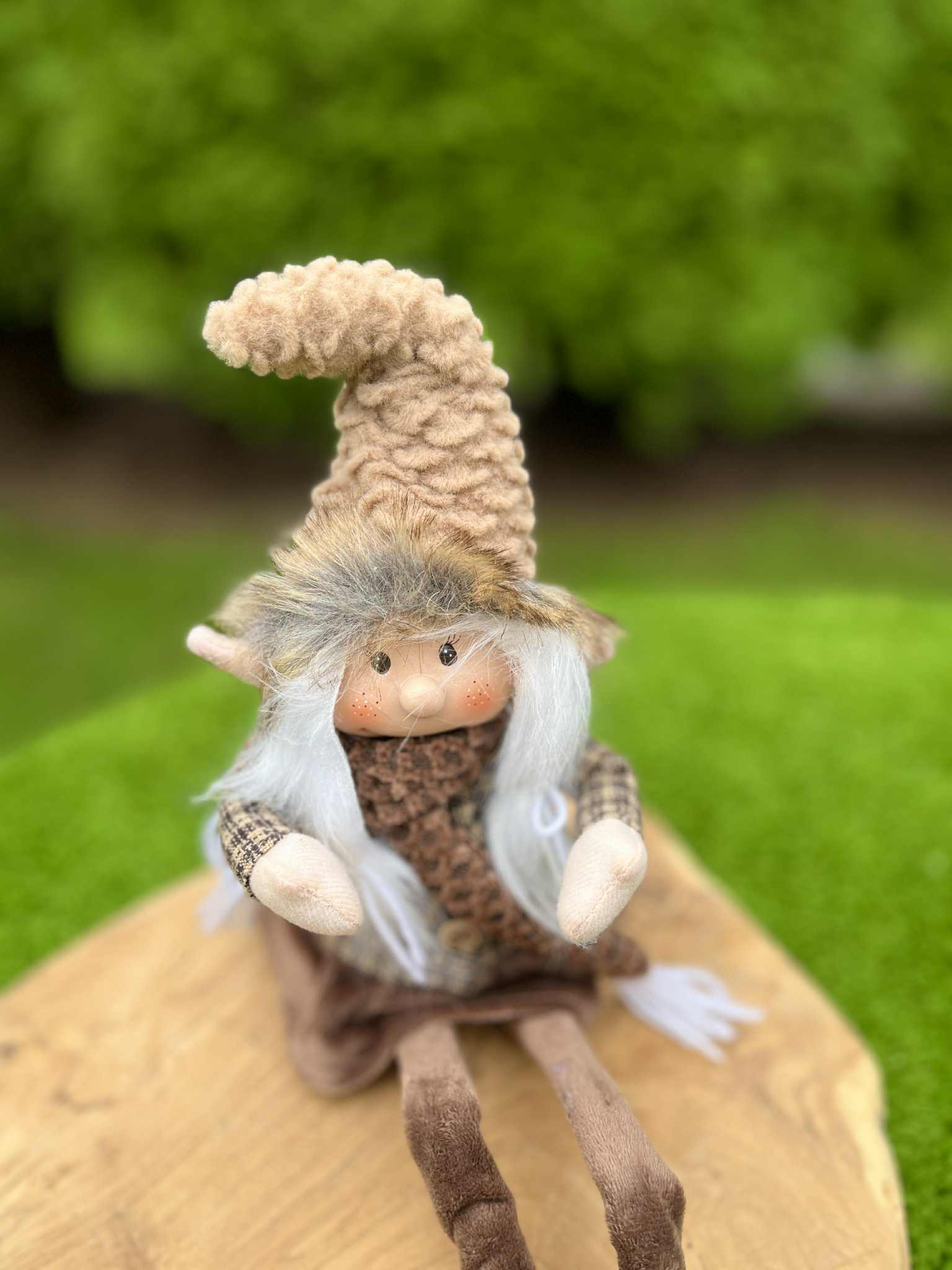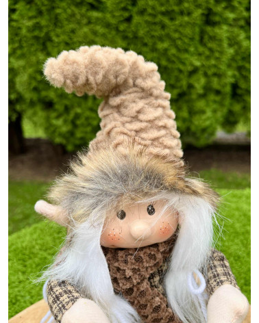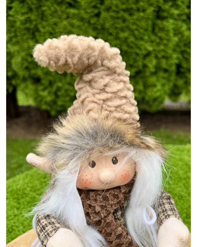 Nádherný čokoládovo hnedý škriatok s visiacimi nohami, v ktorých je drôt, teda sa dajú ohnúť a upraviť podľa potreby. Škriatok má keramickú hlavičku.