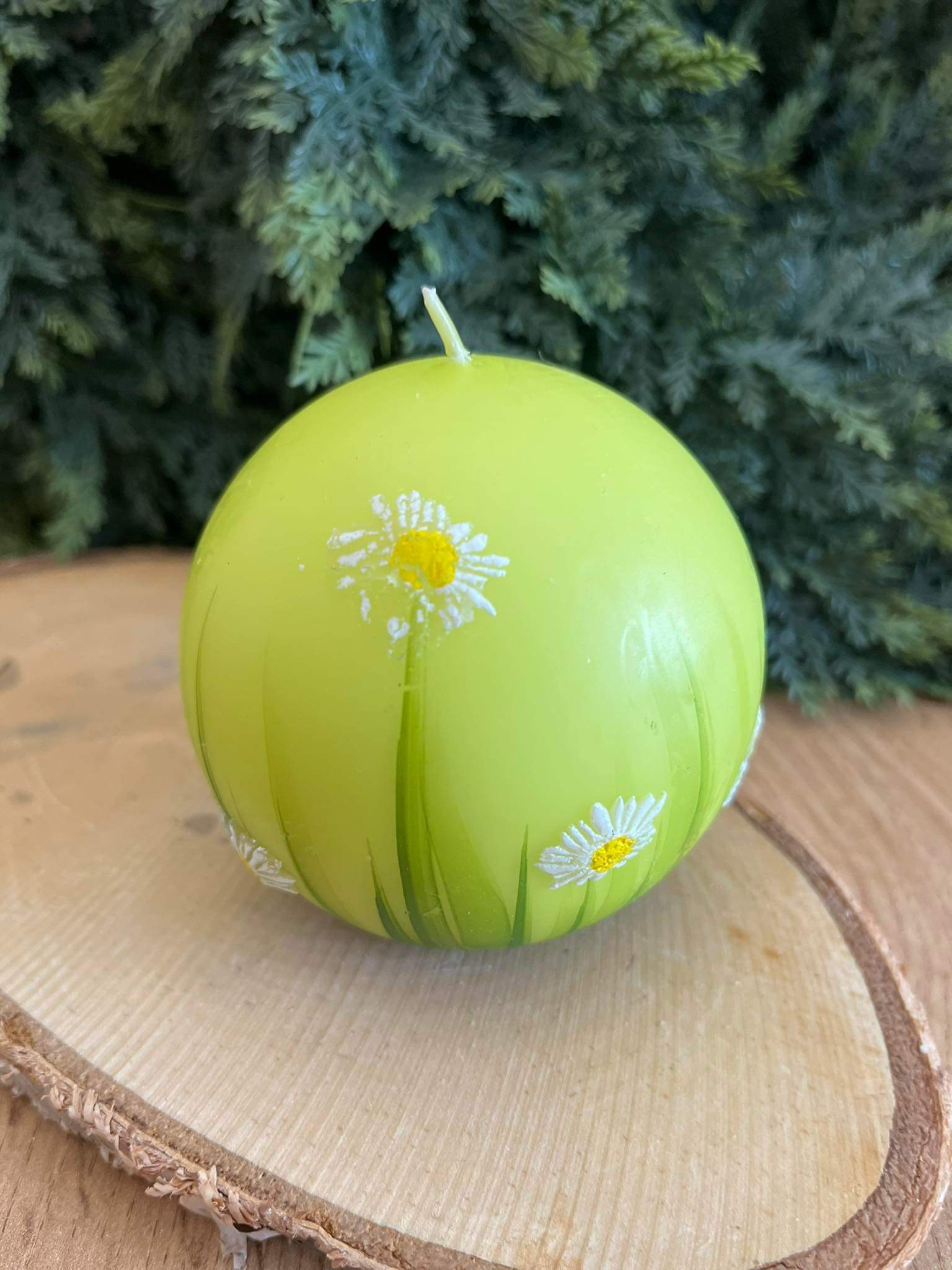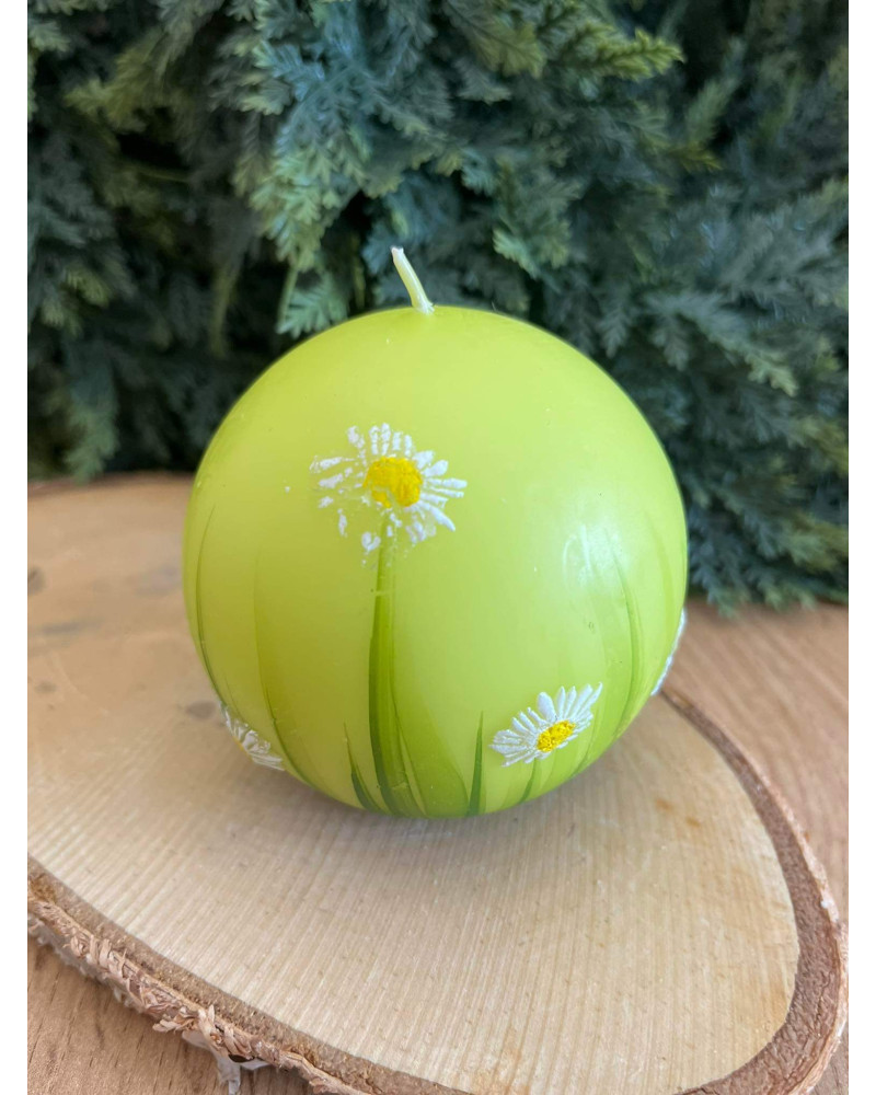 Sviečka v tvare gule, v jemnej zelenkavej farbe s bielymi margarétkami so žltými stredmi.