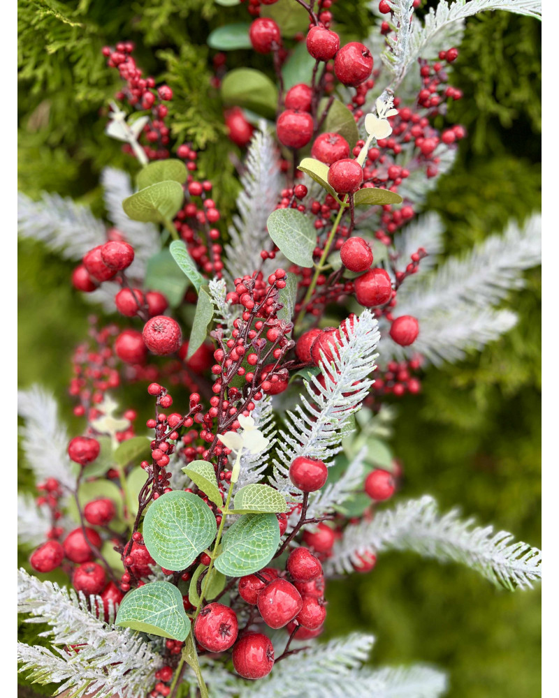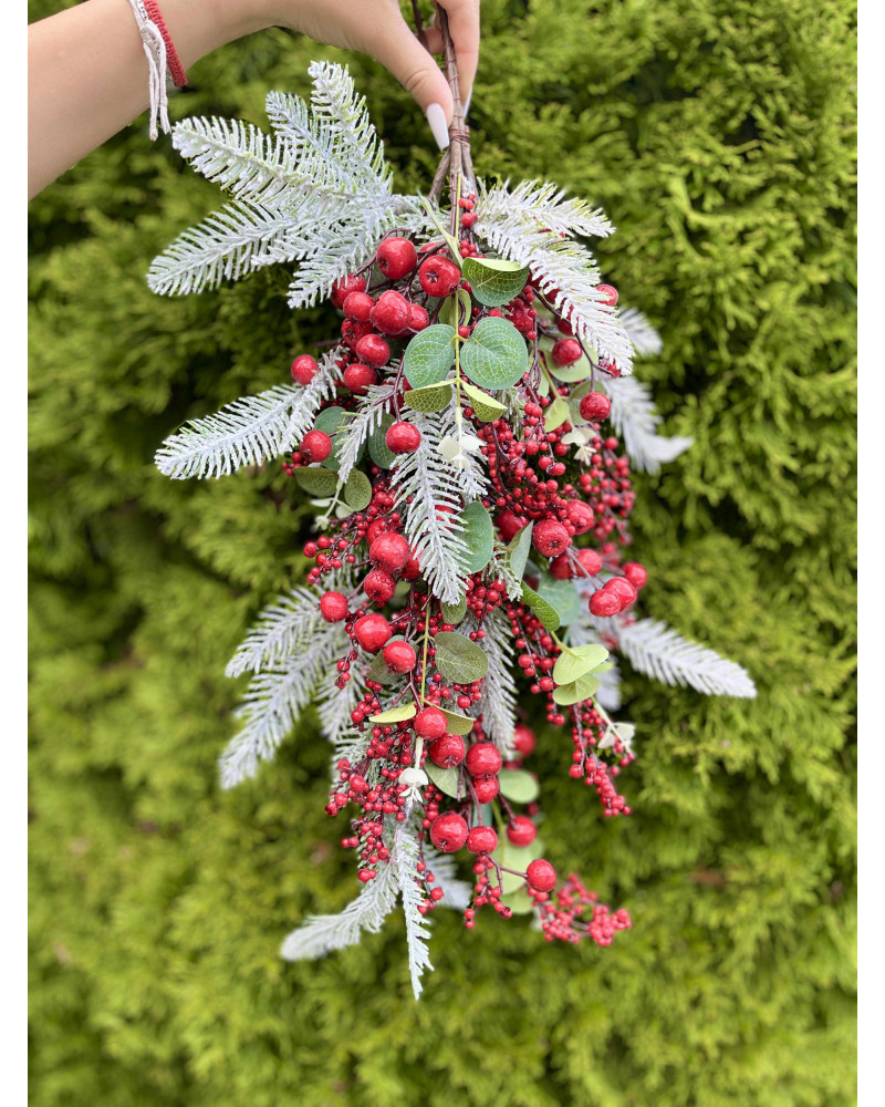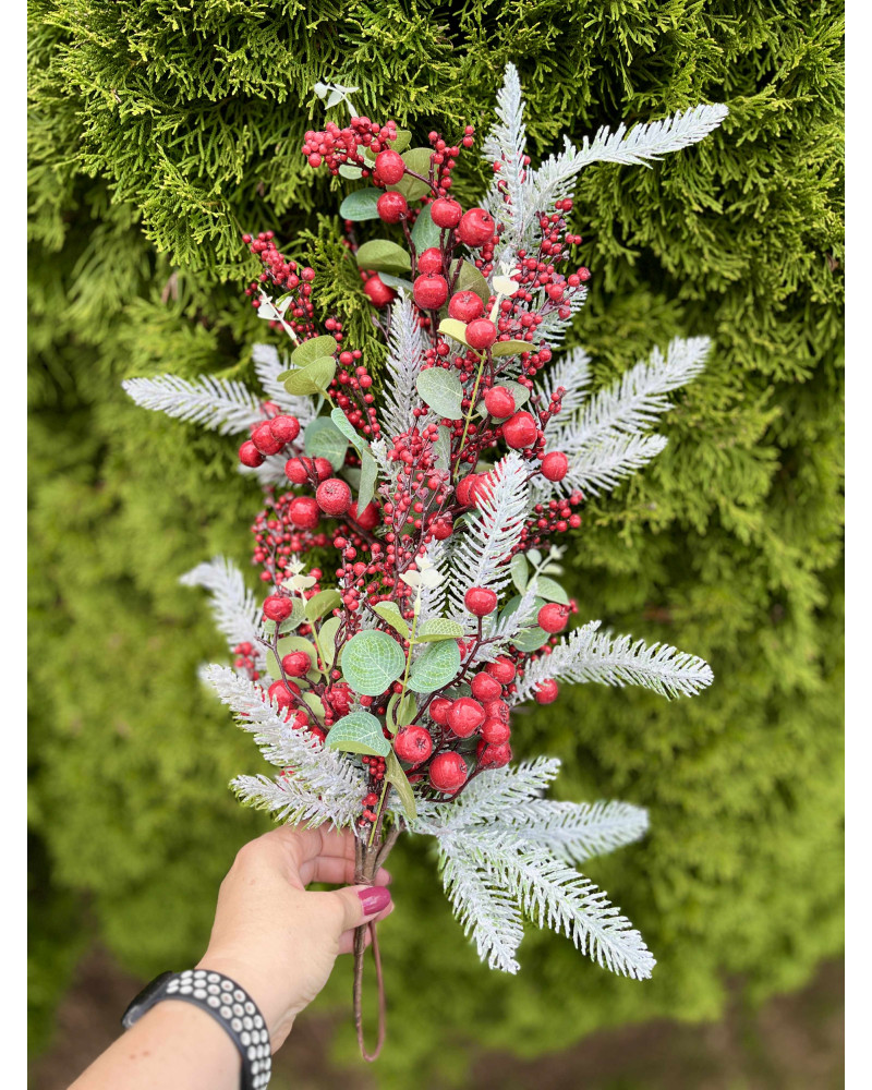 Nádherný trs zasneženej umelej čečiny s červenými bobuľkami, krásny aj do vázy, aj na zavesenie.