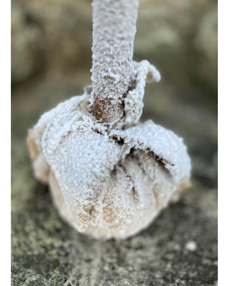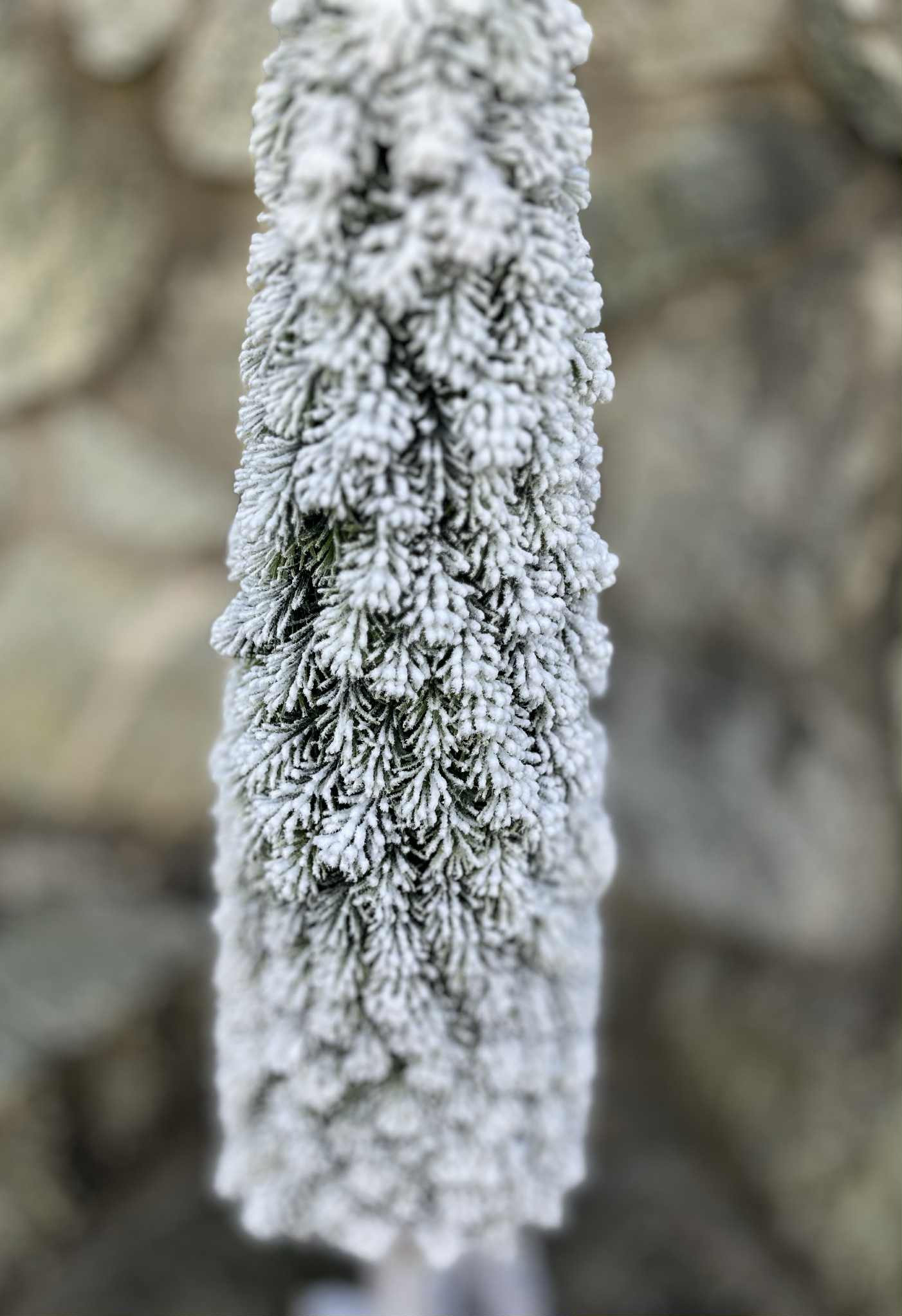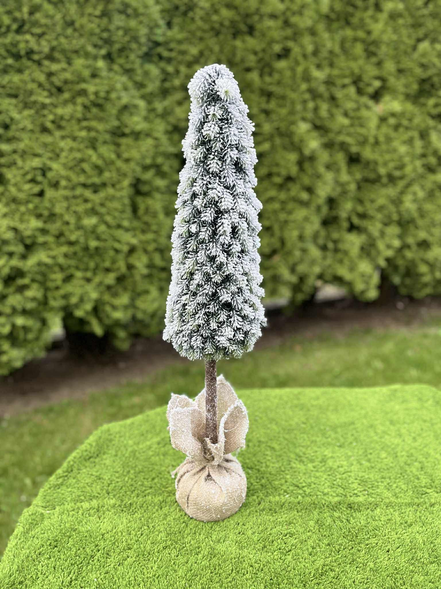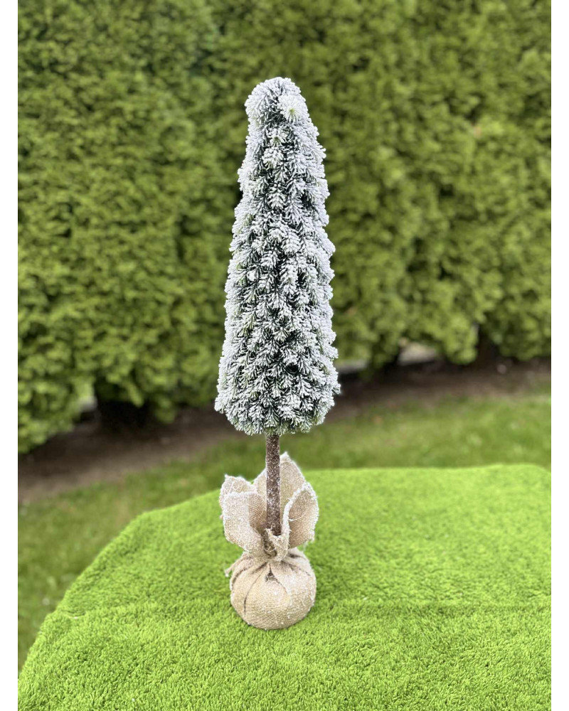 Štíhly zasnežený stromček v jutovom obale, veľmi vďačný aj do menších priestorov.