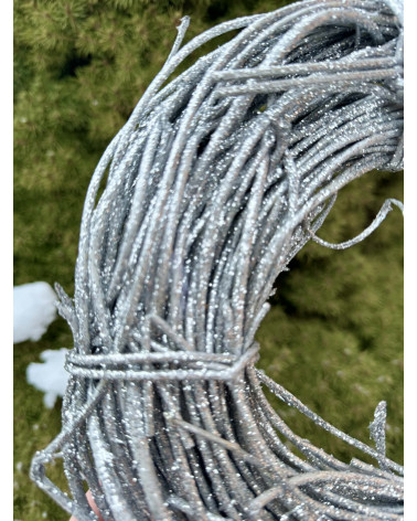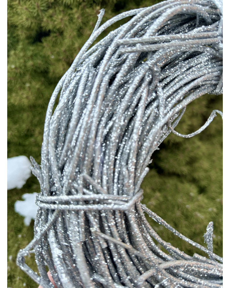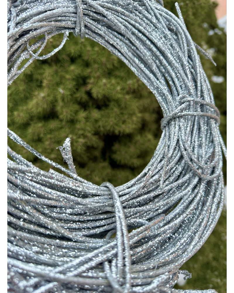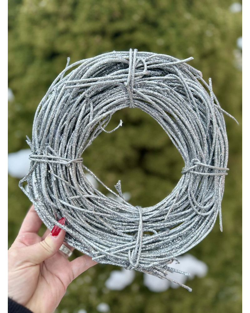 Veniec z prútia zo striebornou prudko ligotavou povrchovou úpravou, je nahrubo viazaný, ideálny na ďalšiu tvorbu.