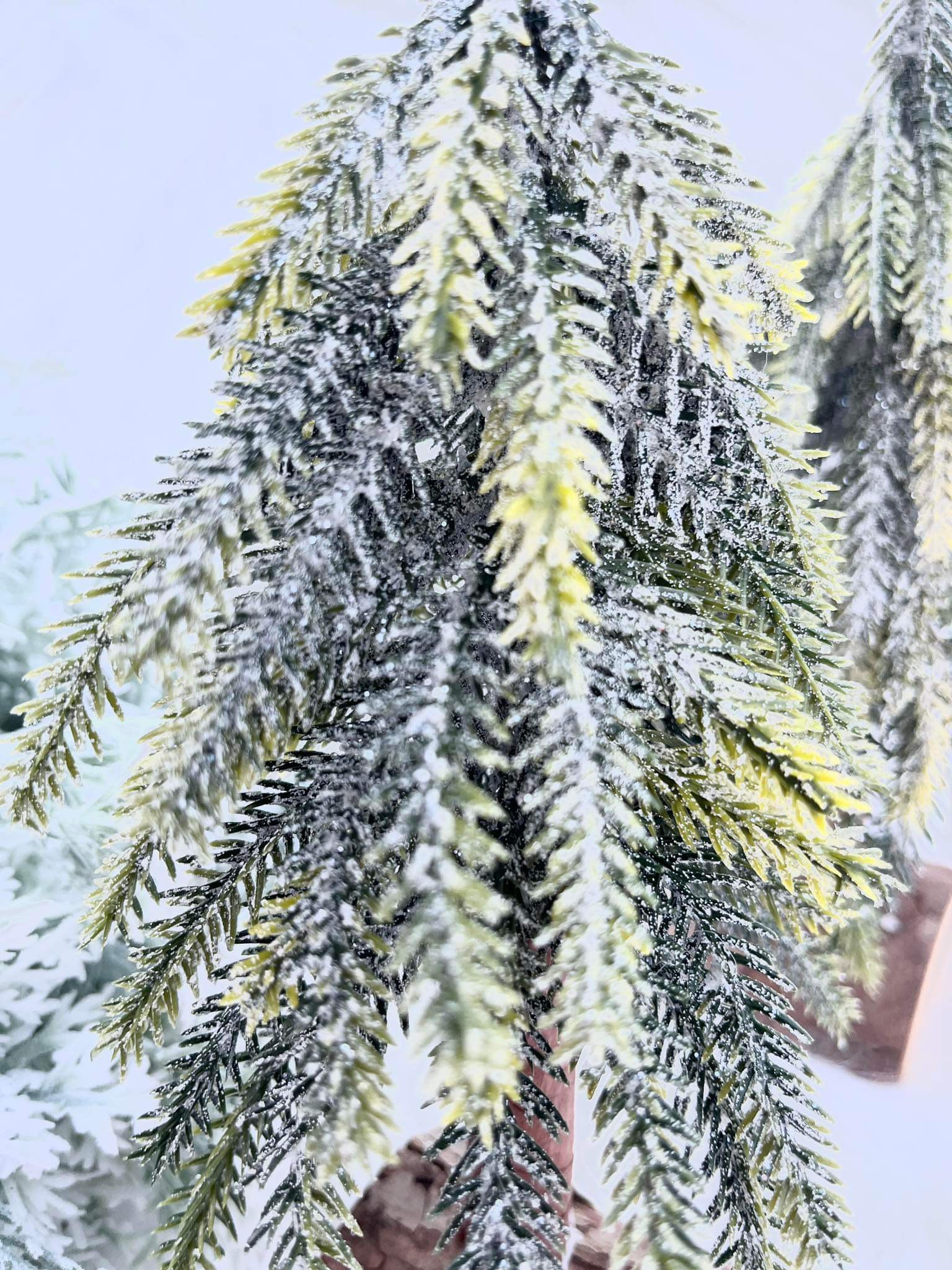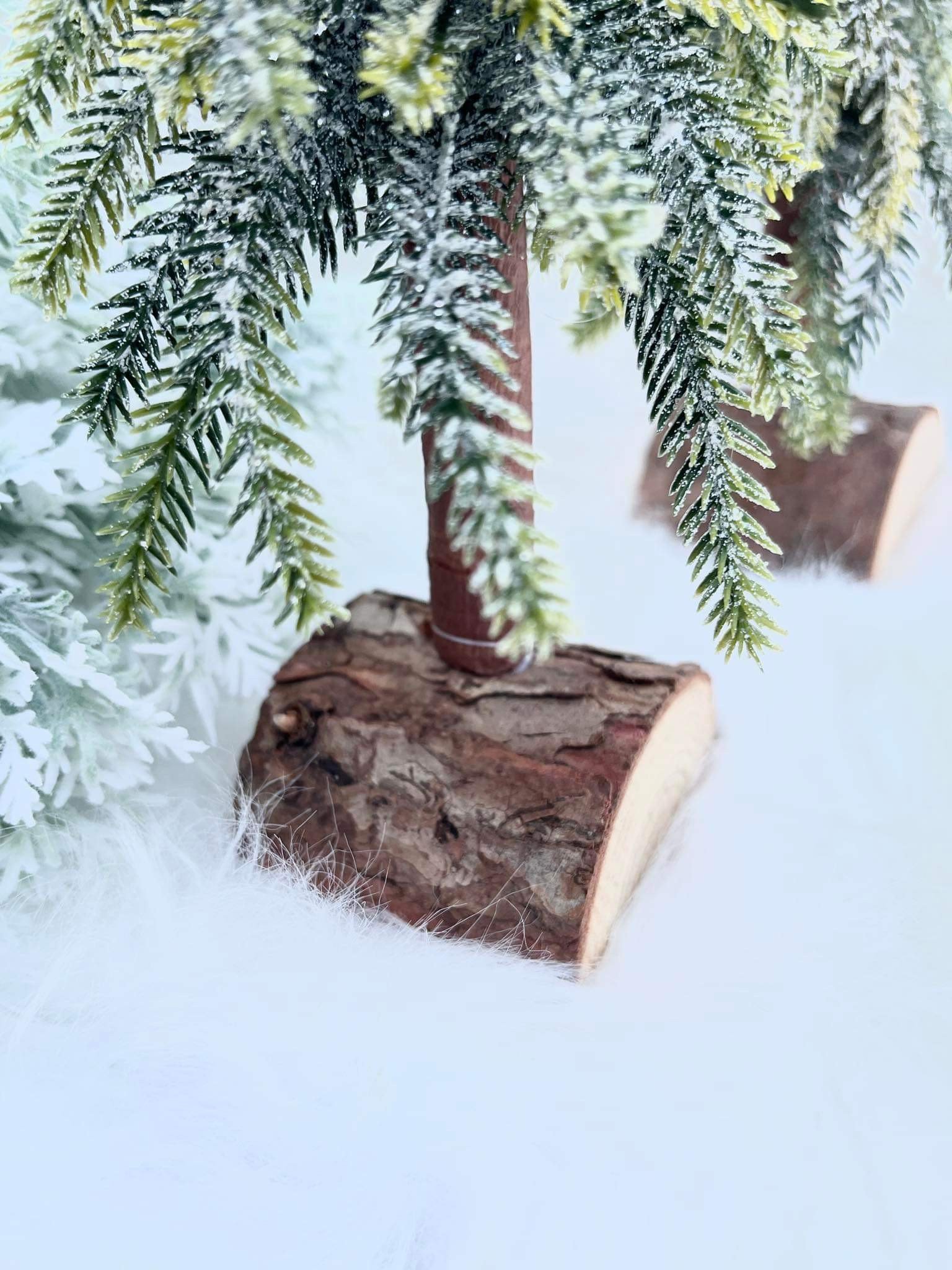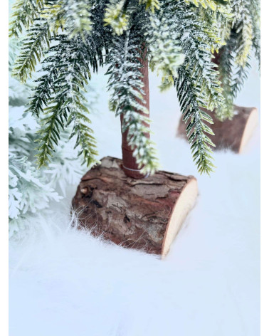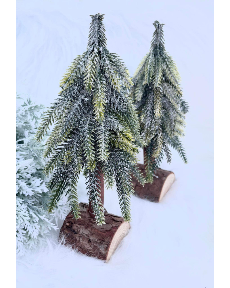 Malý stromček 18 cm vysoký na drevenom polienku, vhodný na dekorovanie samostatne aj do vianočných dediniek, ikebán či svietnikov.