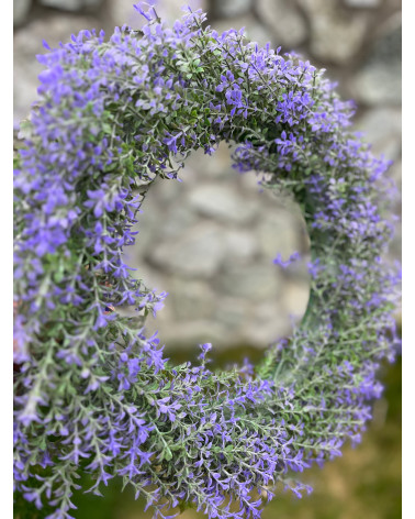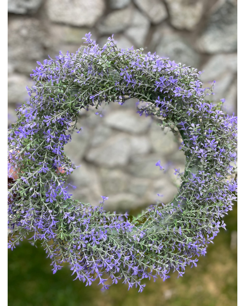 Veľký zeleno fialový veniec z drobných kvietkov.