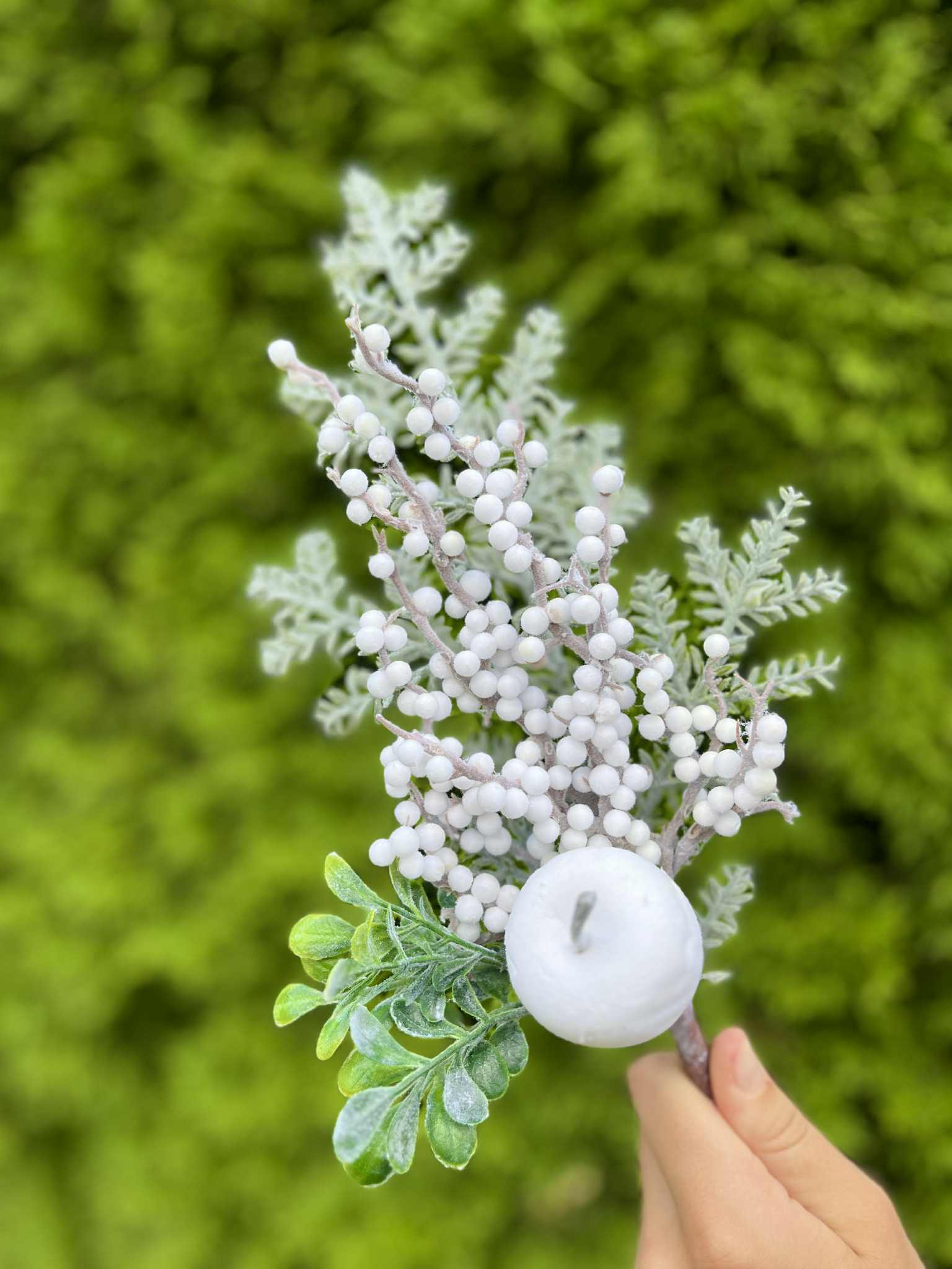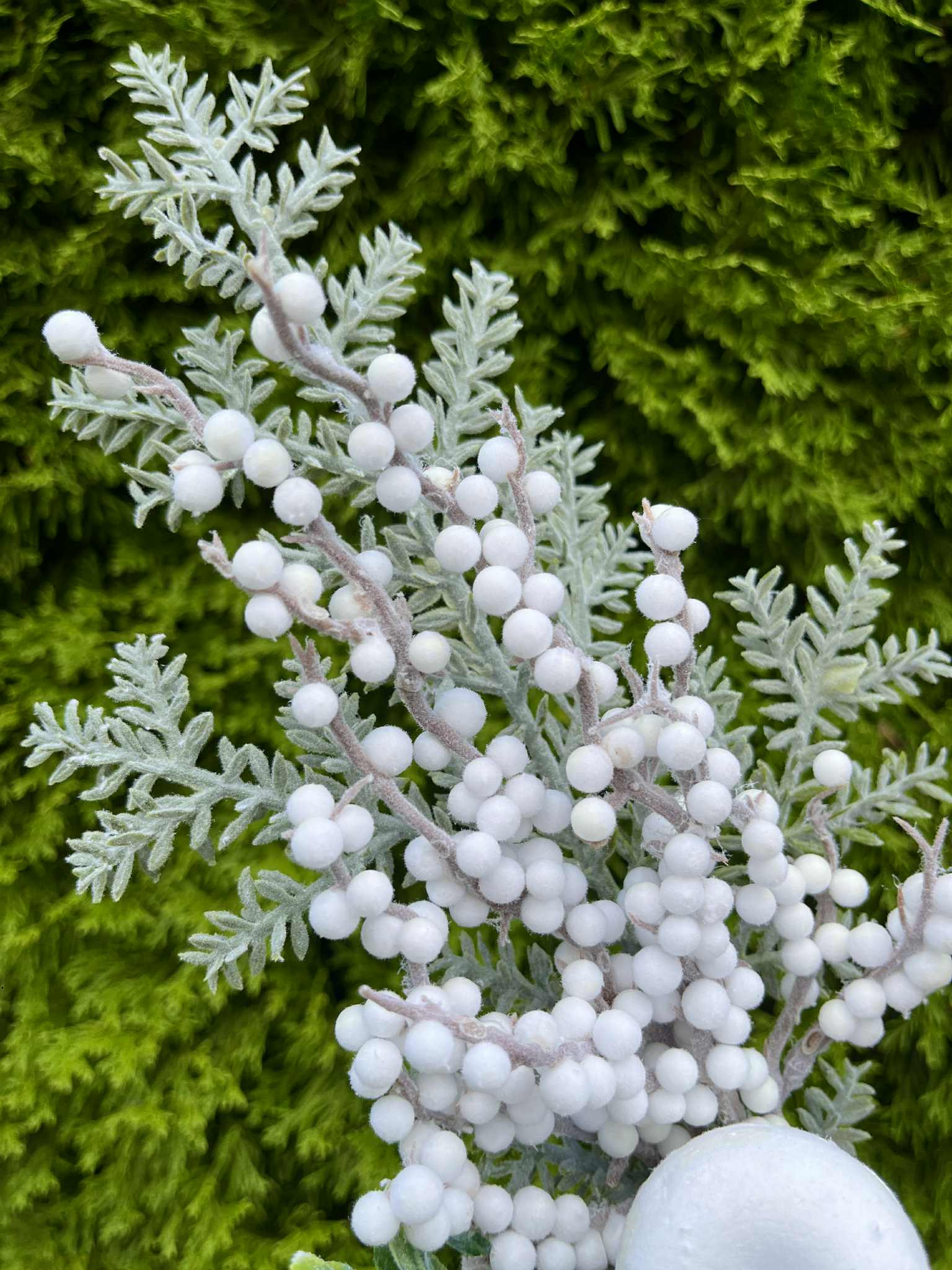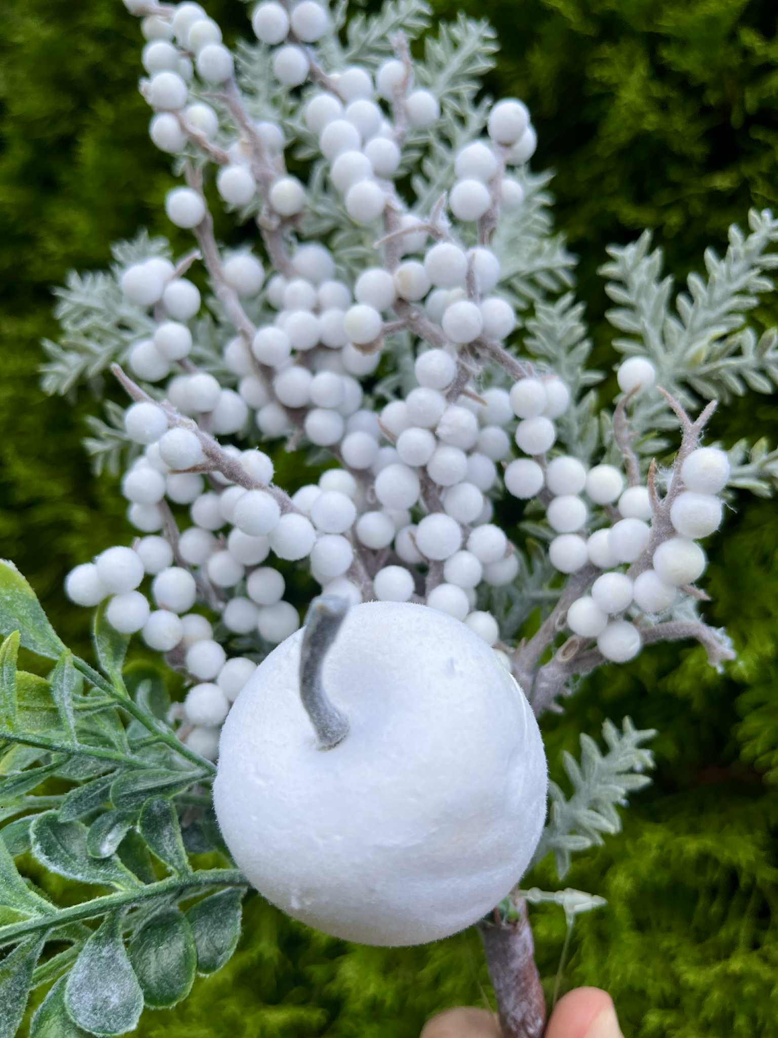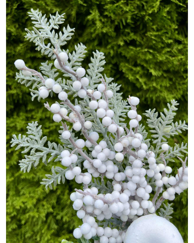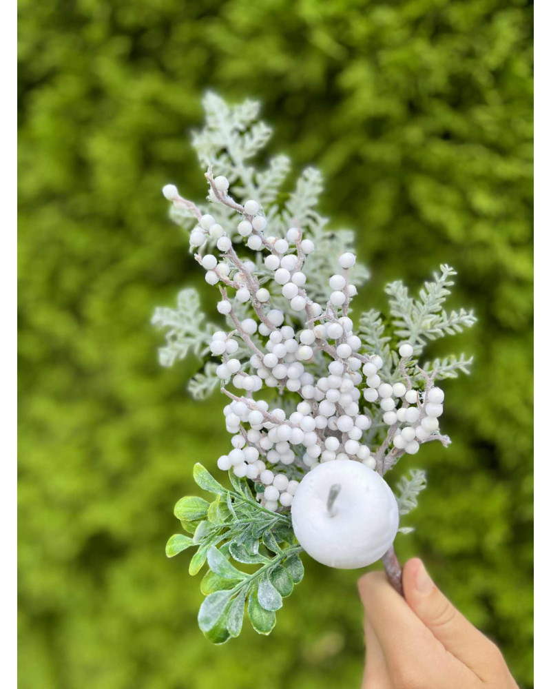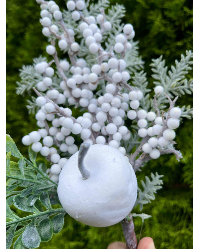 Konár s bielym jablkom, s bielymi bobuľkami, doplnený o zasneženú čečinku.
