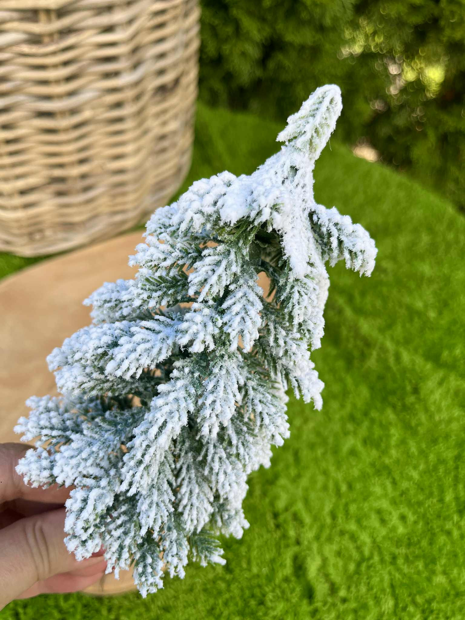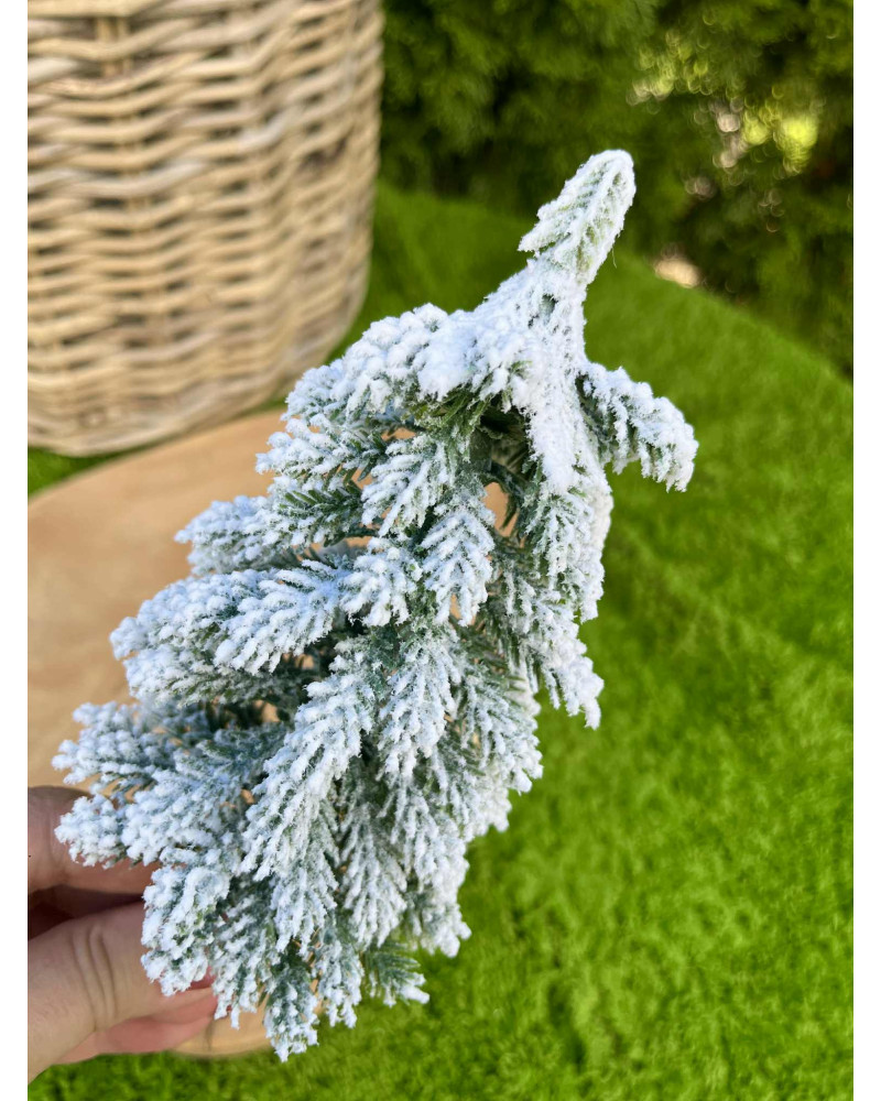 Zasnežený stromček na drôtiku, vhodný do zimných aranžmánov a vencov.