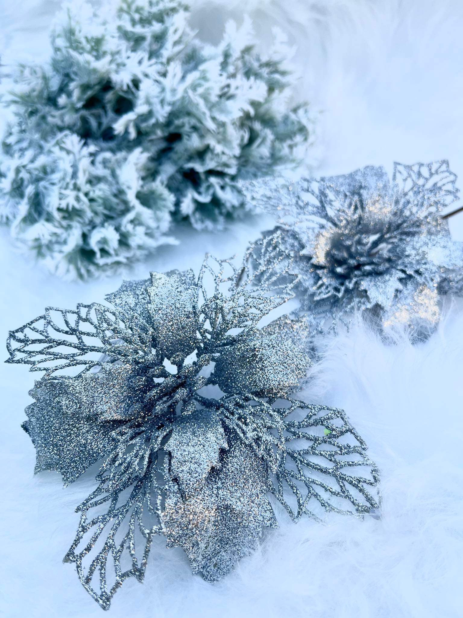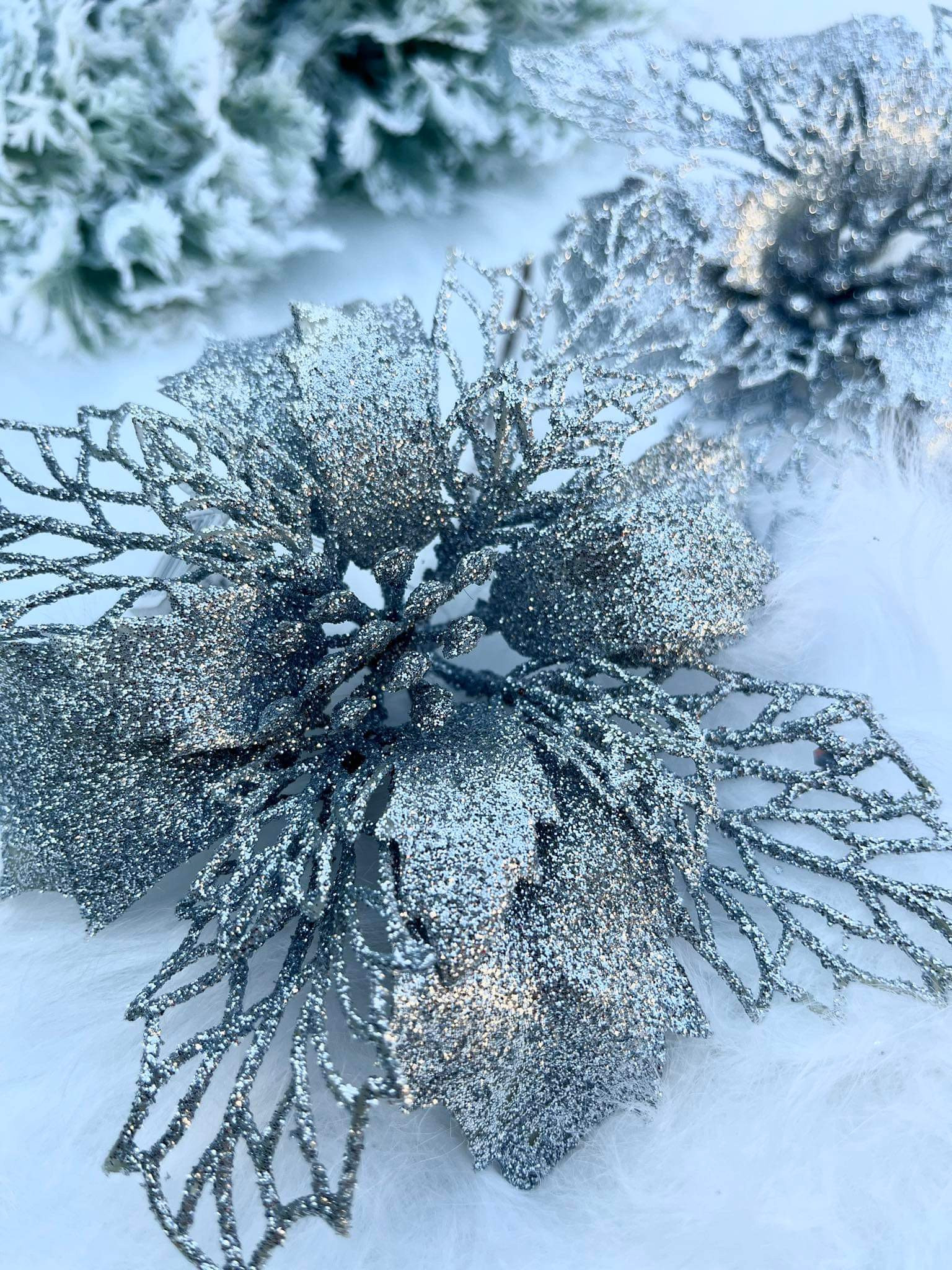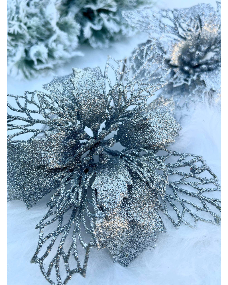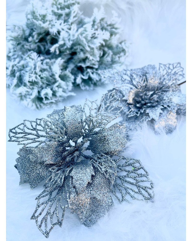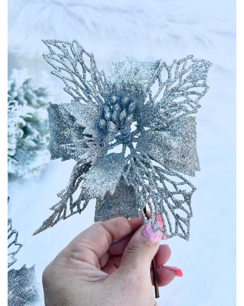 Prudko ligotavý strieborný kvet na drôte, vhodný na výzdobu vianočného stromčeka, vianočnej ikebany alebo len tak do čečiny.
