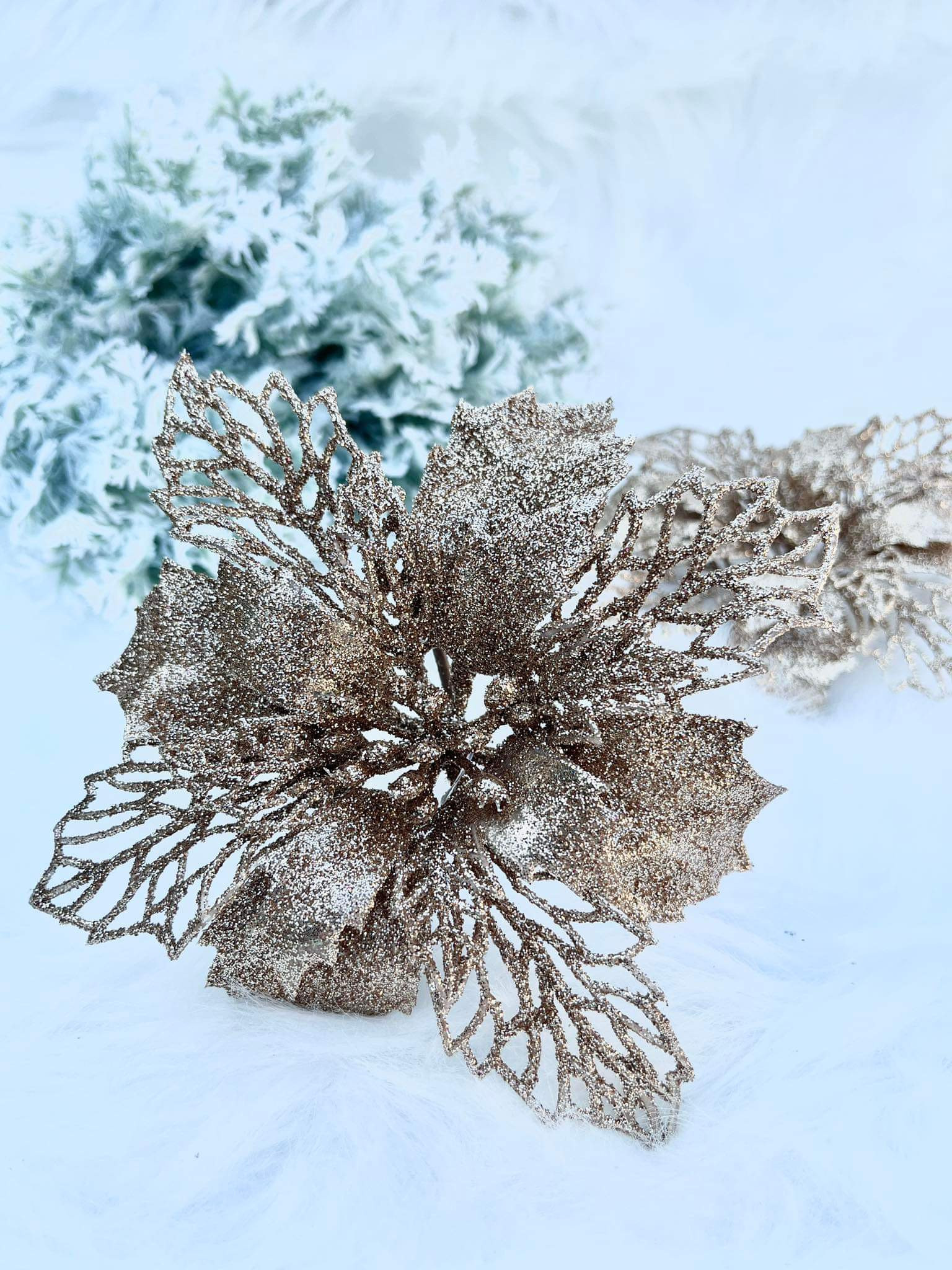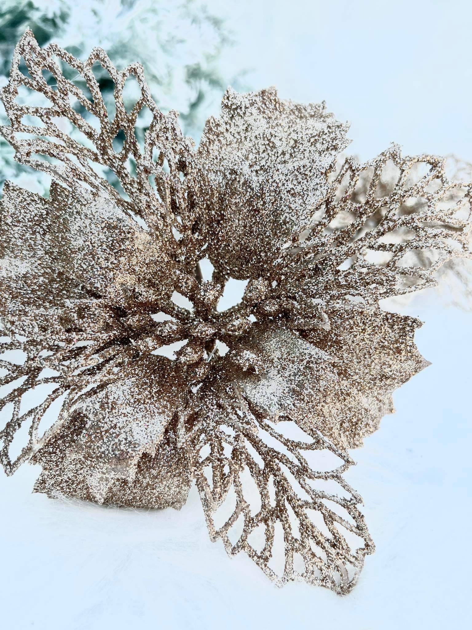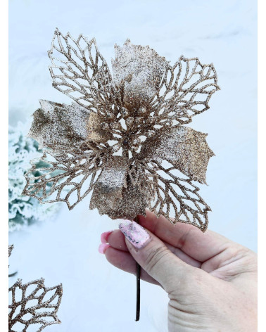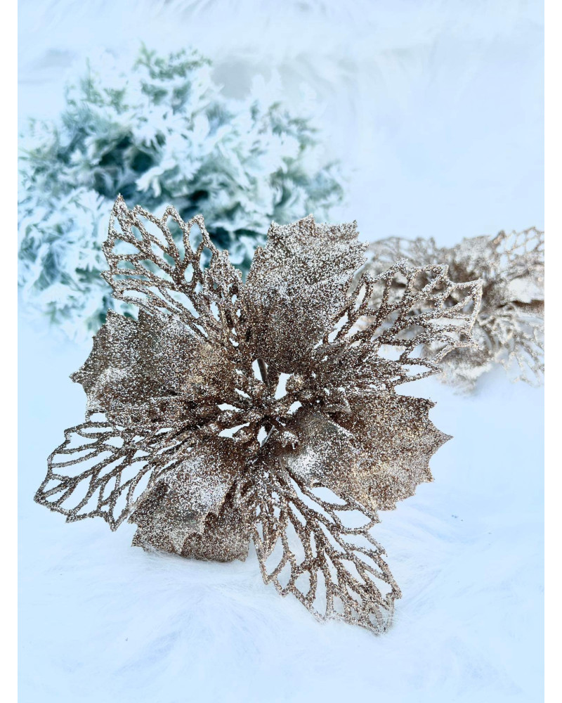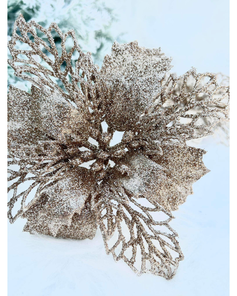 Prudko ligotavý kvet šampanskej farby, vhodný na výzdobu vianočného stromčeka, vianočnej ikebany alebo len tak do čečiny.