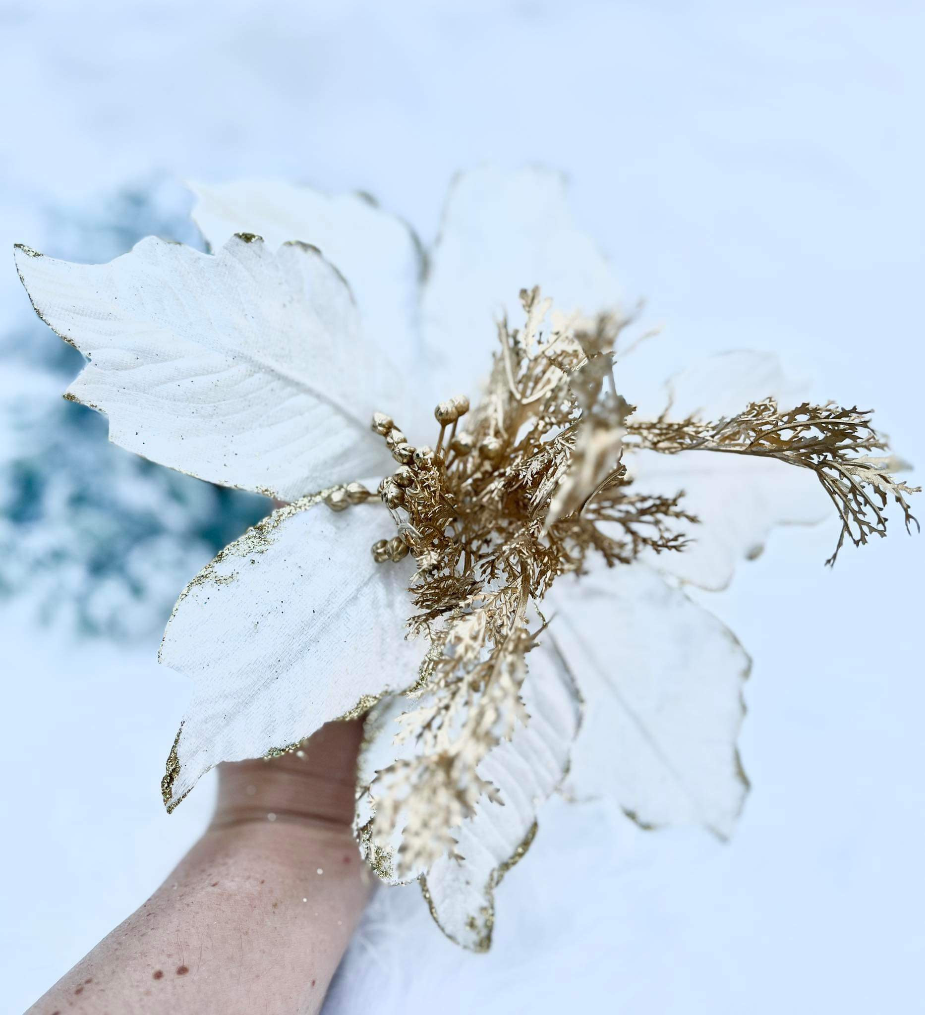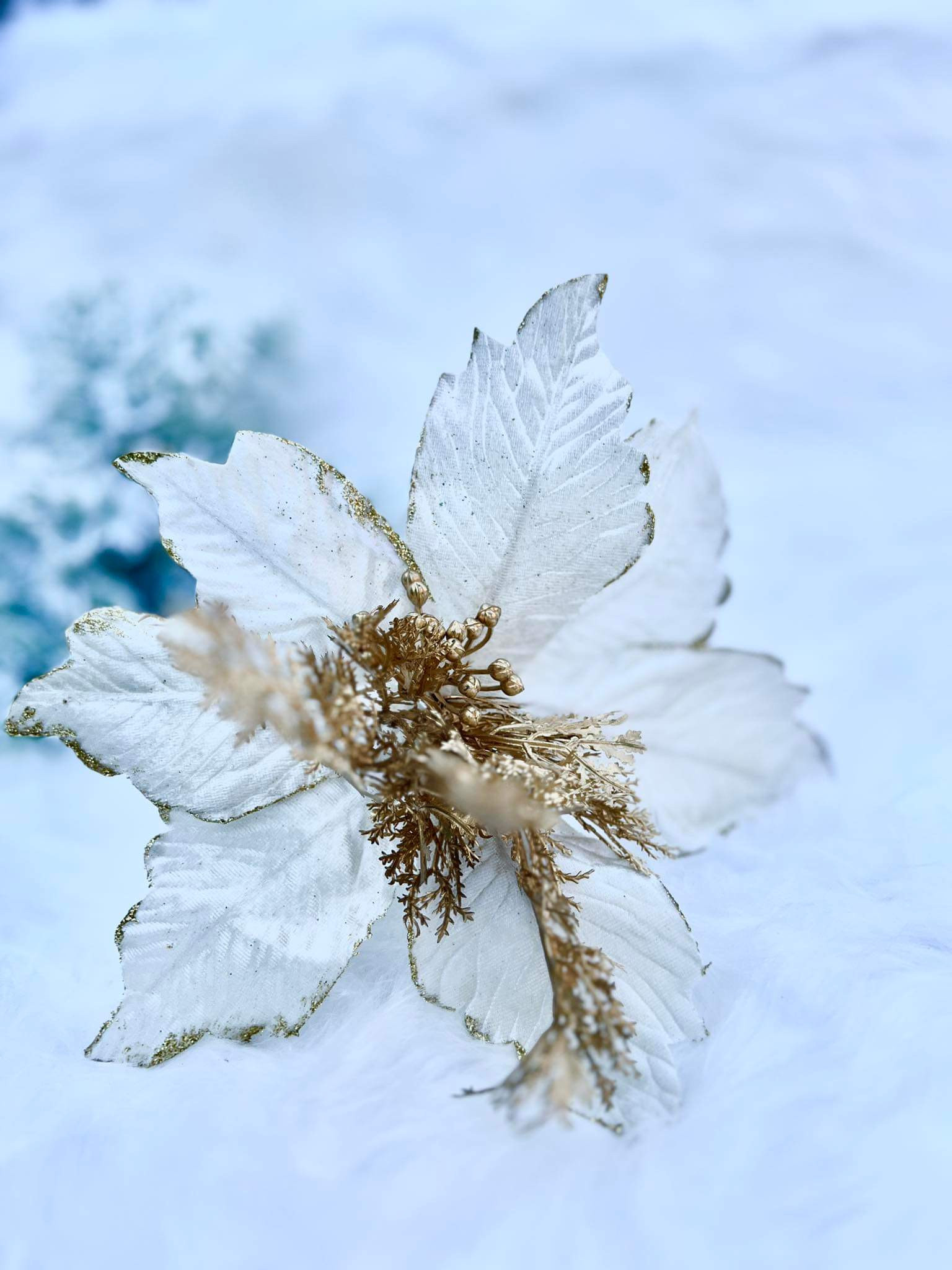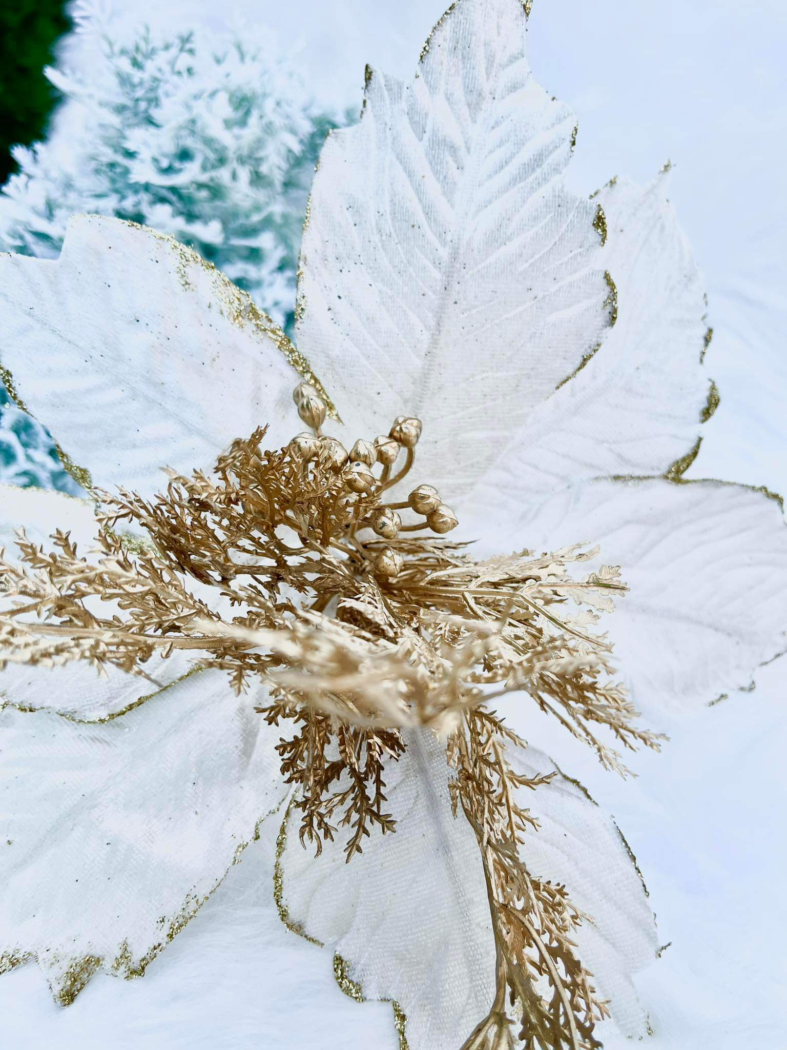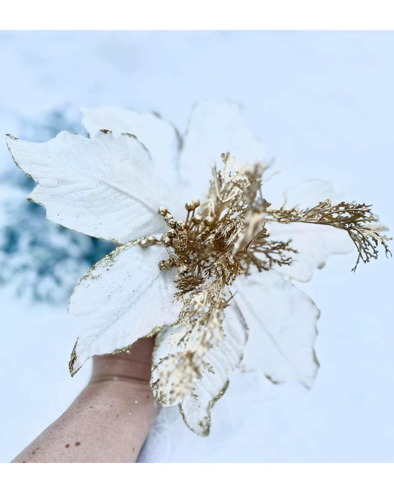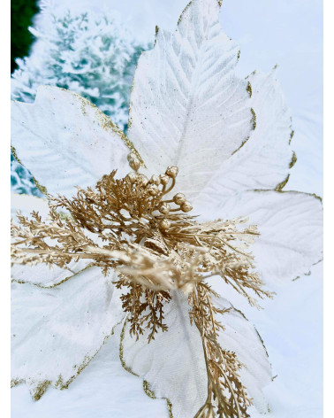 Krásna vianočná ruža v smotanovo zamatovej farbe so zlatým stredom a zlatým ligotavým lemovaním.