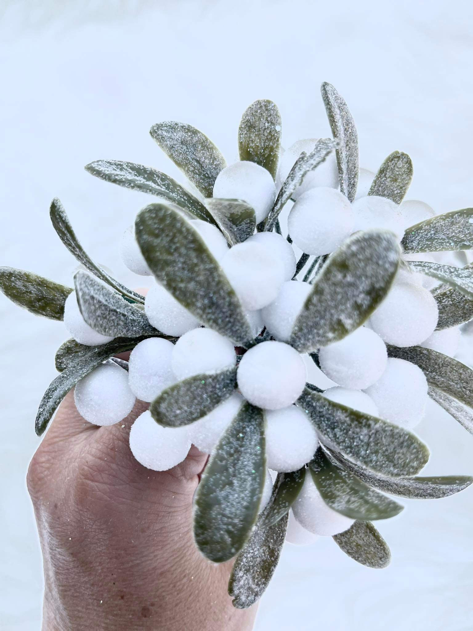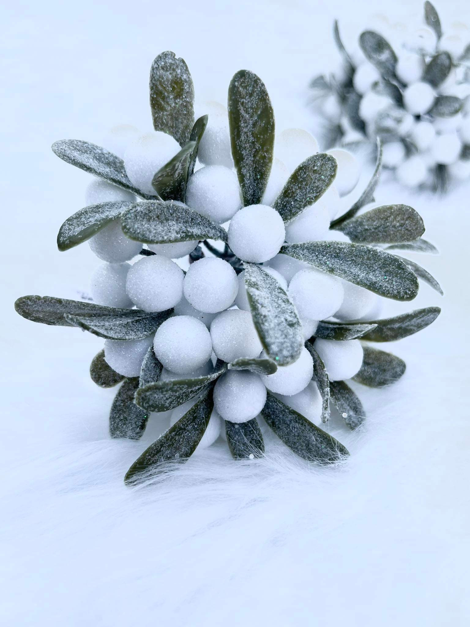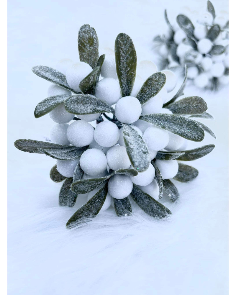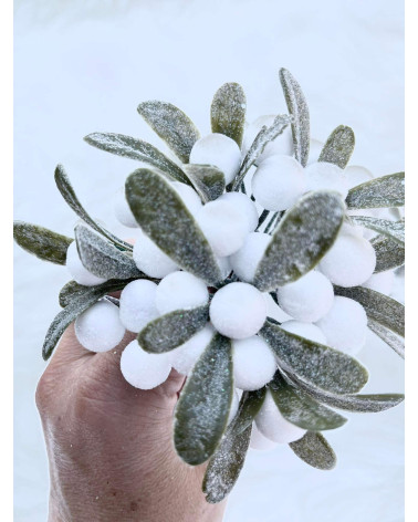 Trs bielych guličiek doplnený jemnými lístkami. Dobre sa s ním aranžuje, vhodný aj do čečiny, či vianočnej ikebany.