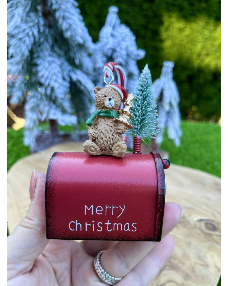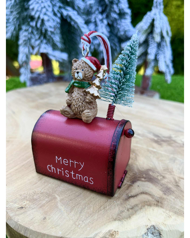 Plechová červená poštová schránka s medvedíkom a stromčekom, dá sa aj zavesiť.