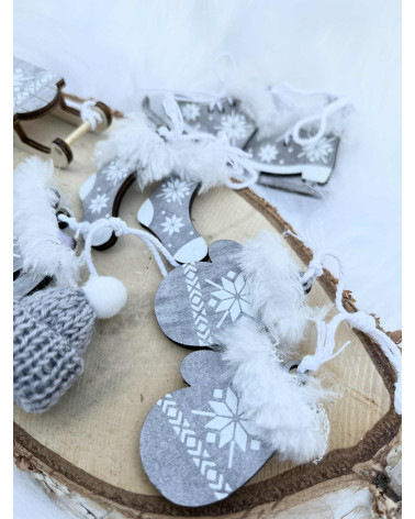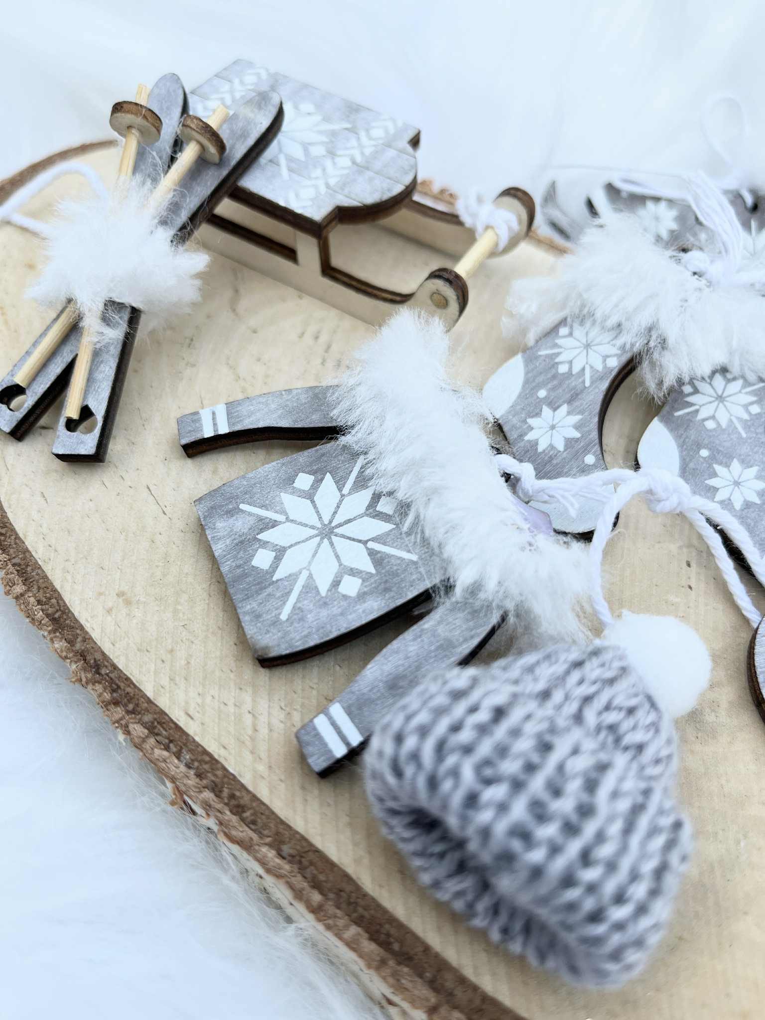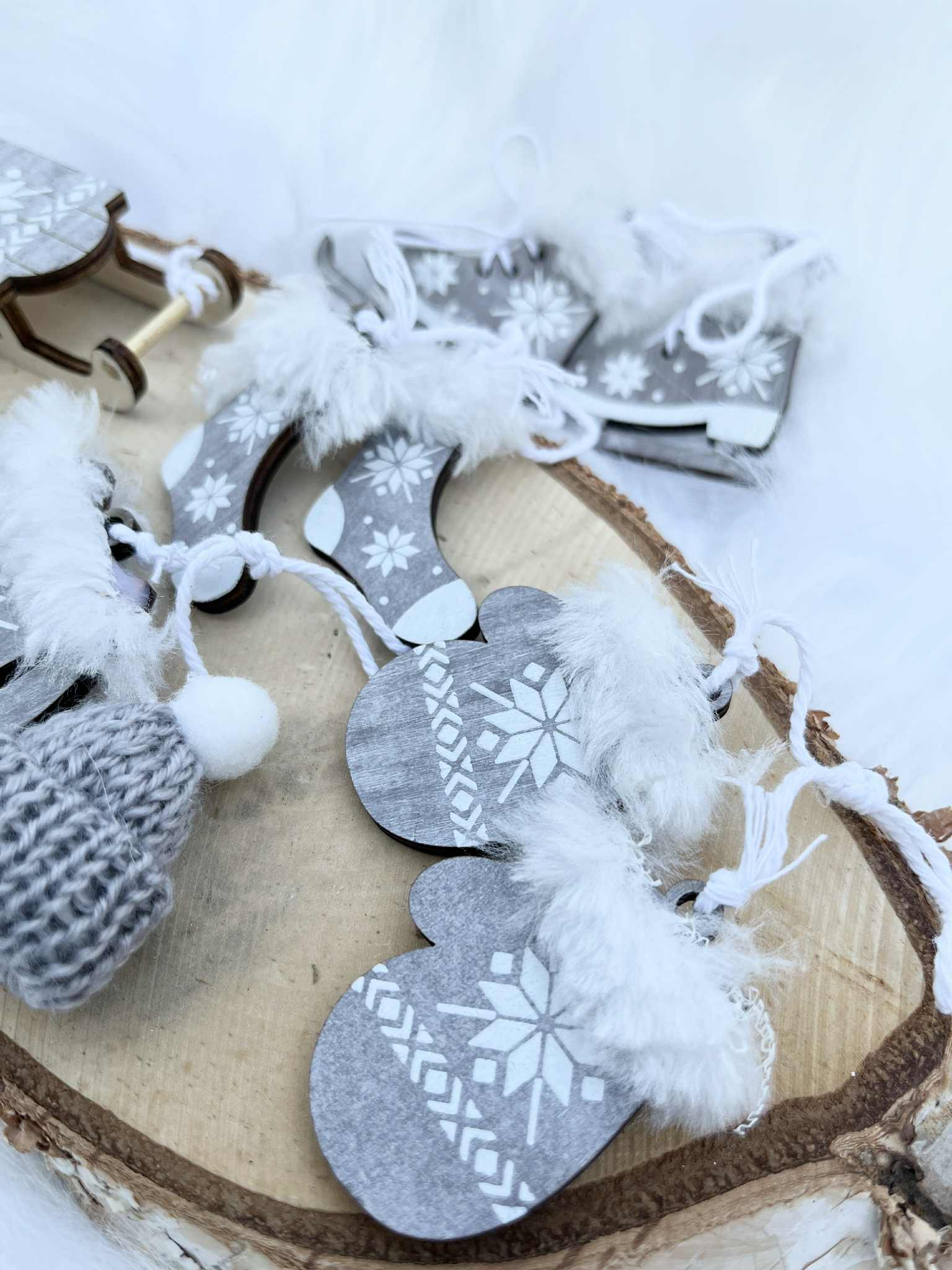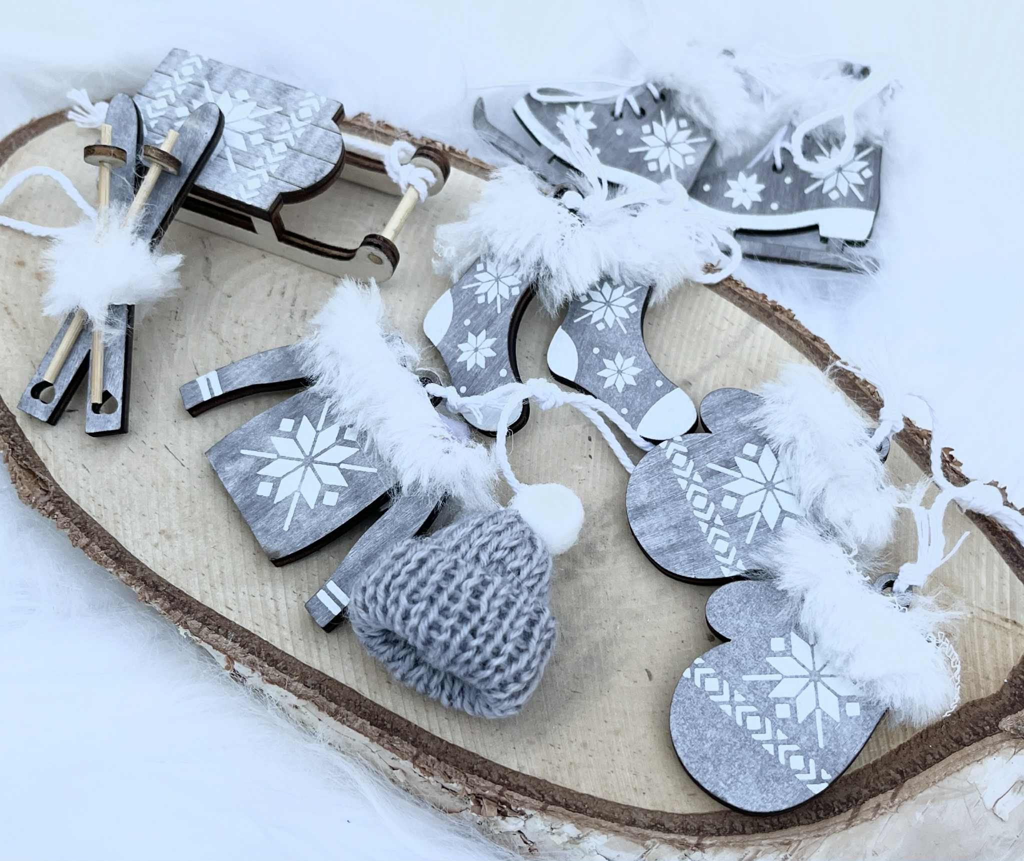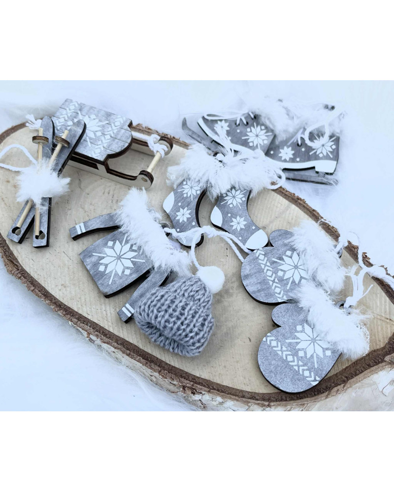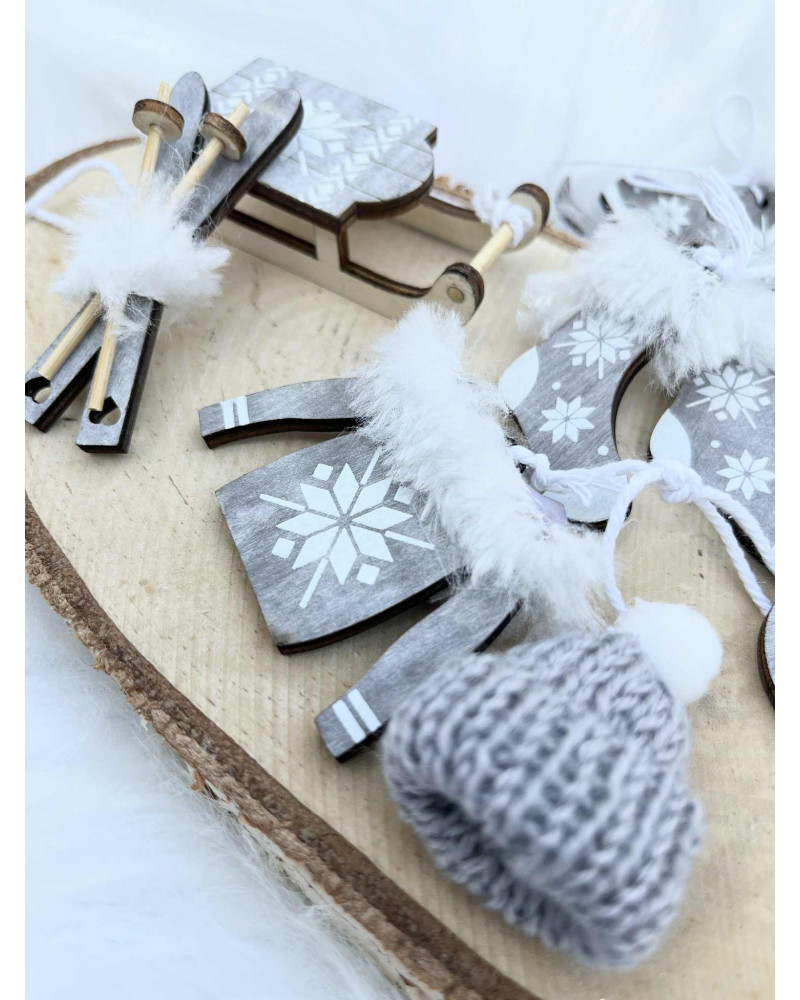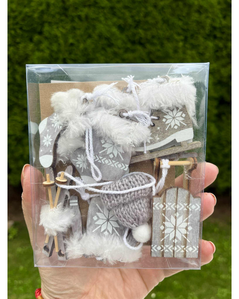 Sada drevených ozdôb v sivej farbe s bielymi ornamentom. Sada obsahuje dve rukavice, dve korčule, dve ponožky, sánky, lyže, sveter a čiapku. Sú v pároch na zavesenie.