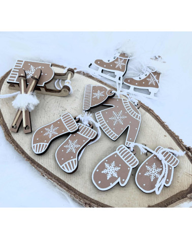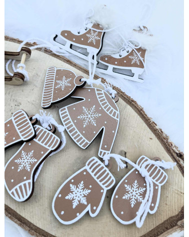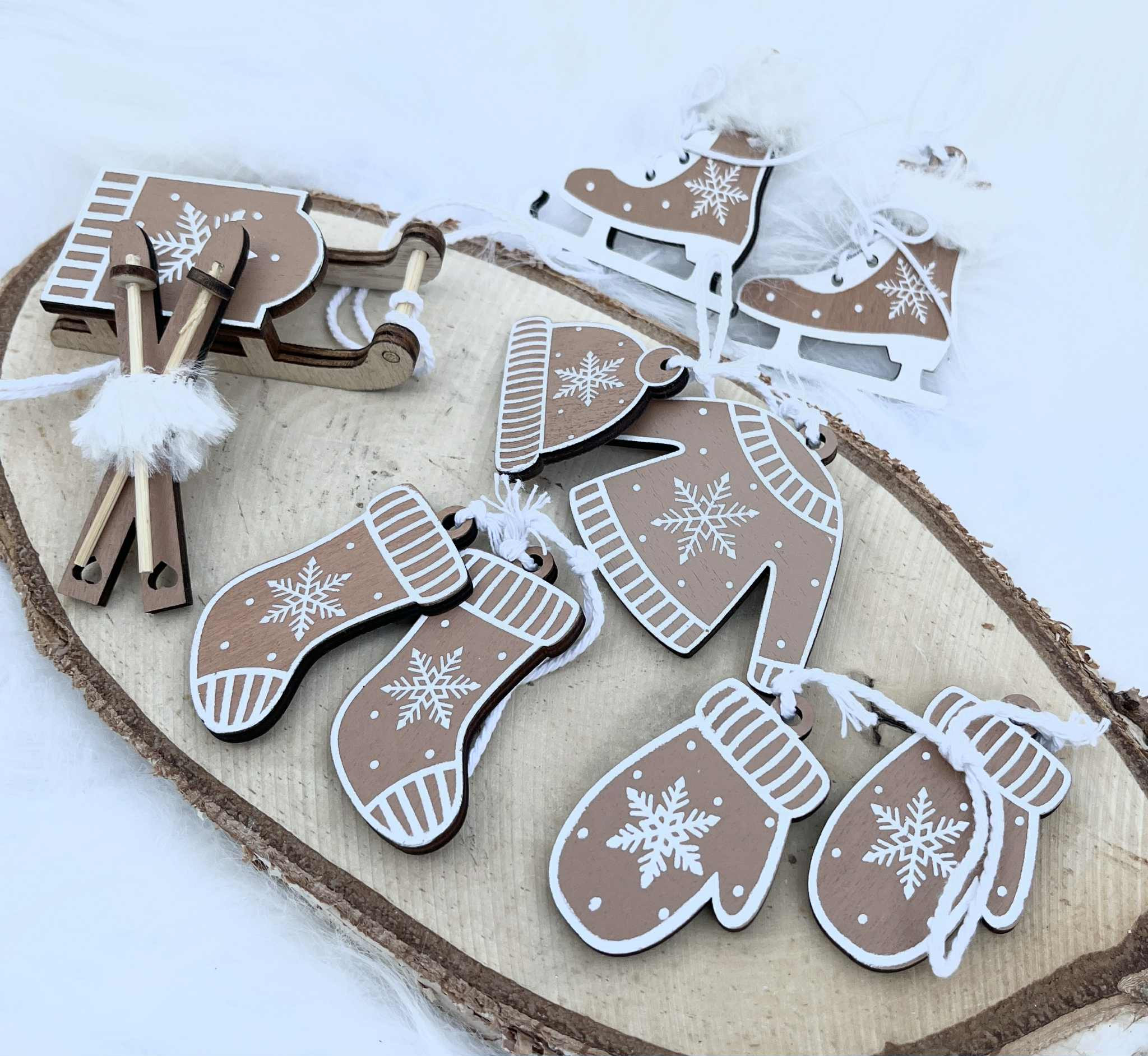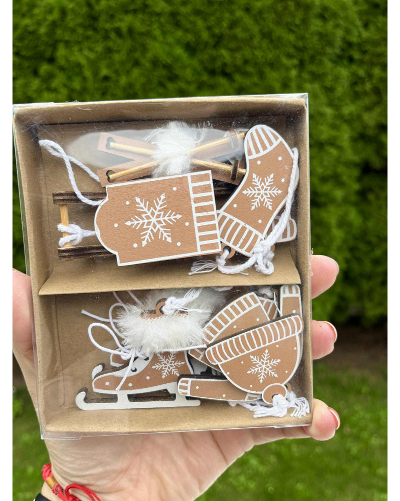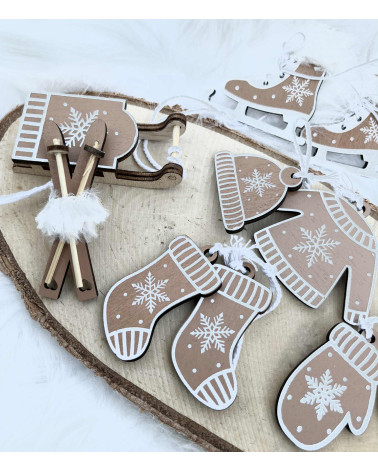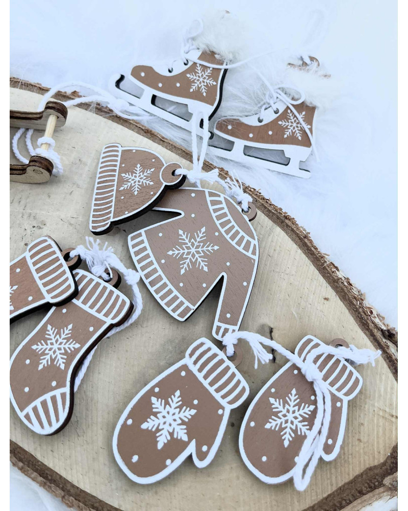 Sada drevených ozdôbok v hnedej farbe s bielymi ornamentmi. Sada obsahuje dve ponožky, dve rukavice, dve korčule, sánky, lyže, sveter a čiapku.
