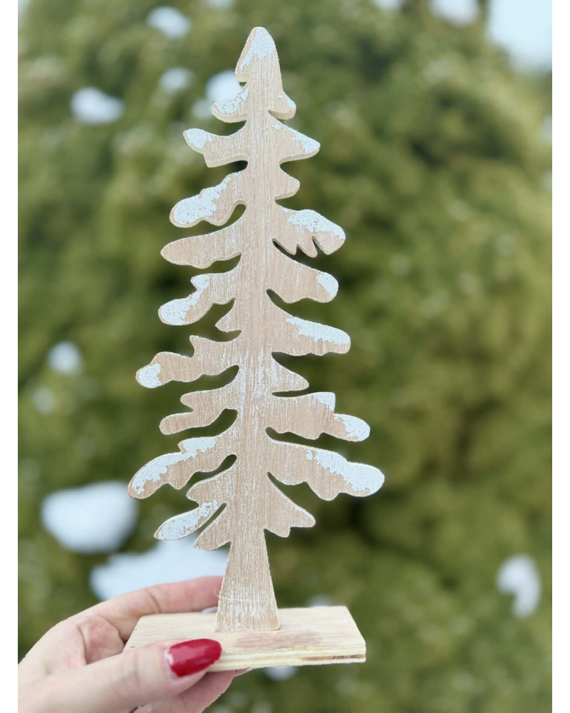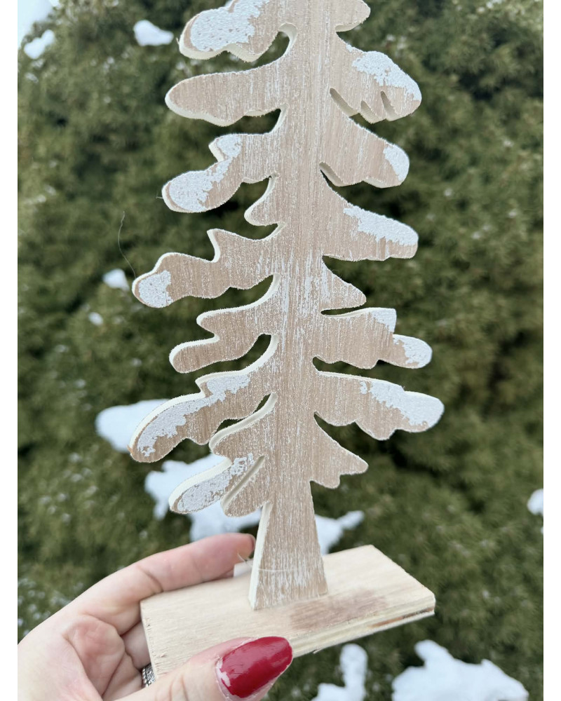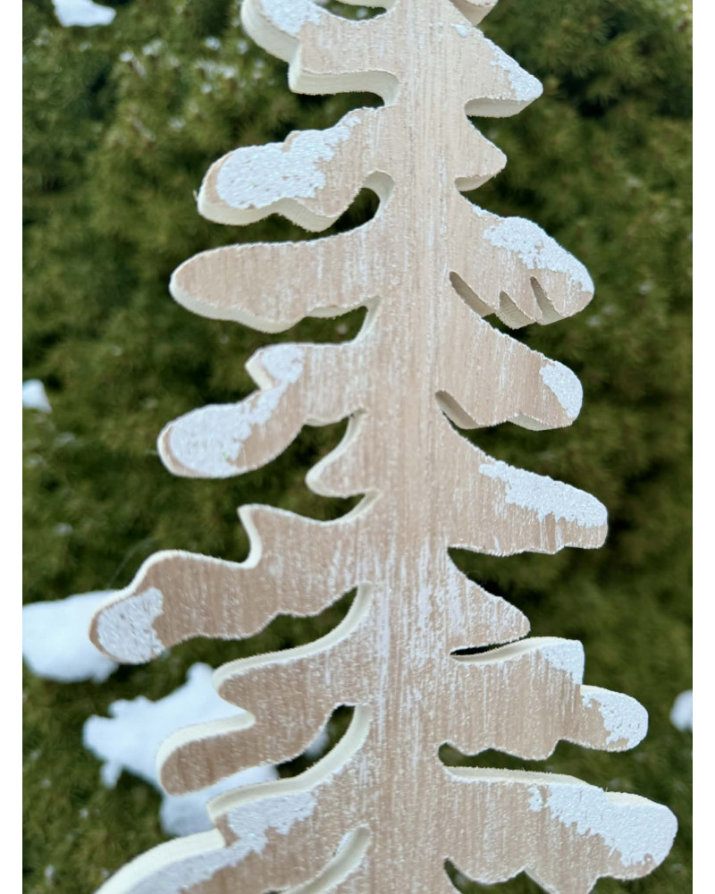 Drevený stromček so zasneženým efektom, na spodku má podstavec. Perfektný do okna, komódu či poličku.