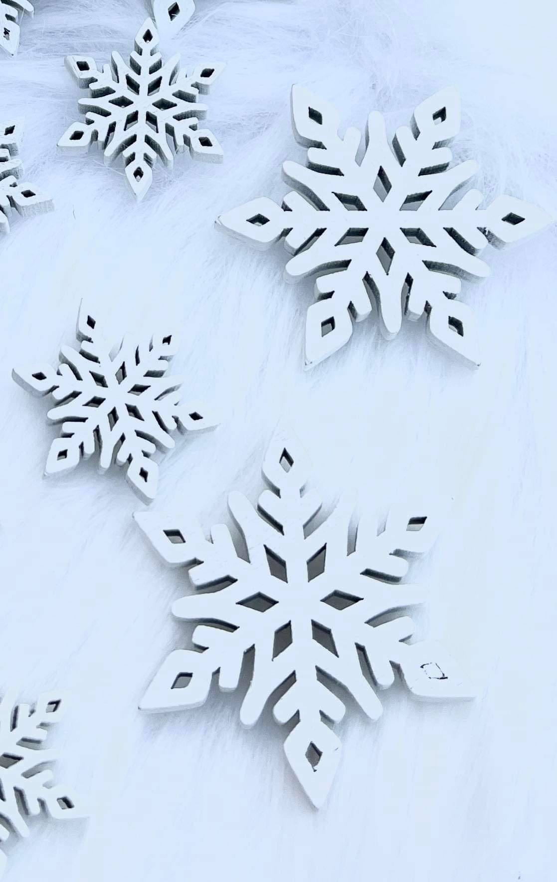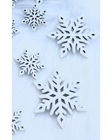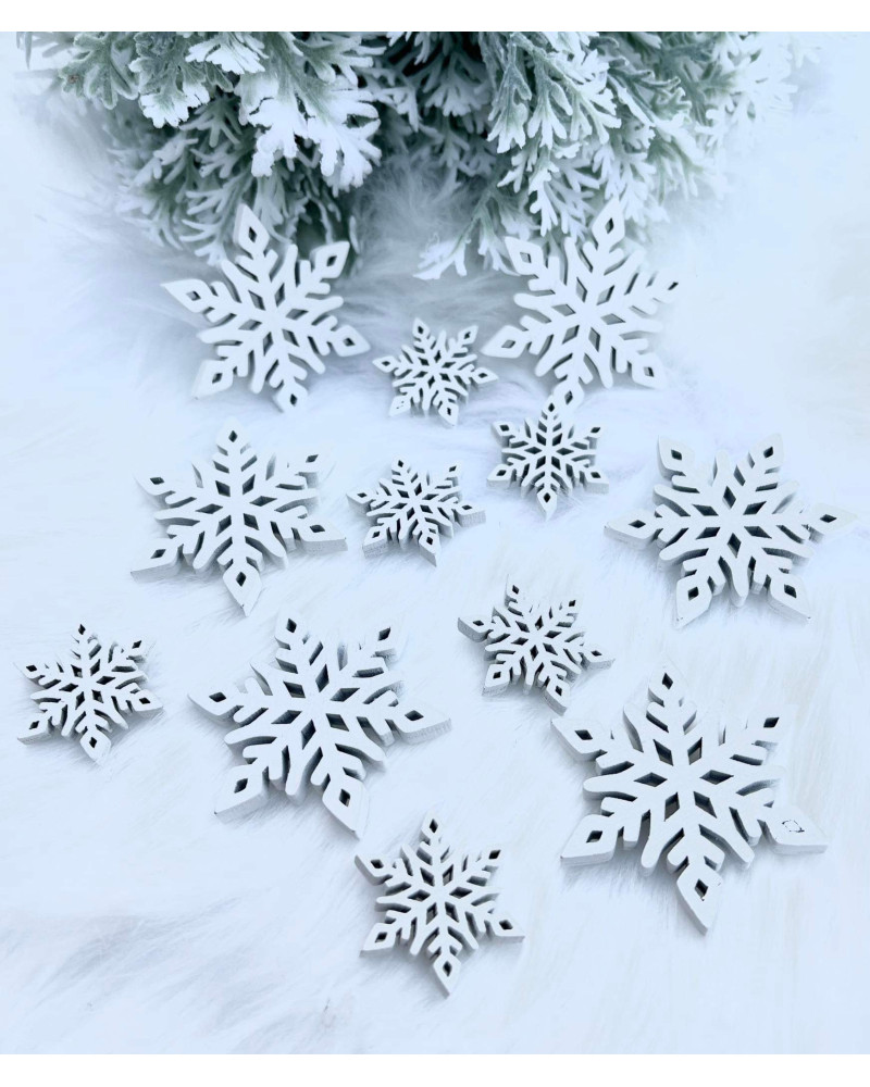 Sada bielych snehových vločiek z dreva. V sade je 6 veľkých a 6 malých vločiek.