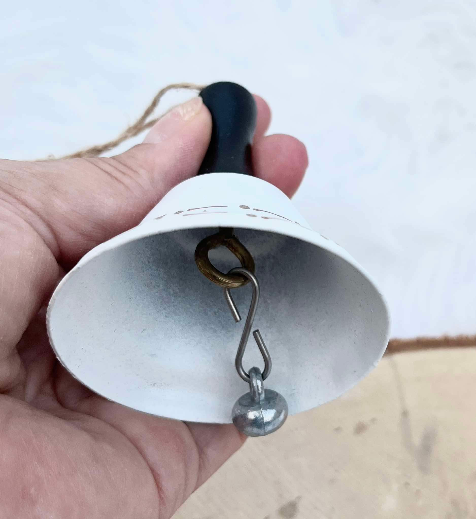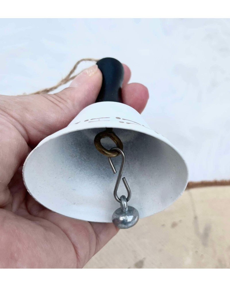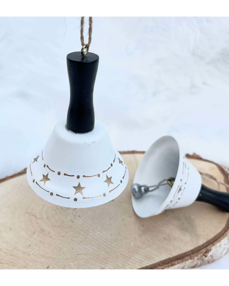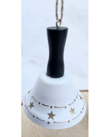 Kovovÿ biely zvonček so zlatým lemom s hviezdičkami, s čiernym dreveným úchytom, aj na zavesenie.