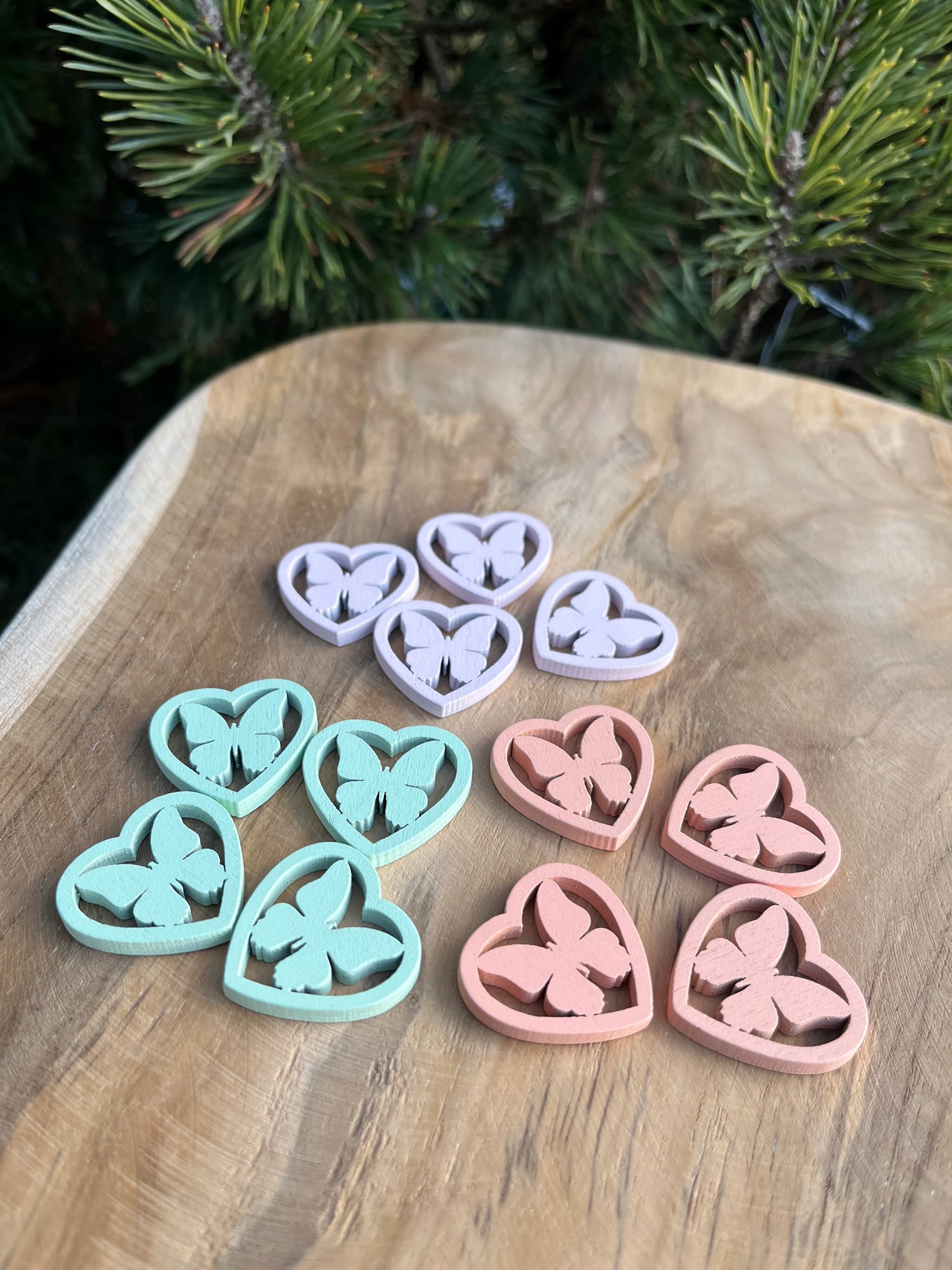 Sada drevených srdiečok v troch farbách, vo vnútri sú motýliky, v sade je ich 12 kusov.