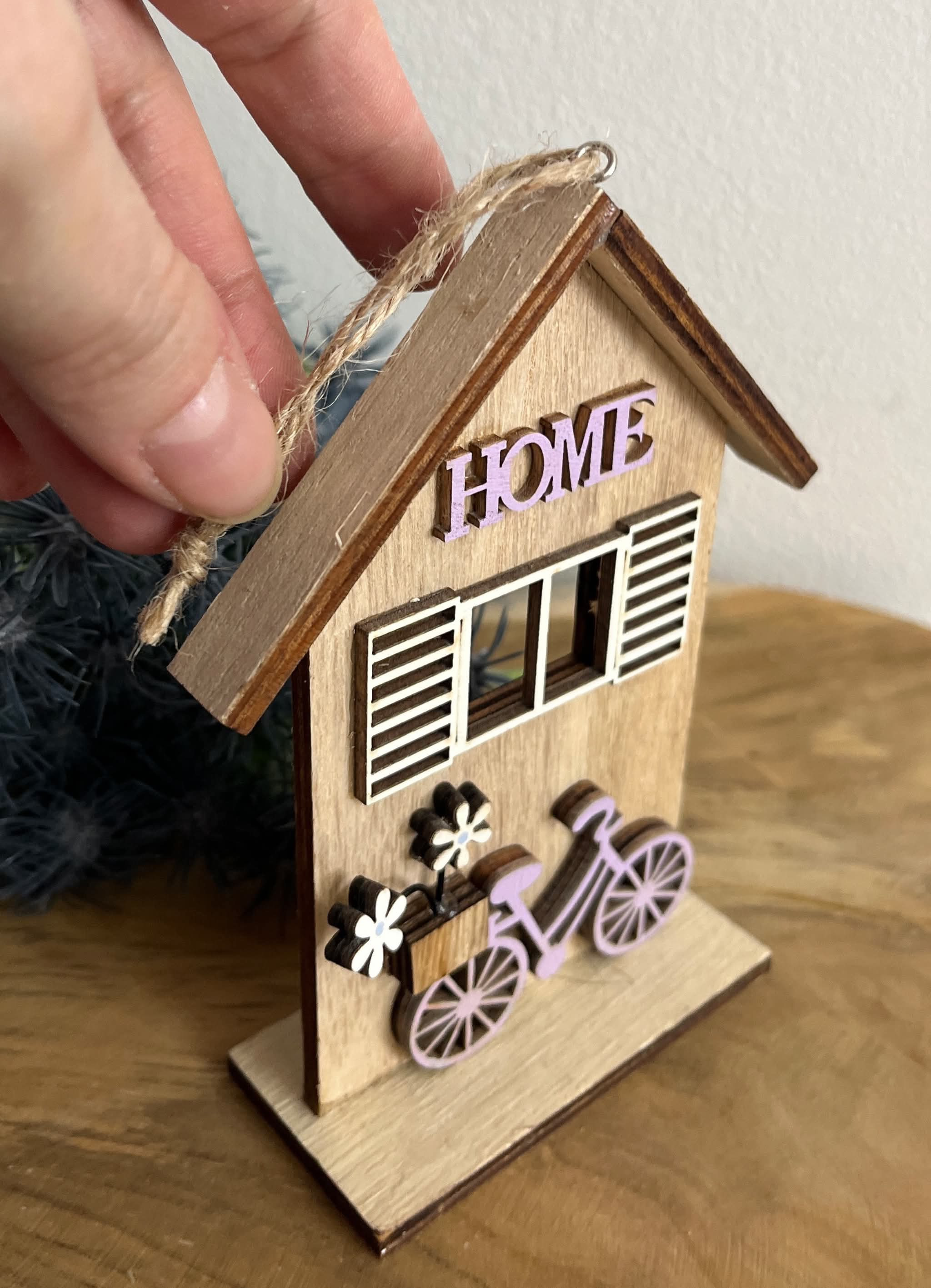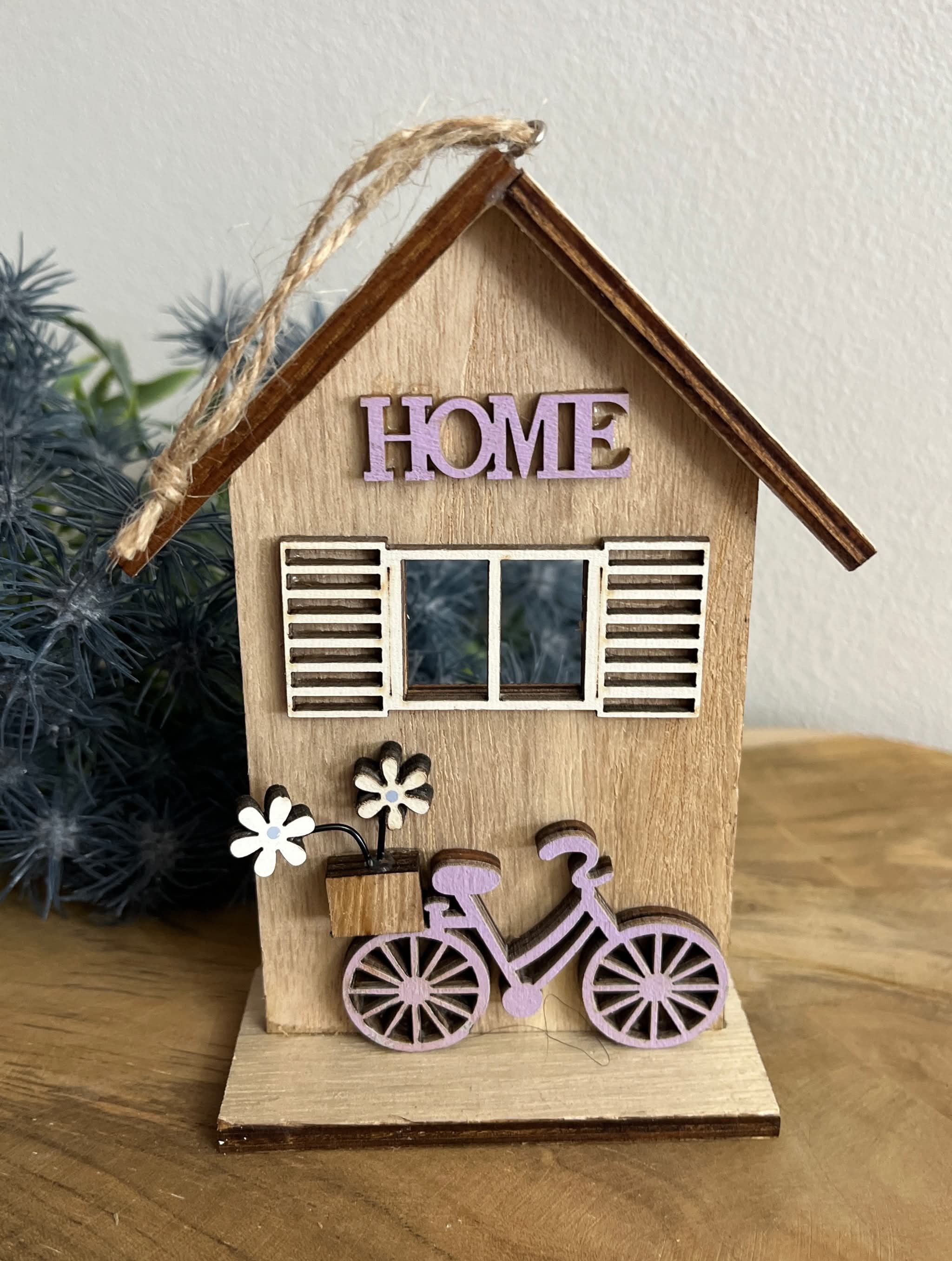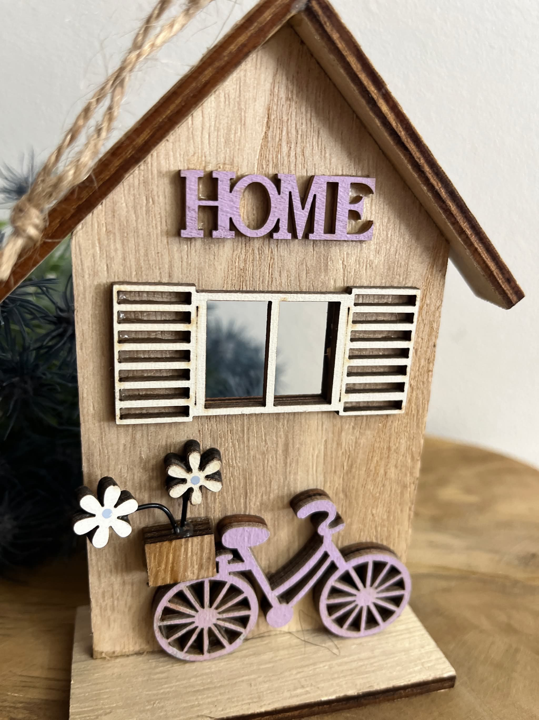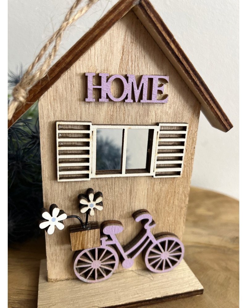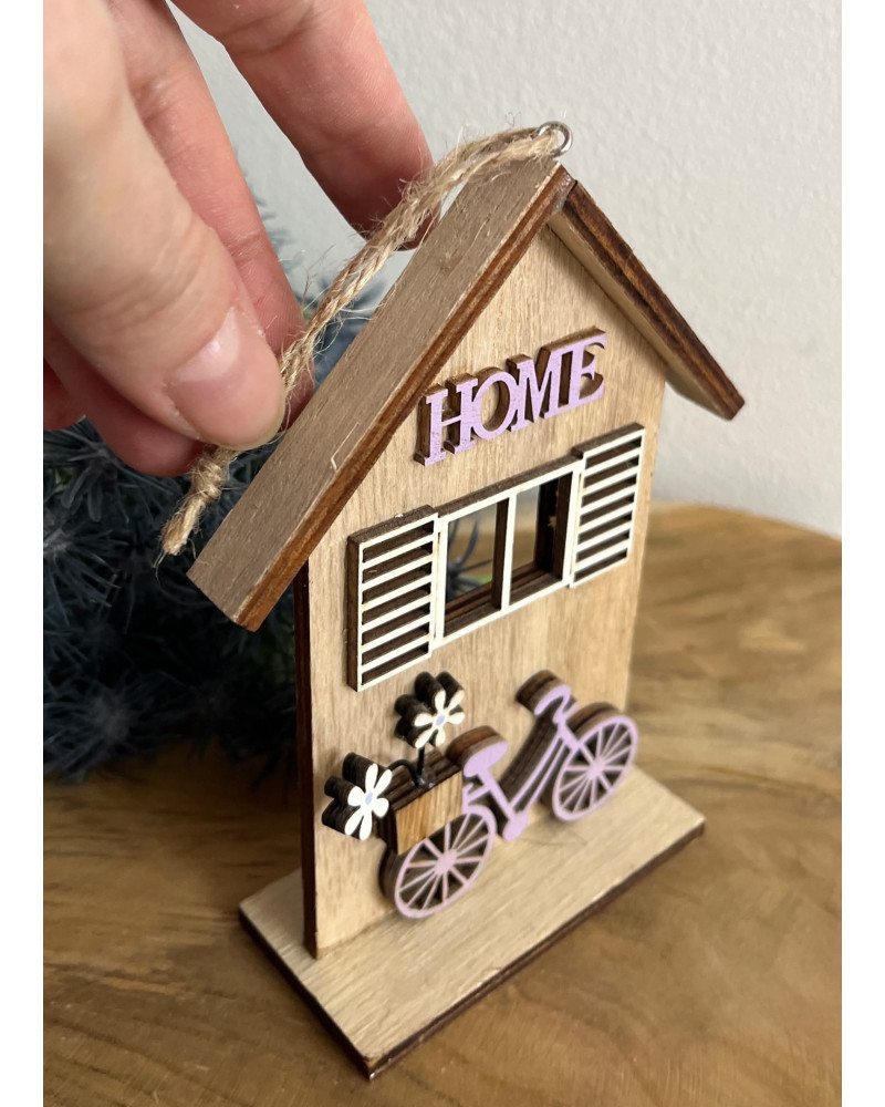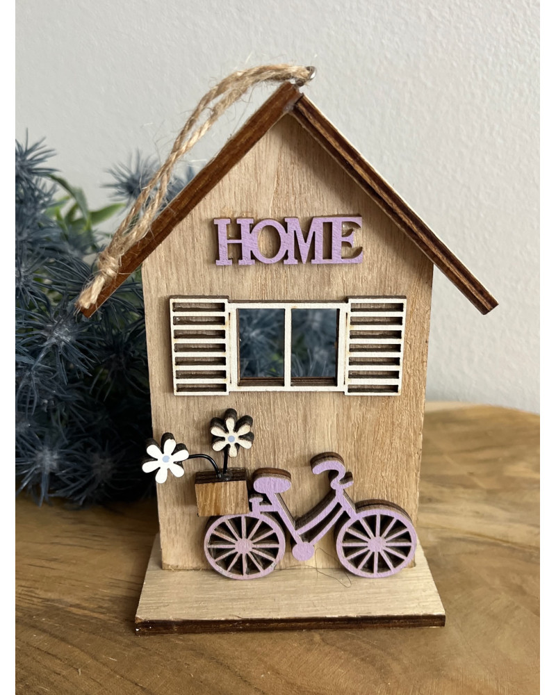 Drevený domček s bicyklom, s nápisom HOME, s peknými okenicami.