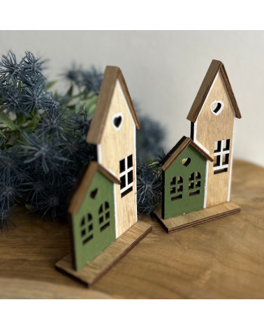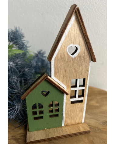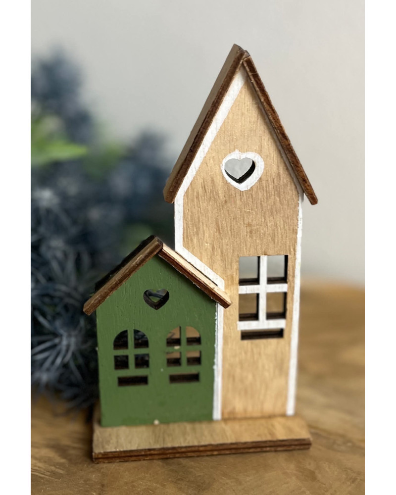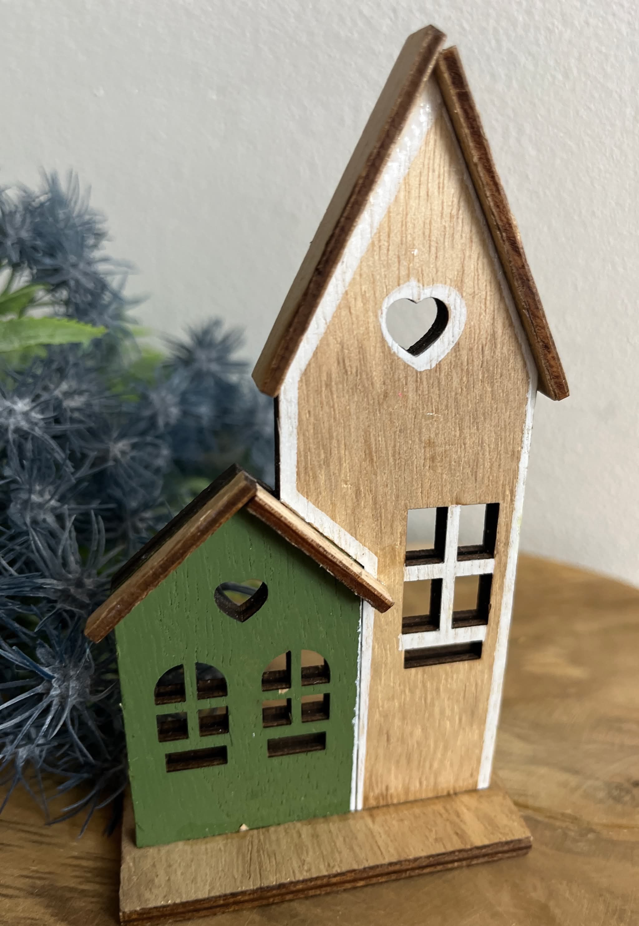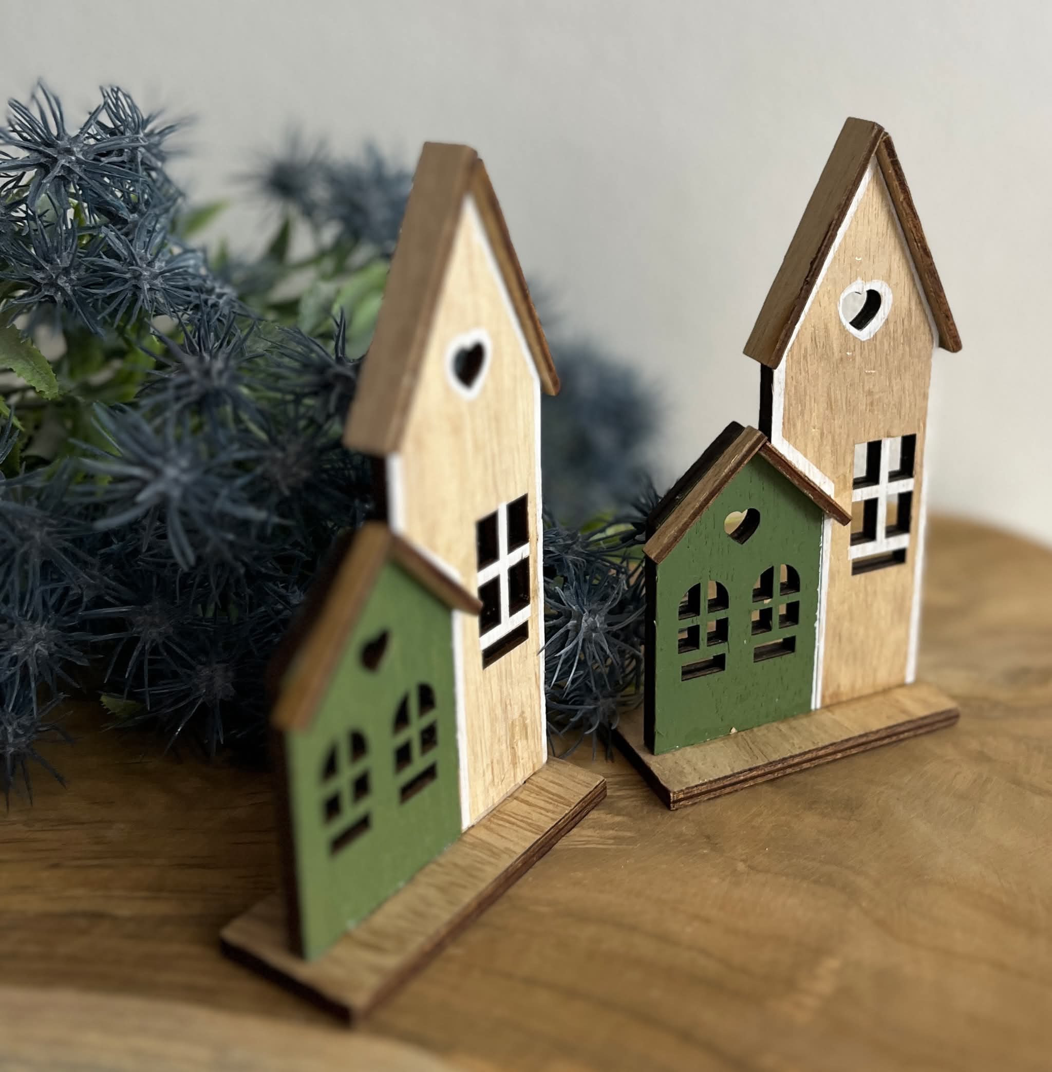 Drevený domček v tmavo zelenej a drevenej farbe.