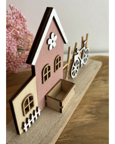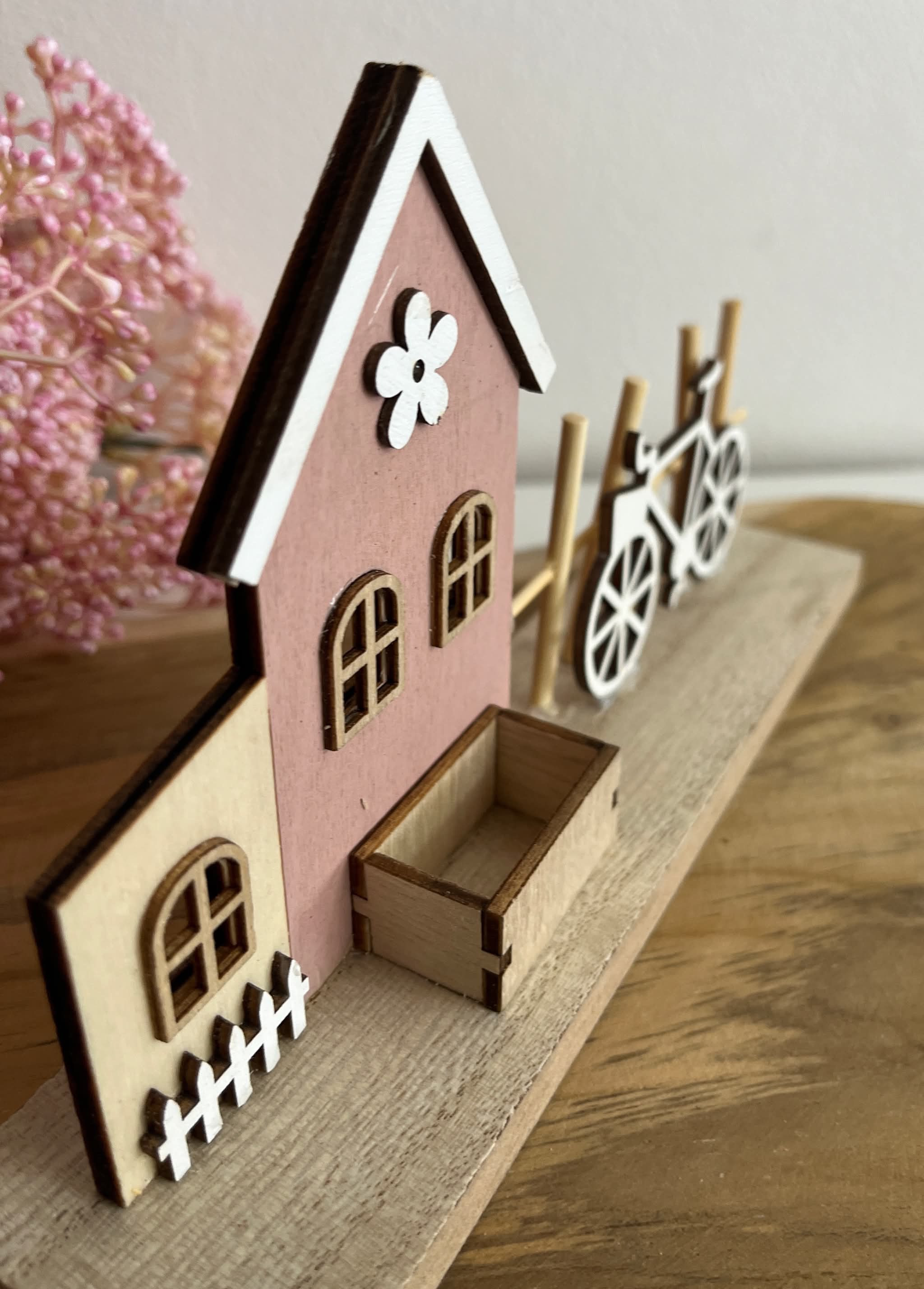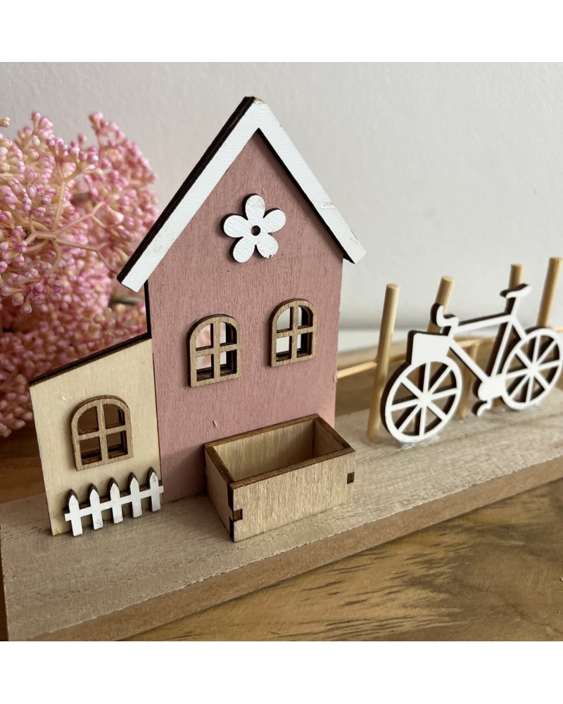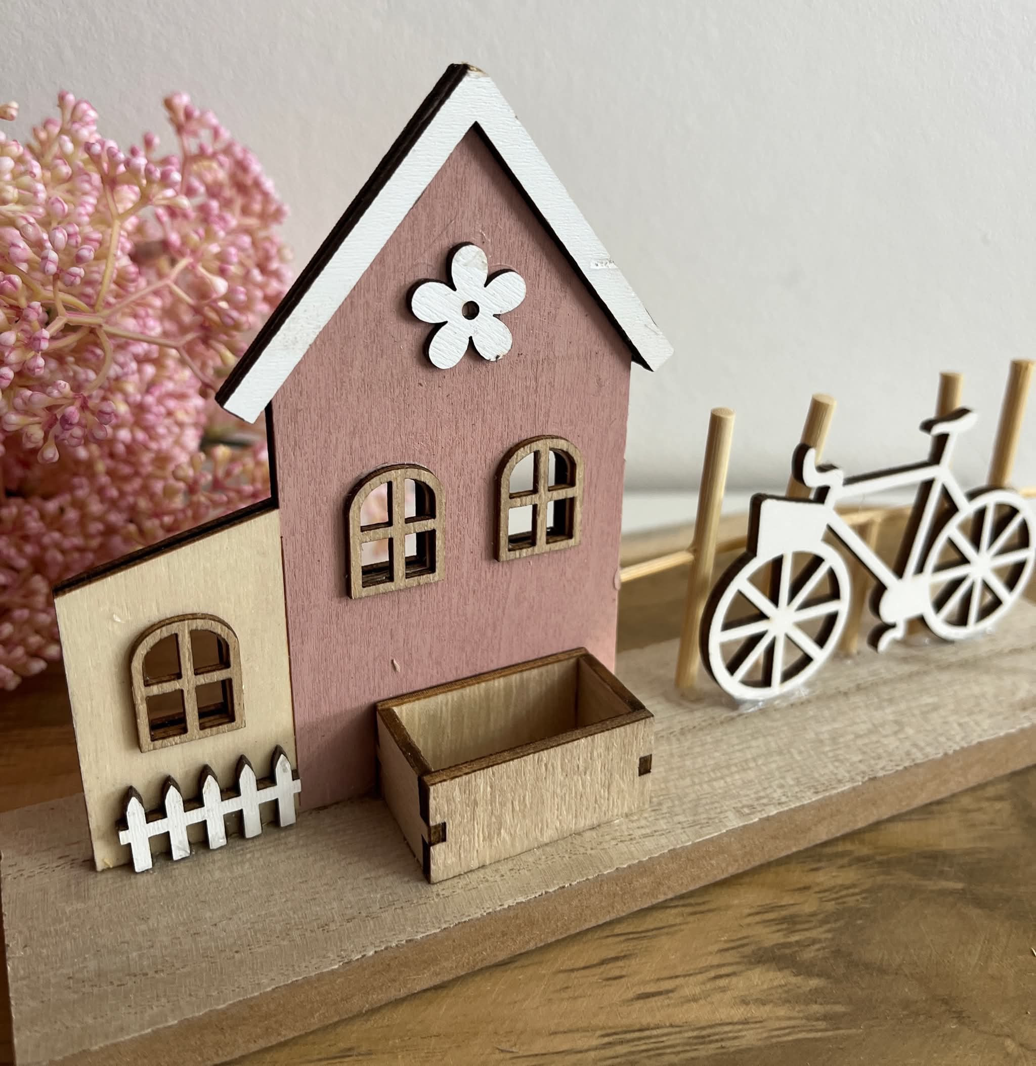 Drevený domček s plotom, bicyklom, s nápisom HOME.