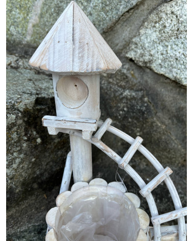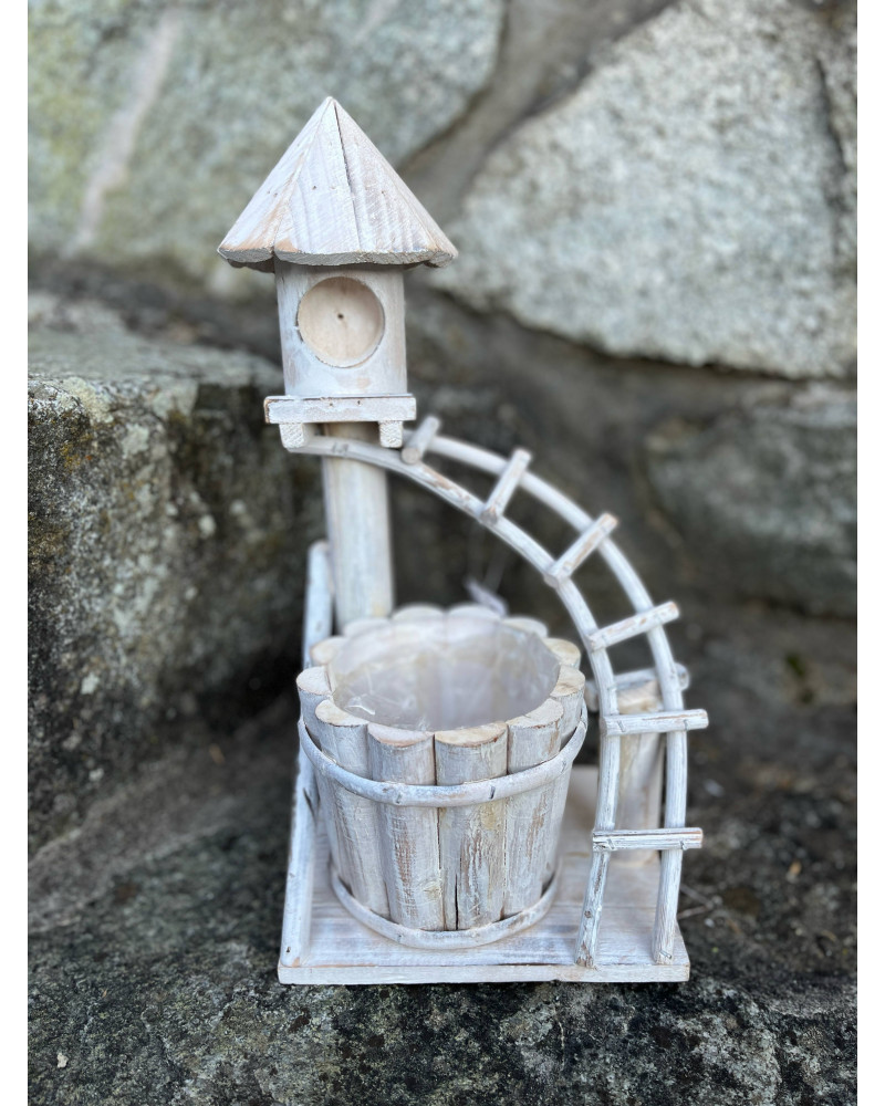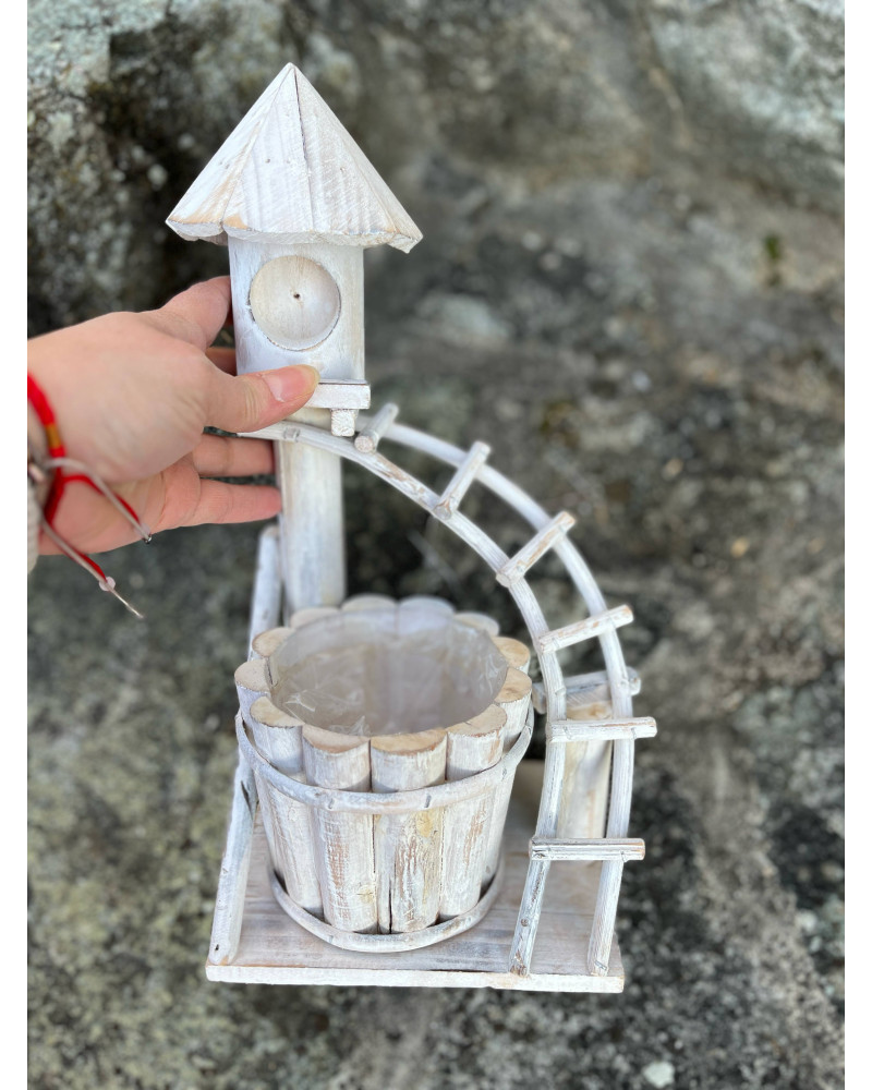 Netypický drevený kvetináč v bielej farbe, s rebríkom a s vežičkou. V kvetináči je igelit.