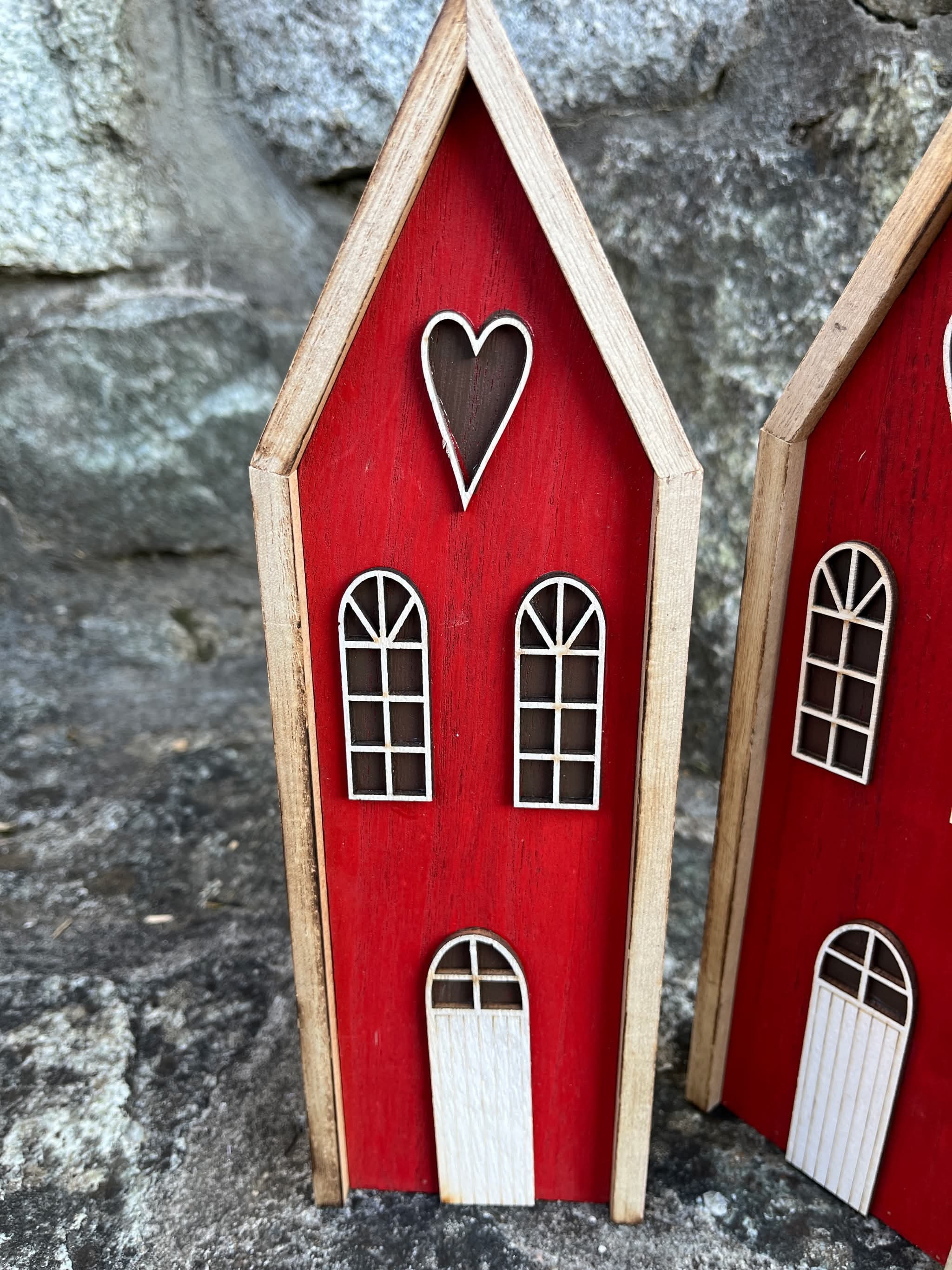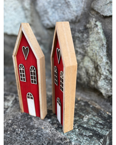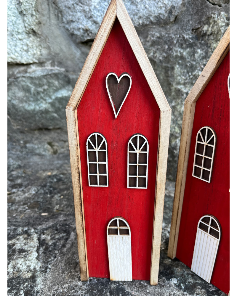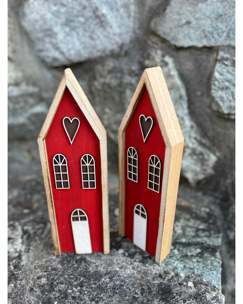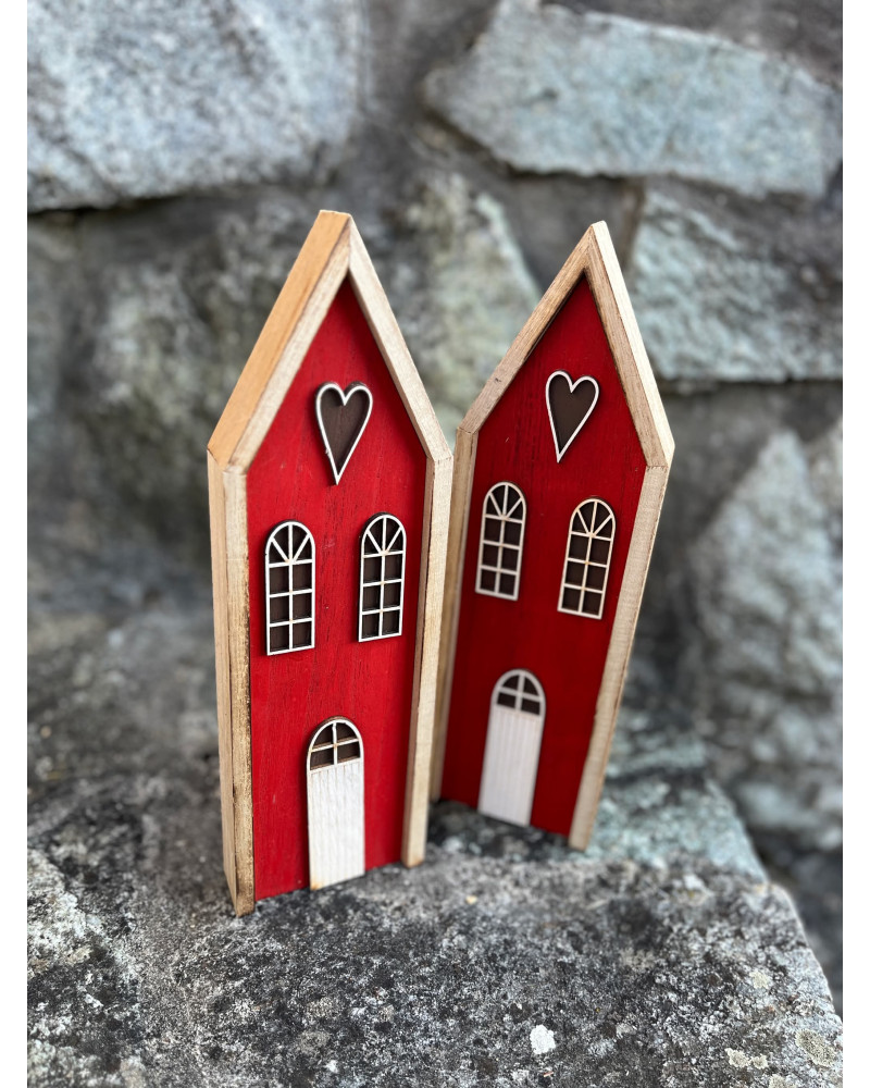 Drevený červený domček so srdiečkom aktuálny na celoročné dekorovanie.