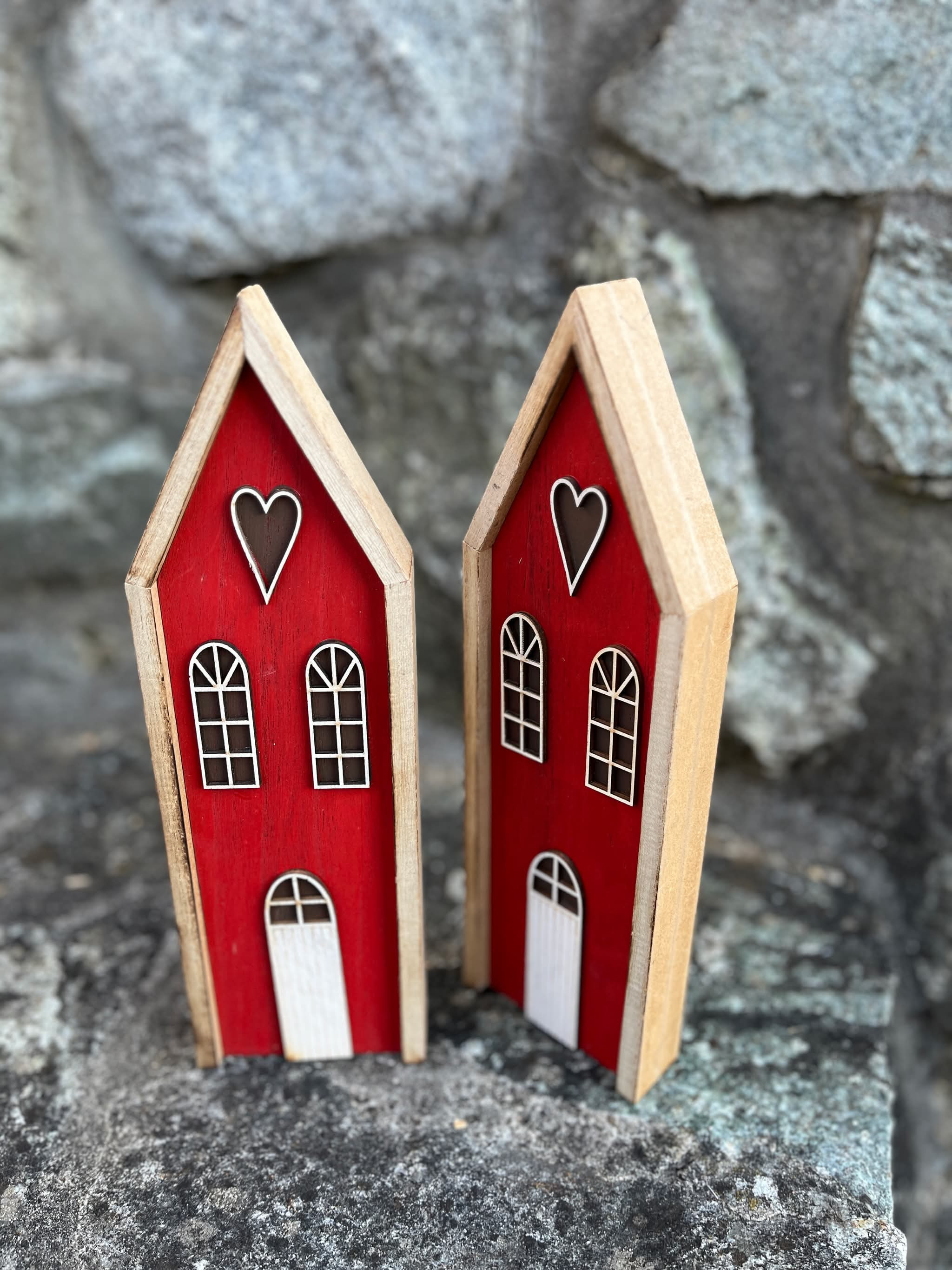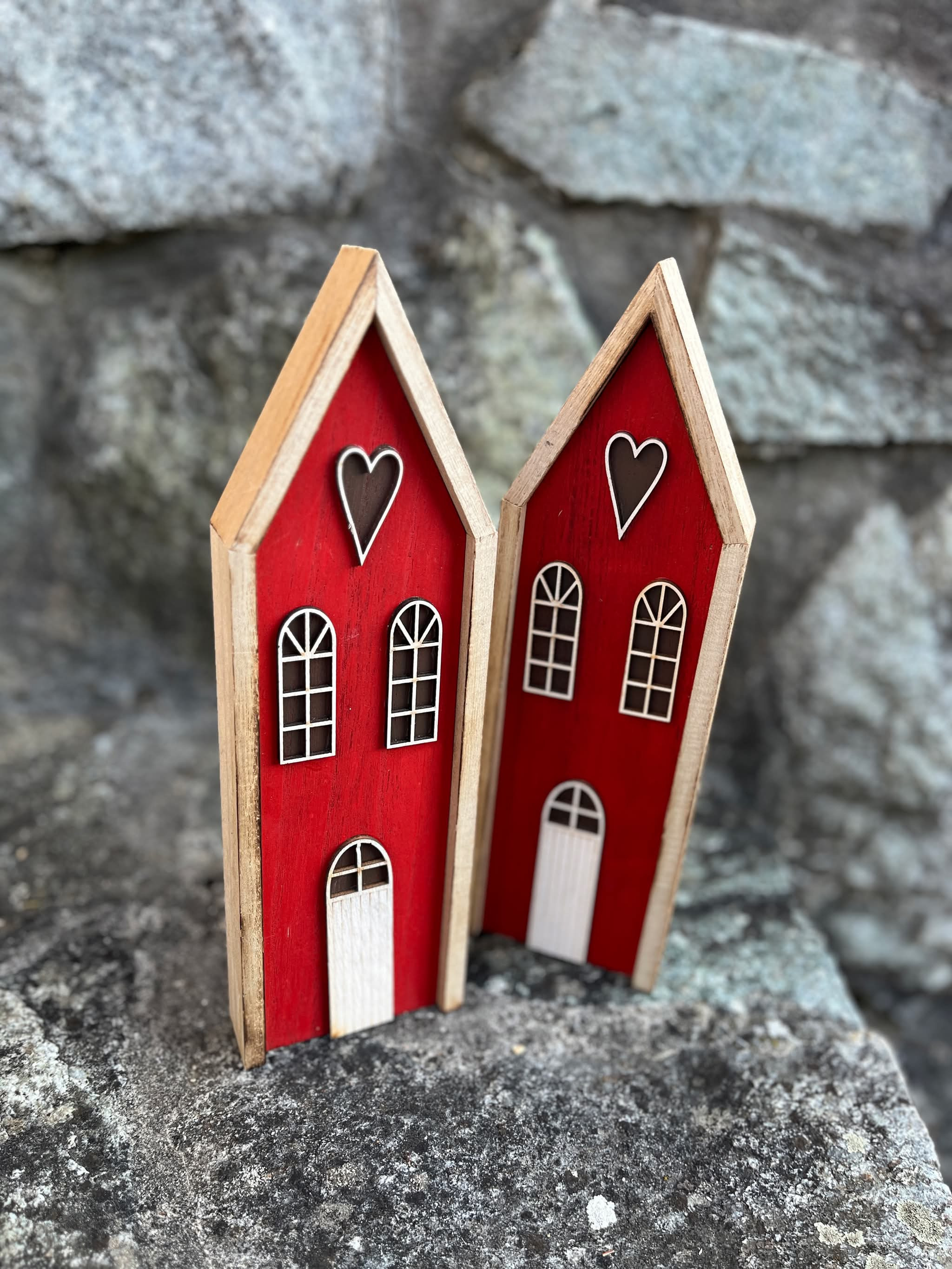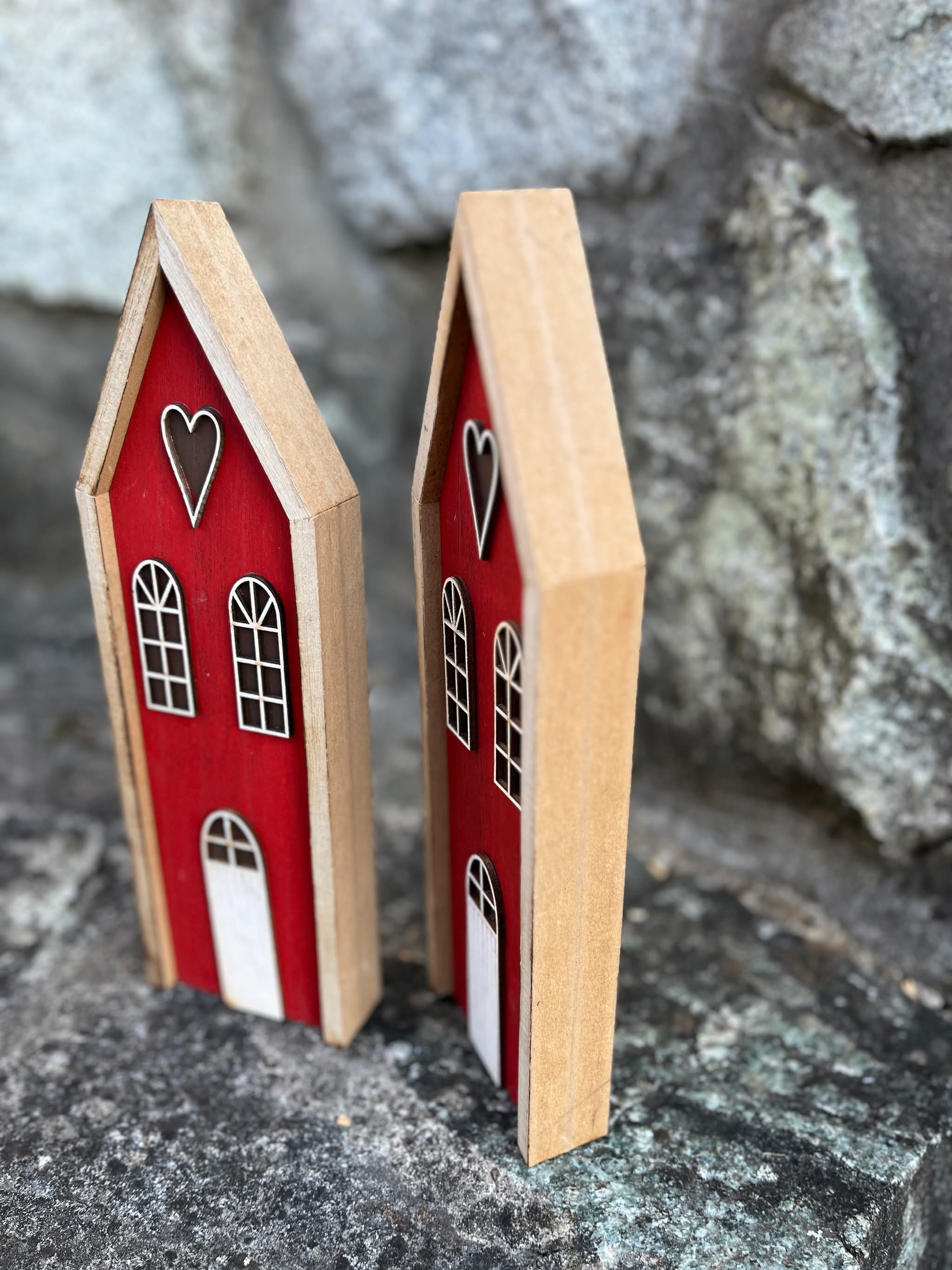 Drevený červený domček so srdiečkom aktuálny na celoročné dekorovanie.