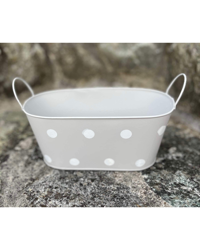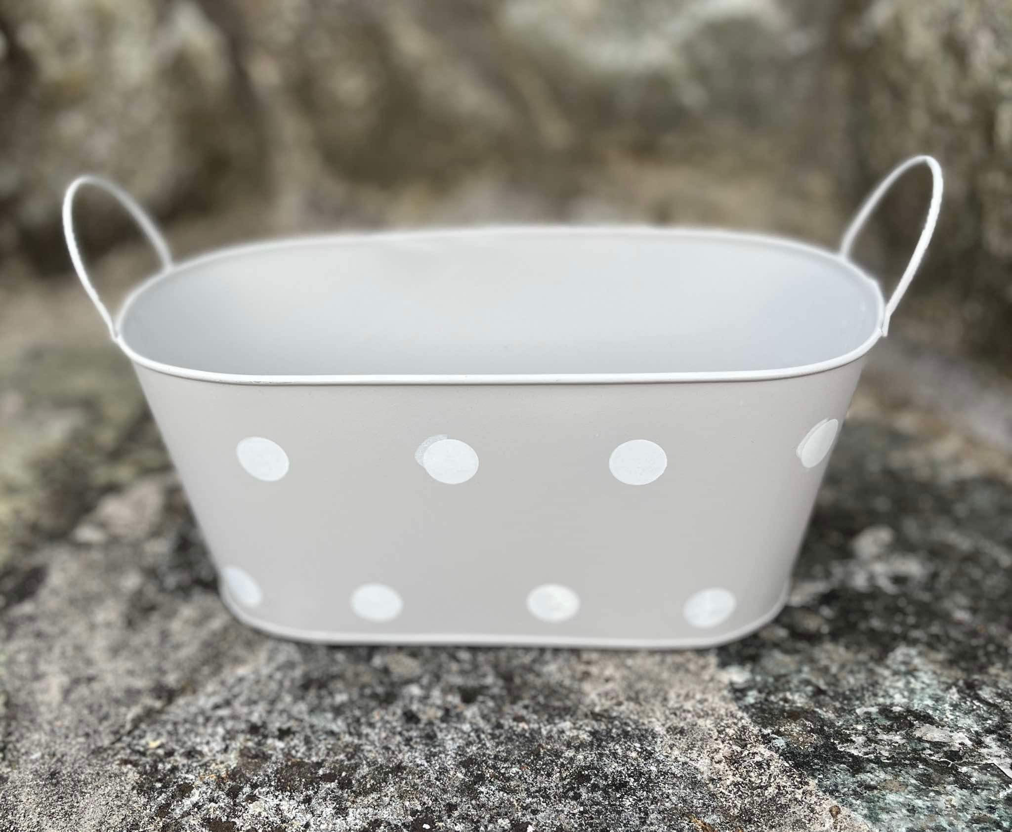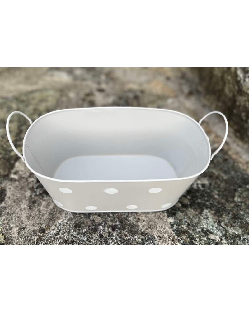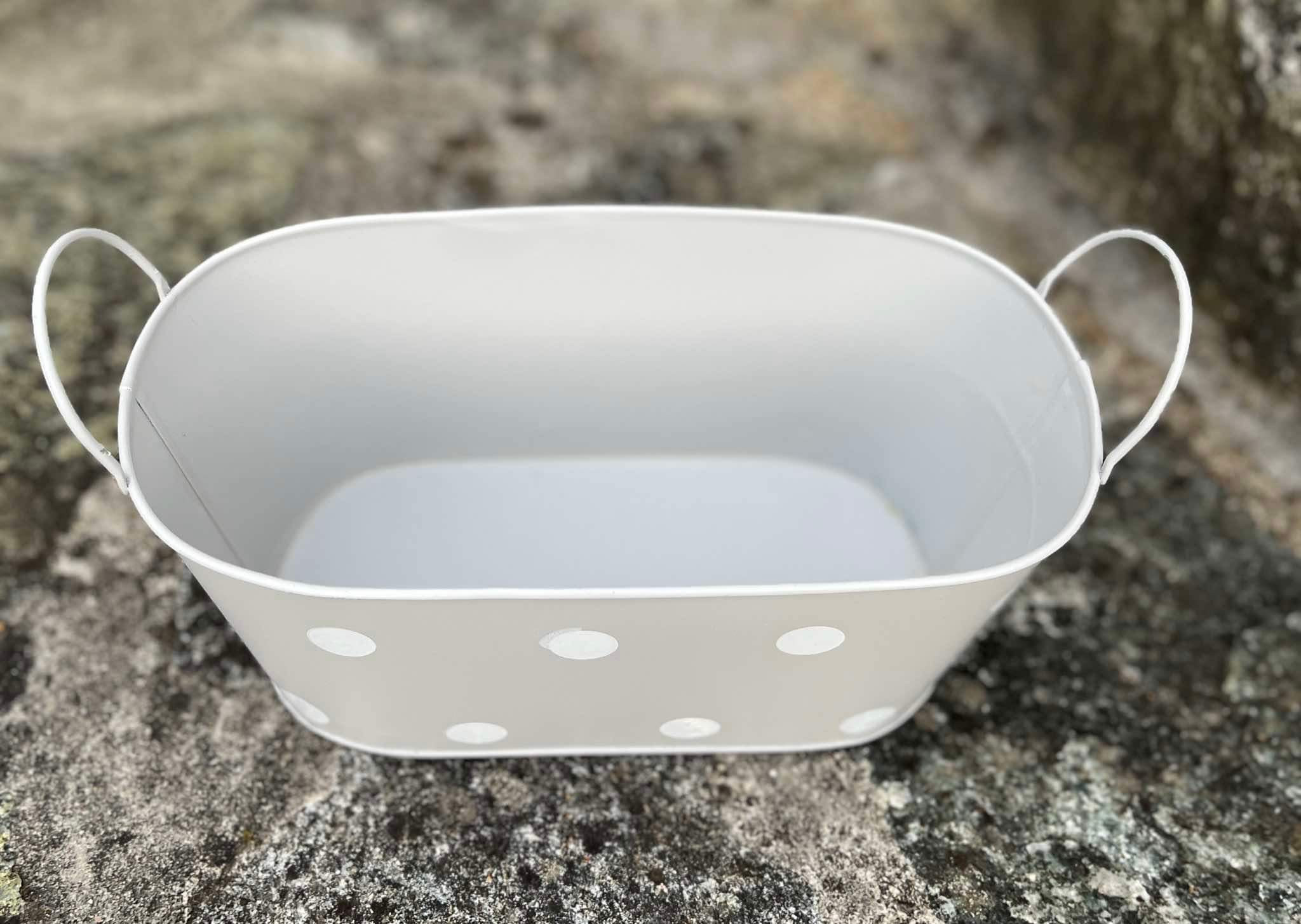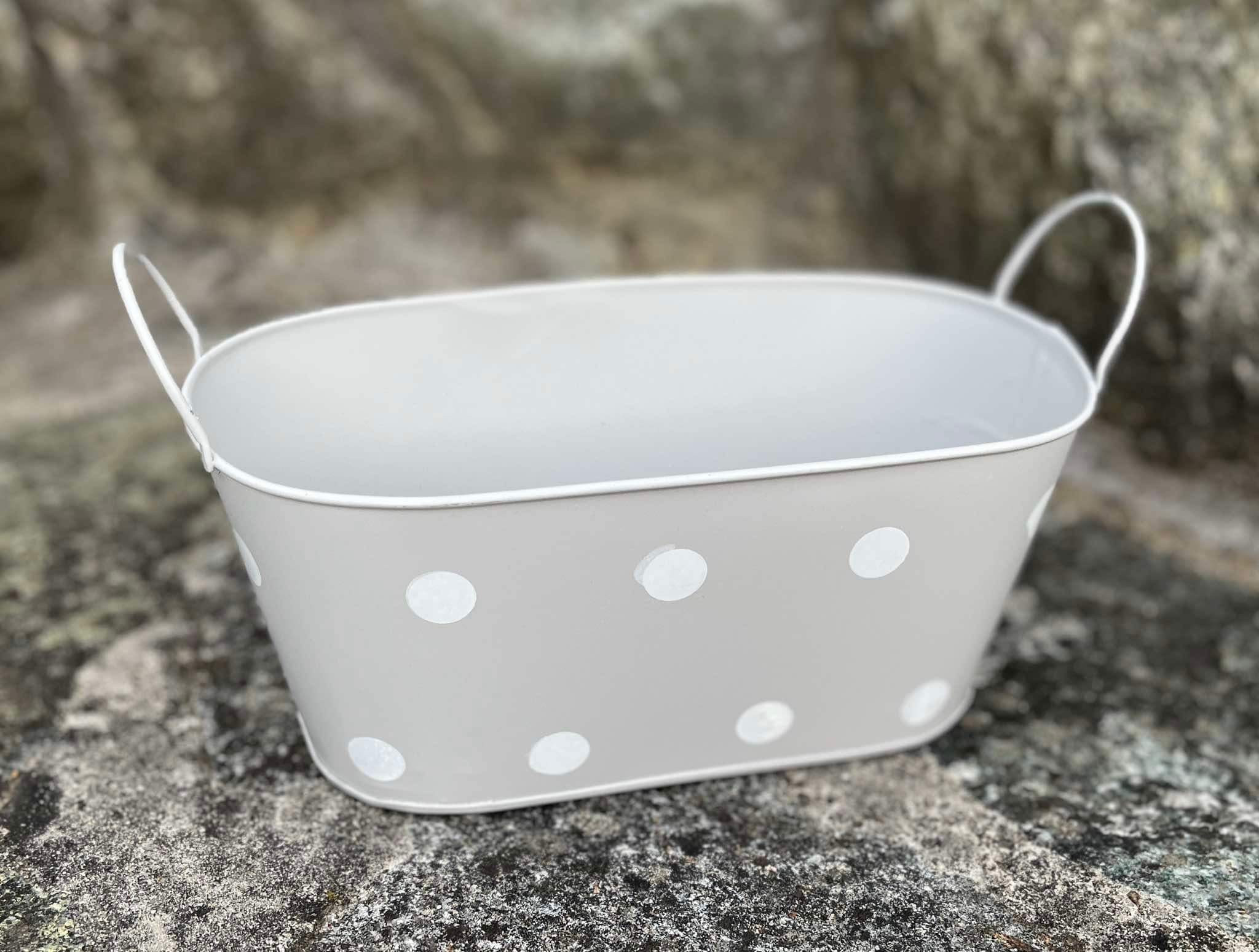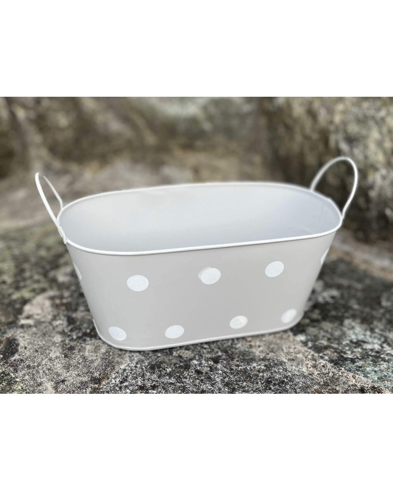 Sivá plechová oválna nádoba s bielymi bodkami.