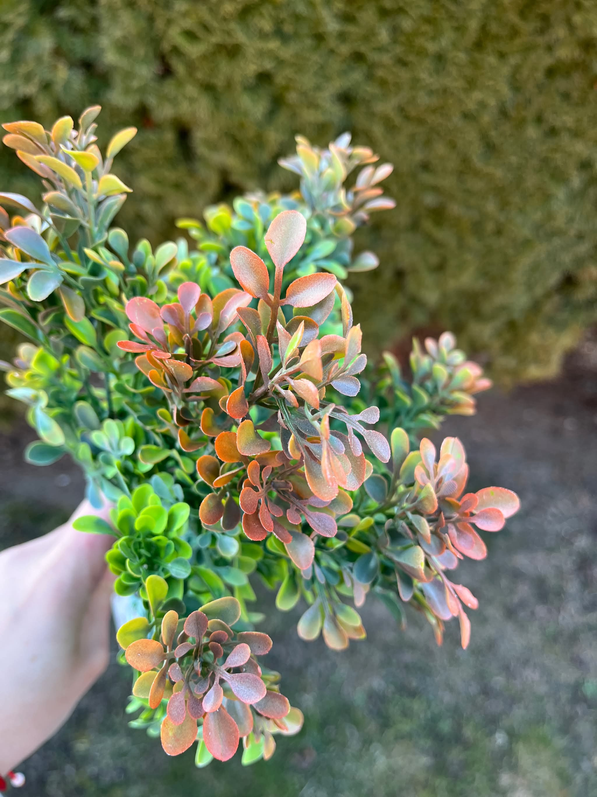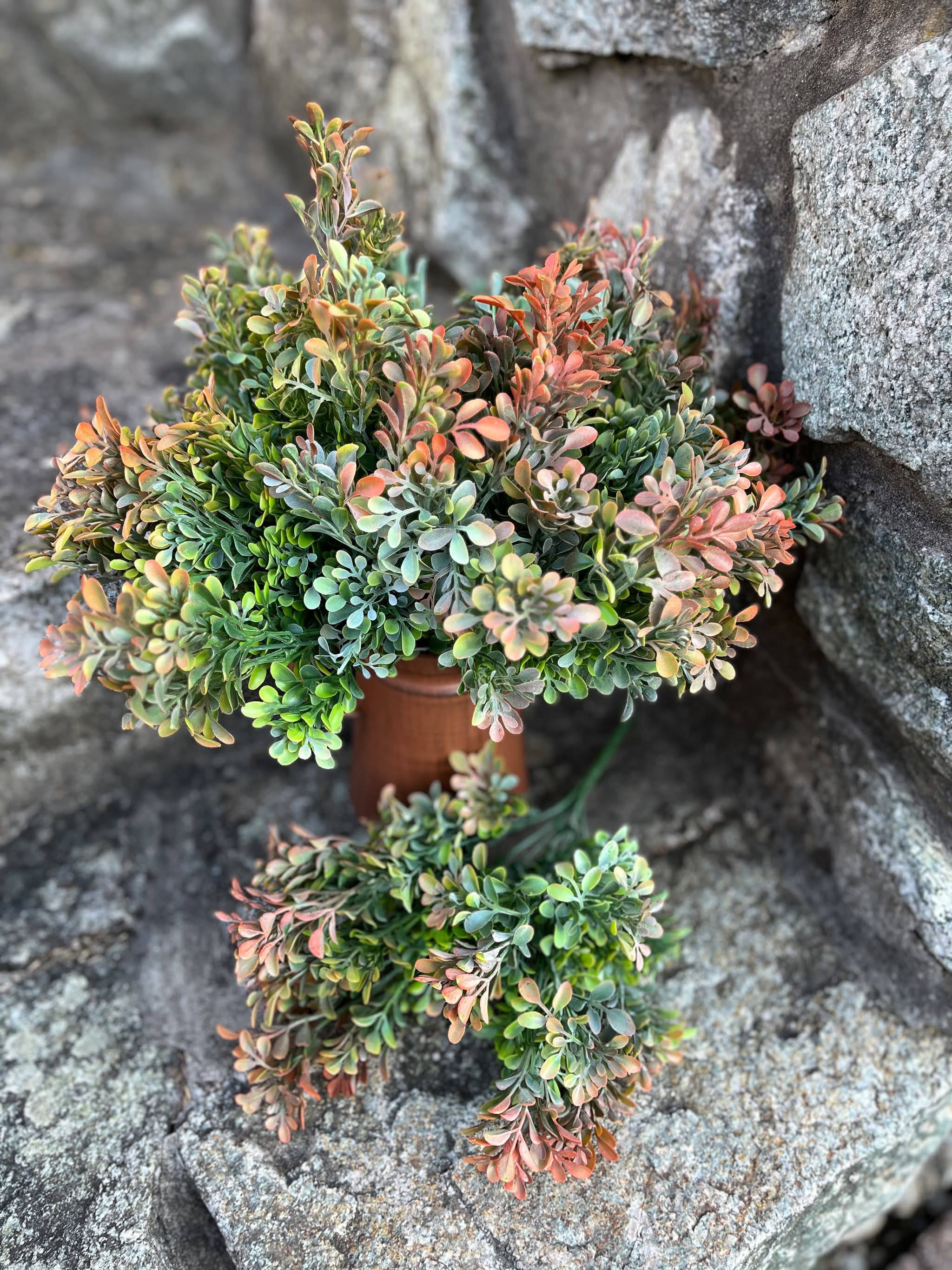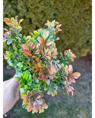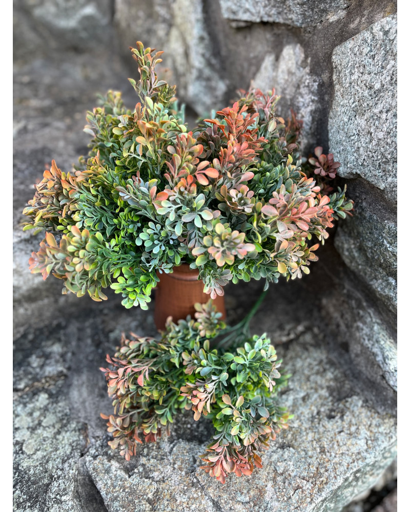 Jemný trs drobných lístkov v melírovanej zeleno oranžovej farbe.