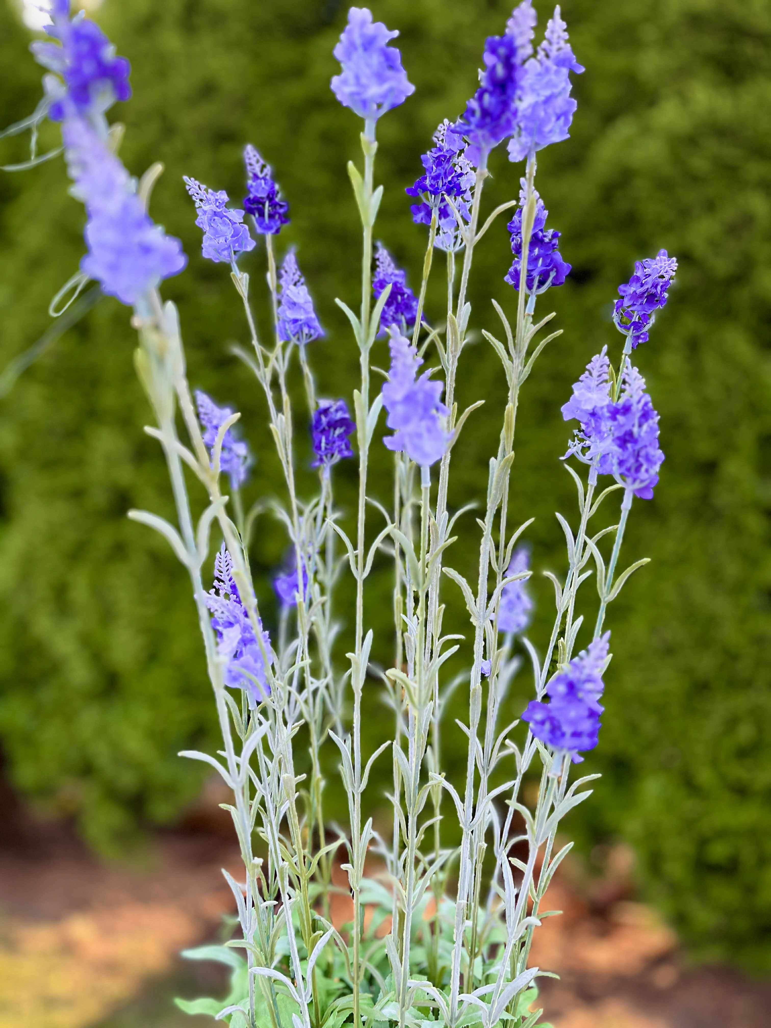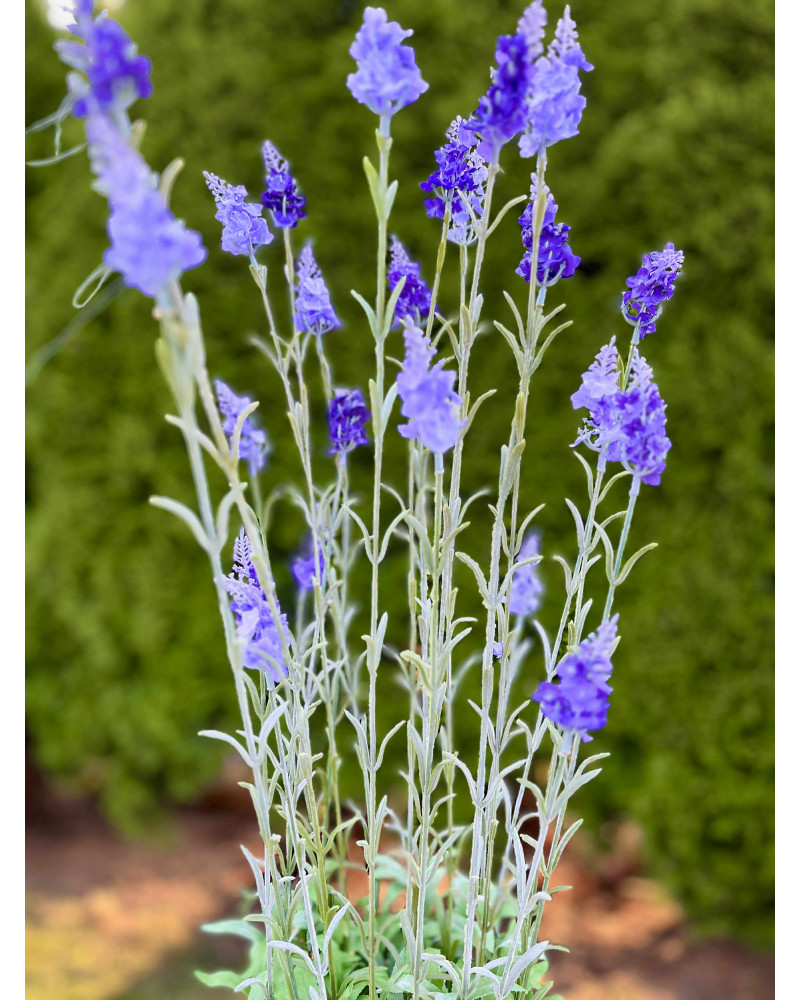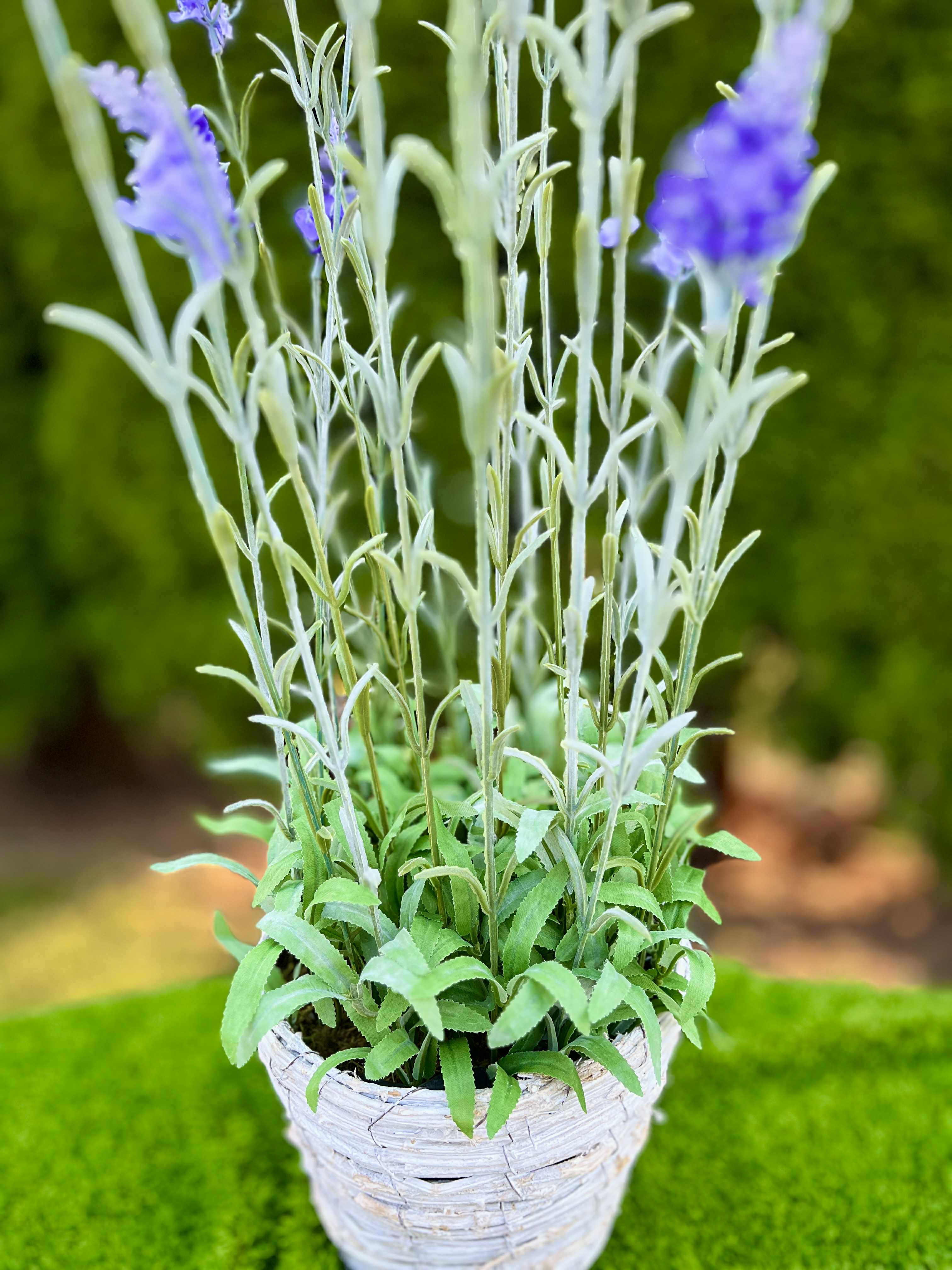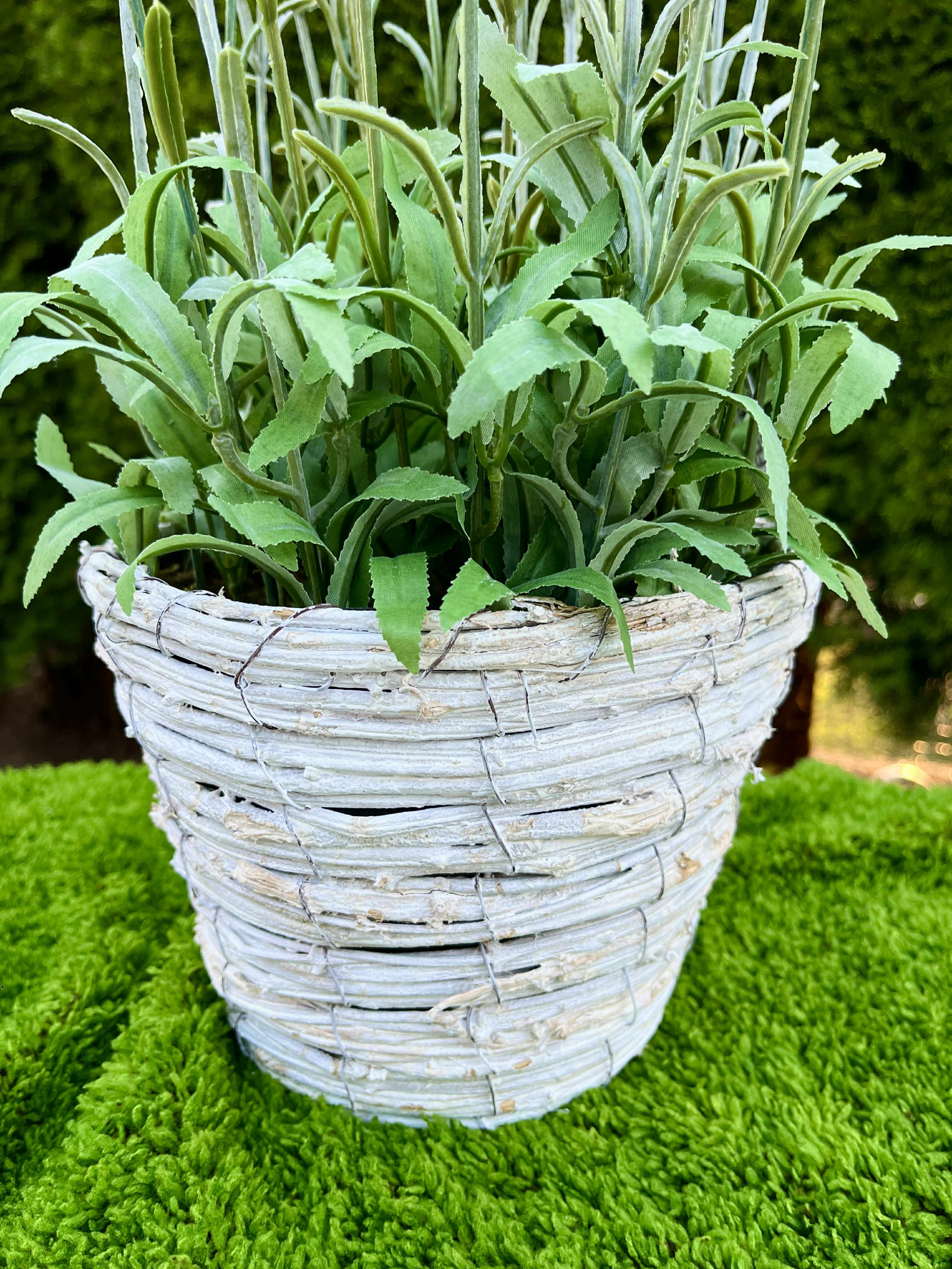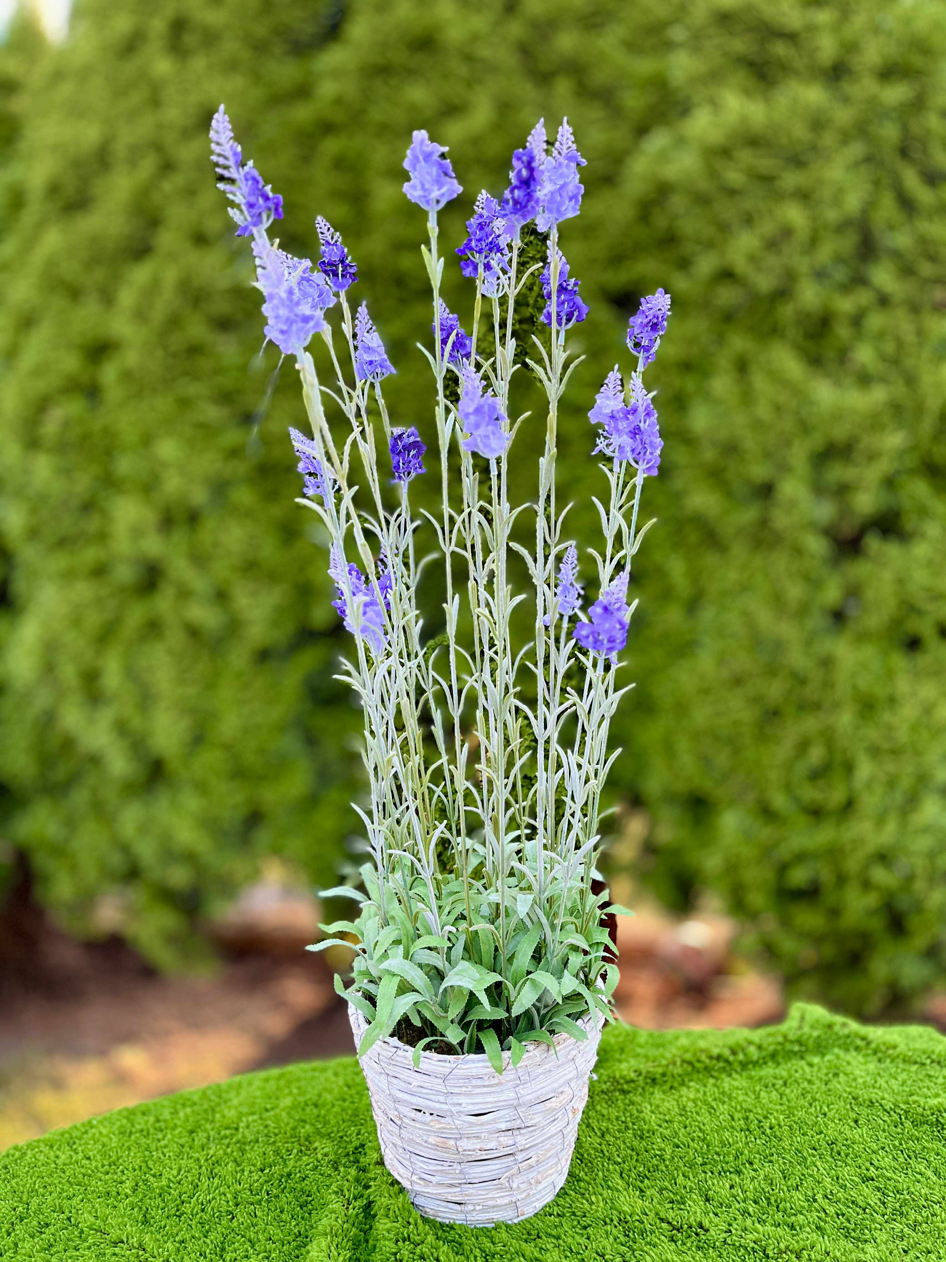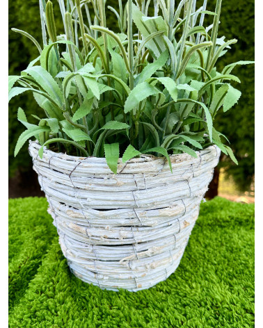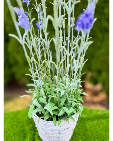 Nádherná levanduľa v bielom prútenom košíku, je zaťažená, takže je vhodná aj ku vchodovým dverám či na cintorín. Výška 78 cm.