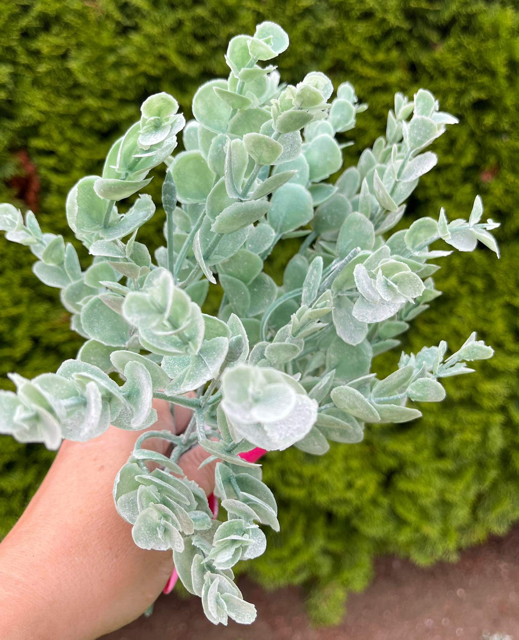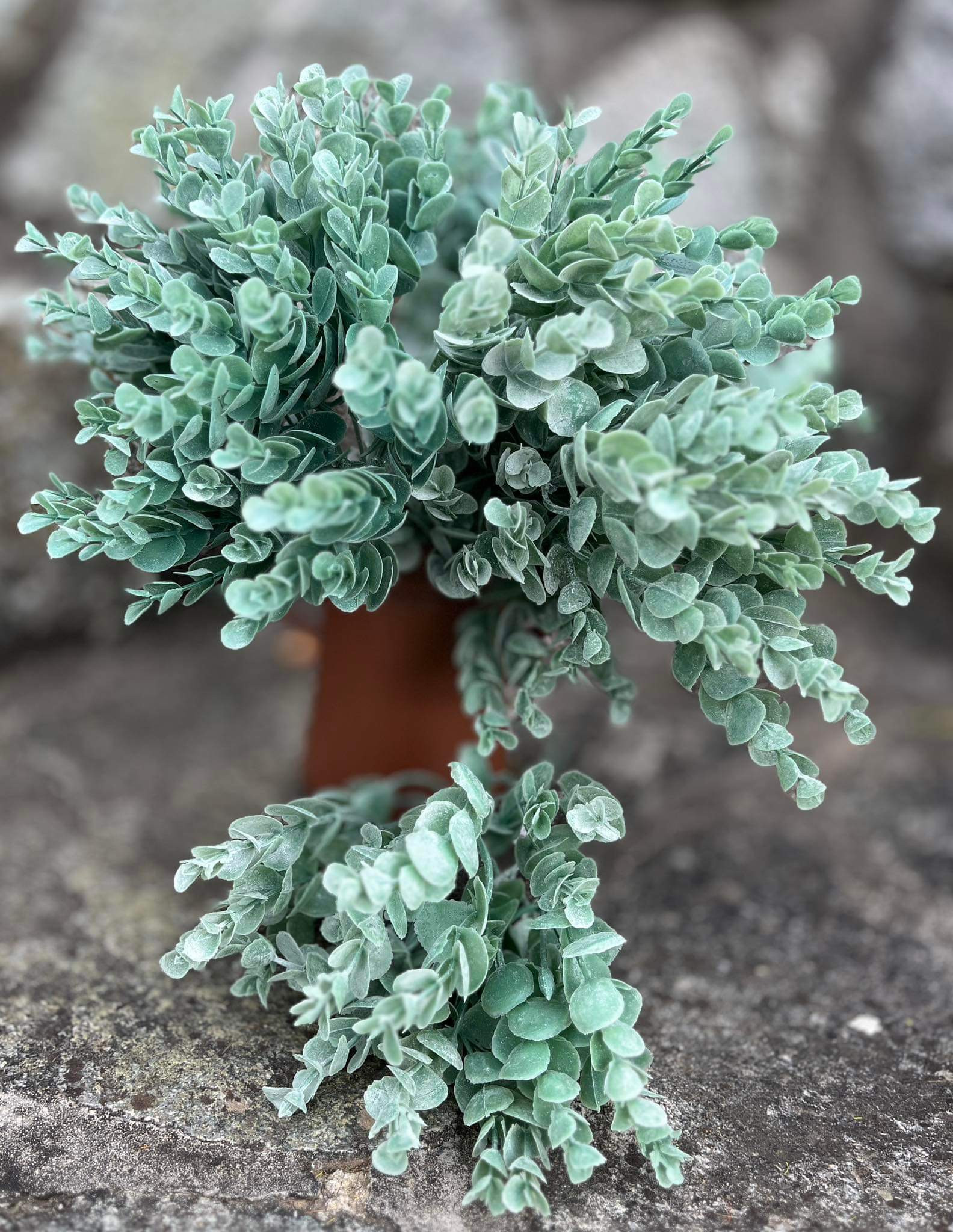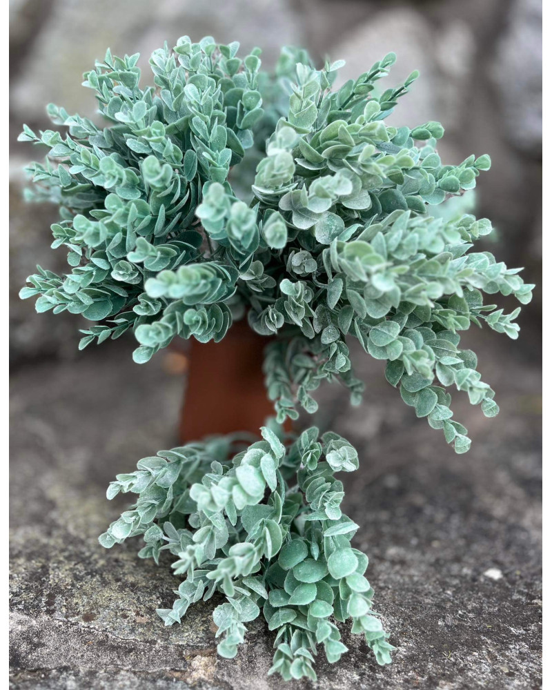 Trs zelených zasnených poprášených eukalyptových lístkov, výška 32 cm, 5 stoniek