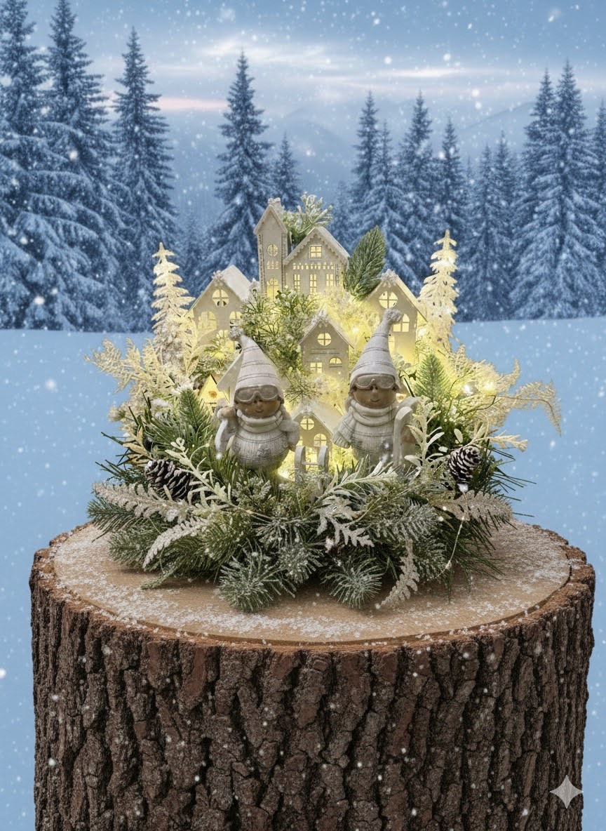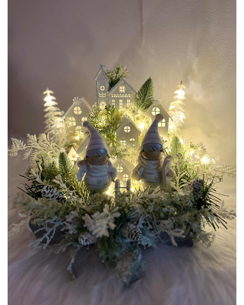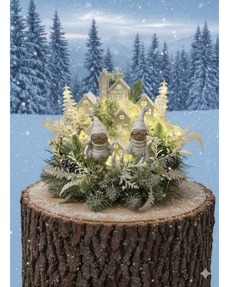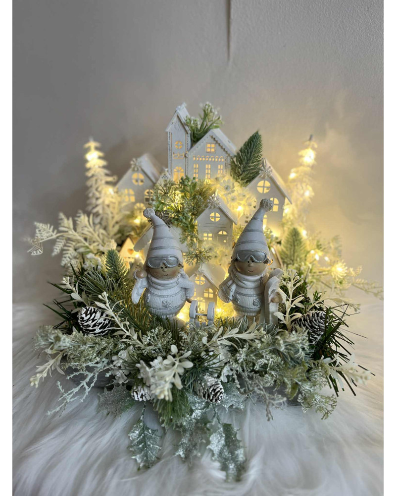 Zimná dedinka s dvoma bielymi lyžiarmi, s drevenými domčekmi, so zasneženou zeleňou. Je robená do sivého dreveného podnosu. Dedinka je podsvietená so svetielkami na baterky, ktoré sú súčasťou dedinky.