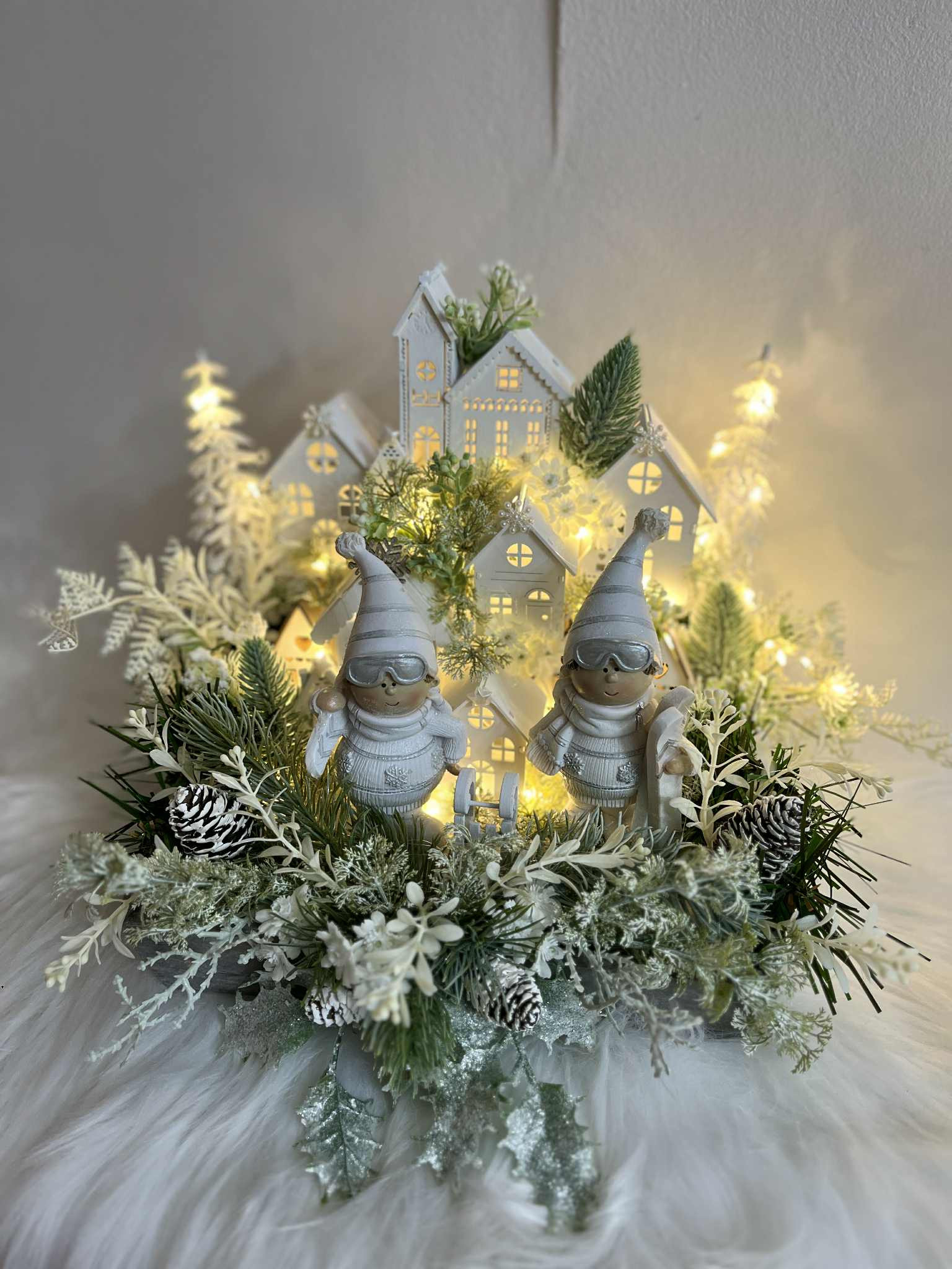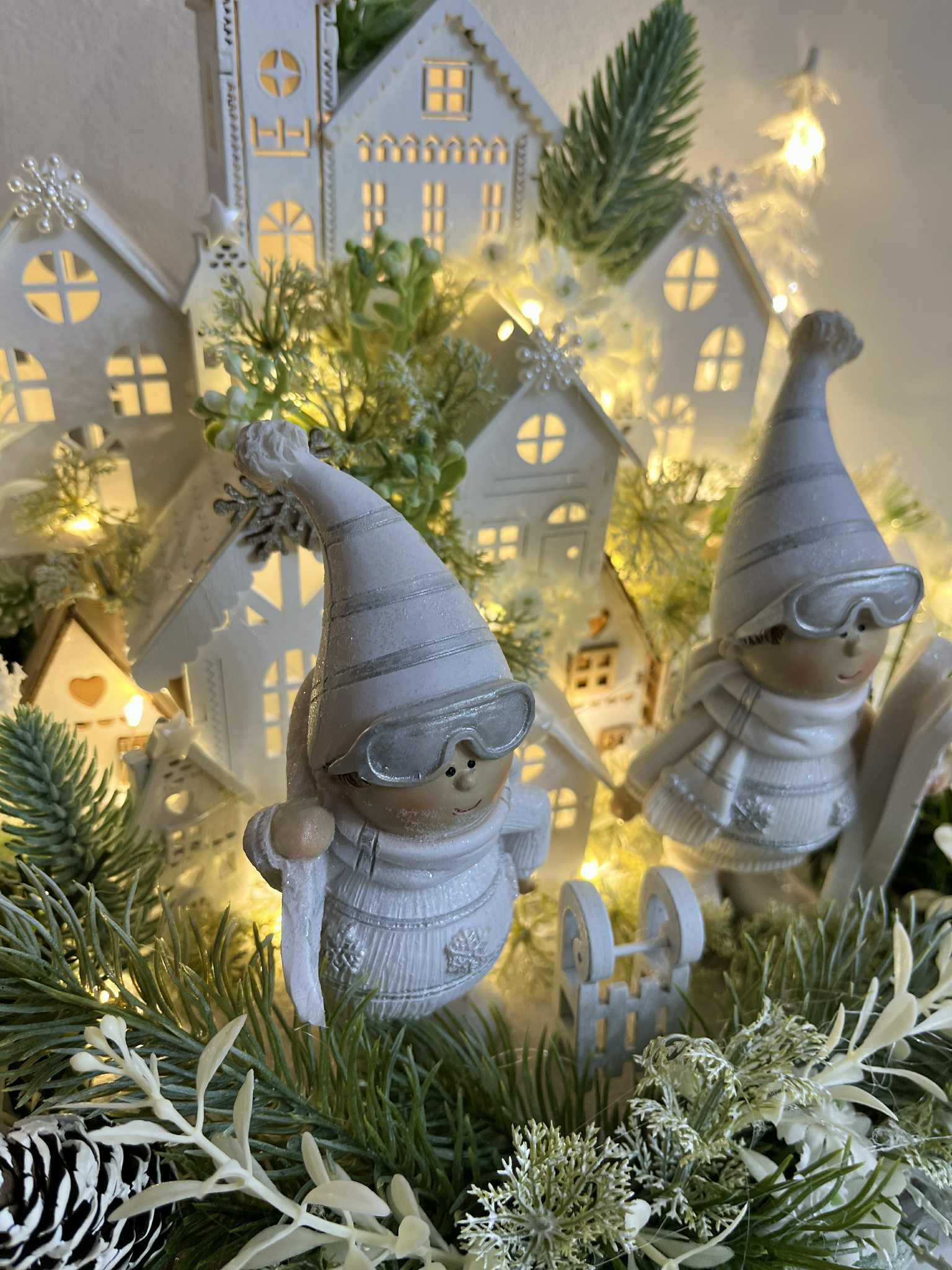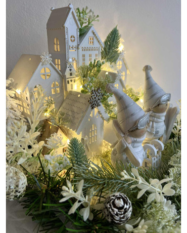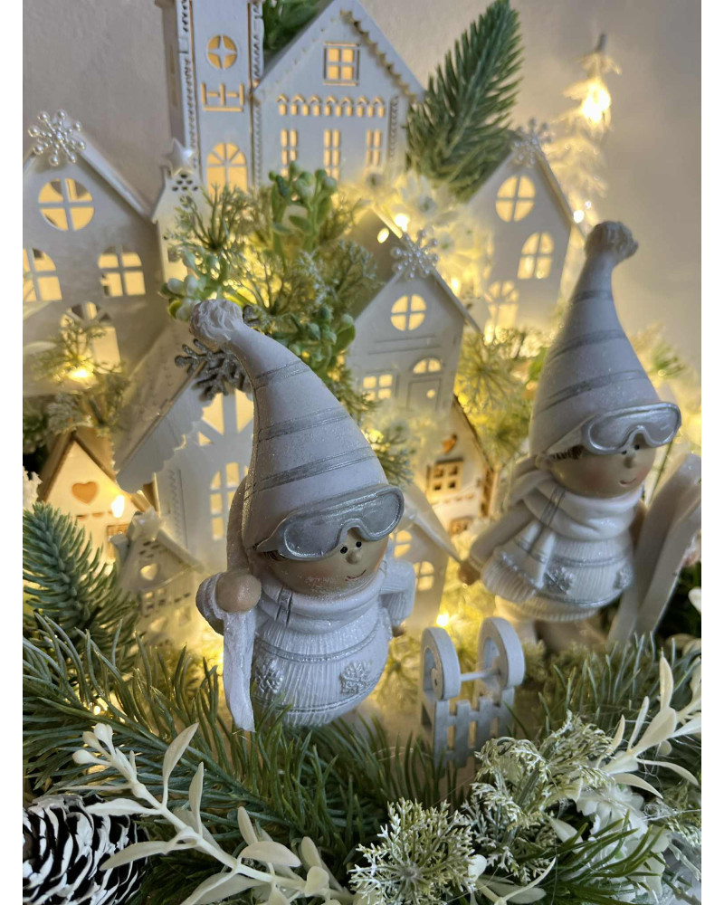 Zimná dedinka s dvoma bielymi lyžiarmi, s drevenými domčekmi, so zasneženou zeleňou. Je robená do sivého dreveného podnosu. Dedinka je podsvietená so svetielkami na baterky, ktoré sú súčasťou dedinky.