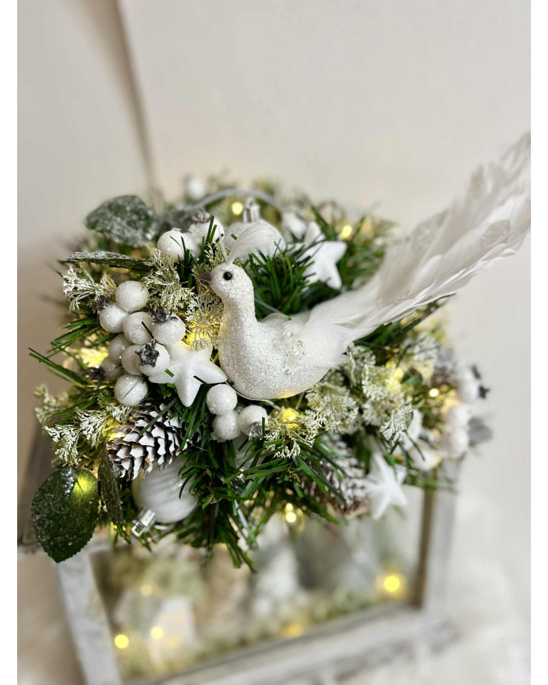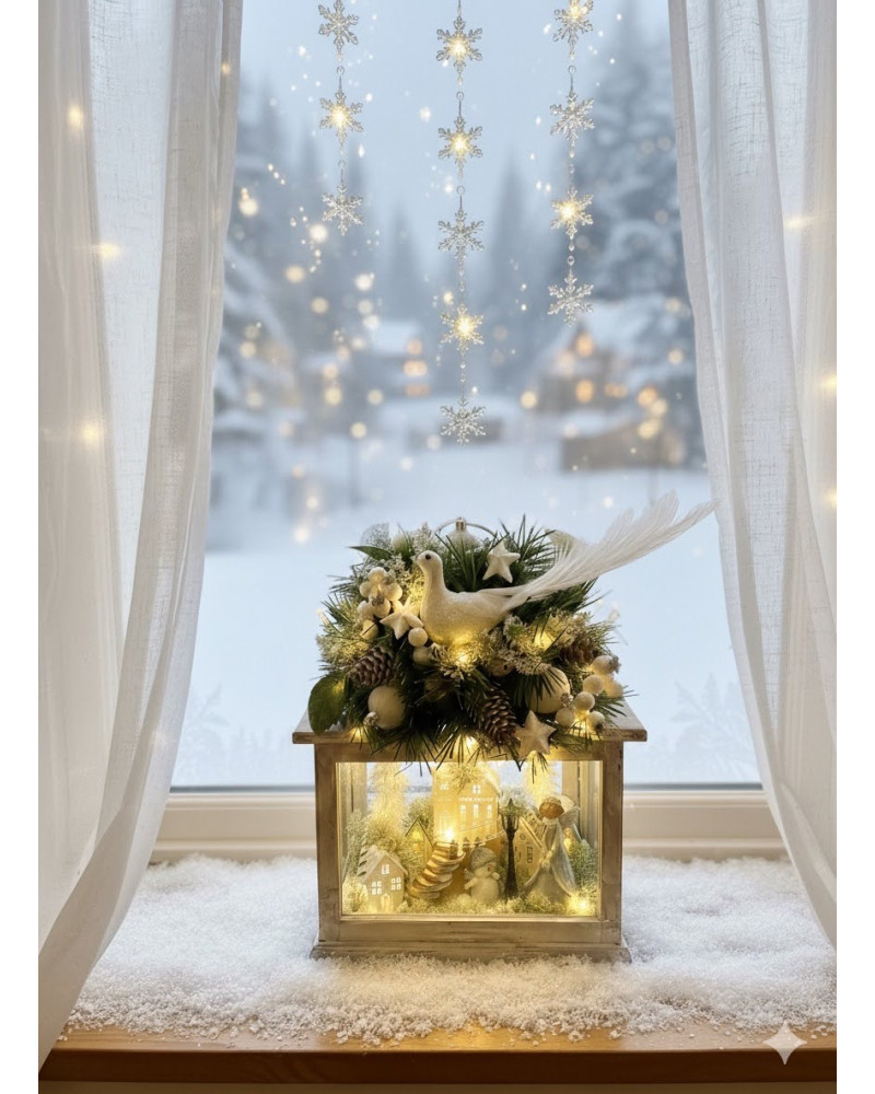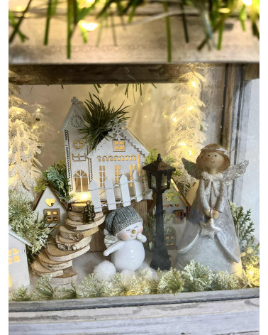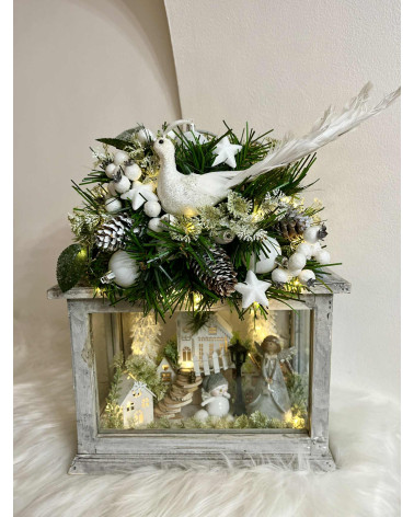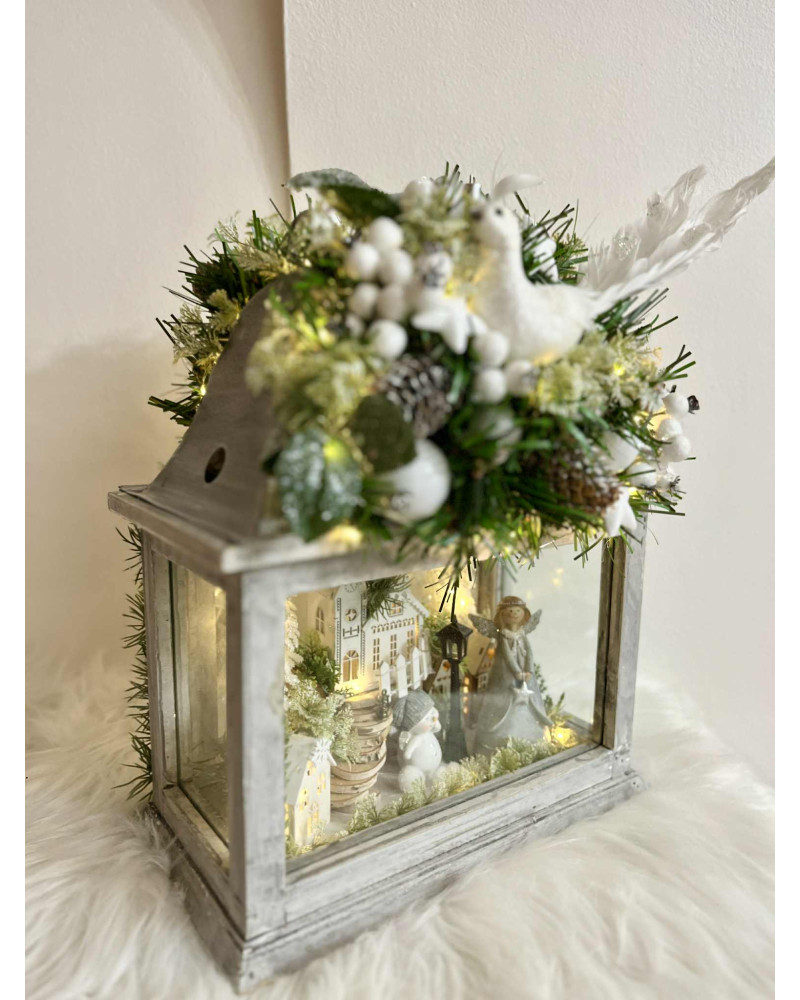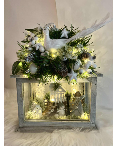 Drevená sivá lucerna so sklom, bohato zdobená, vo vnútri je anjelik so snehuliačikom. Celá lucerna je podsvietená svetielkami na baterky, ktoré sú súčasťou dekorácie. Veľmi pekná dekorácia na komódu či stolík.