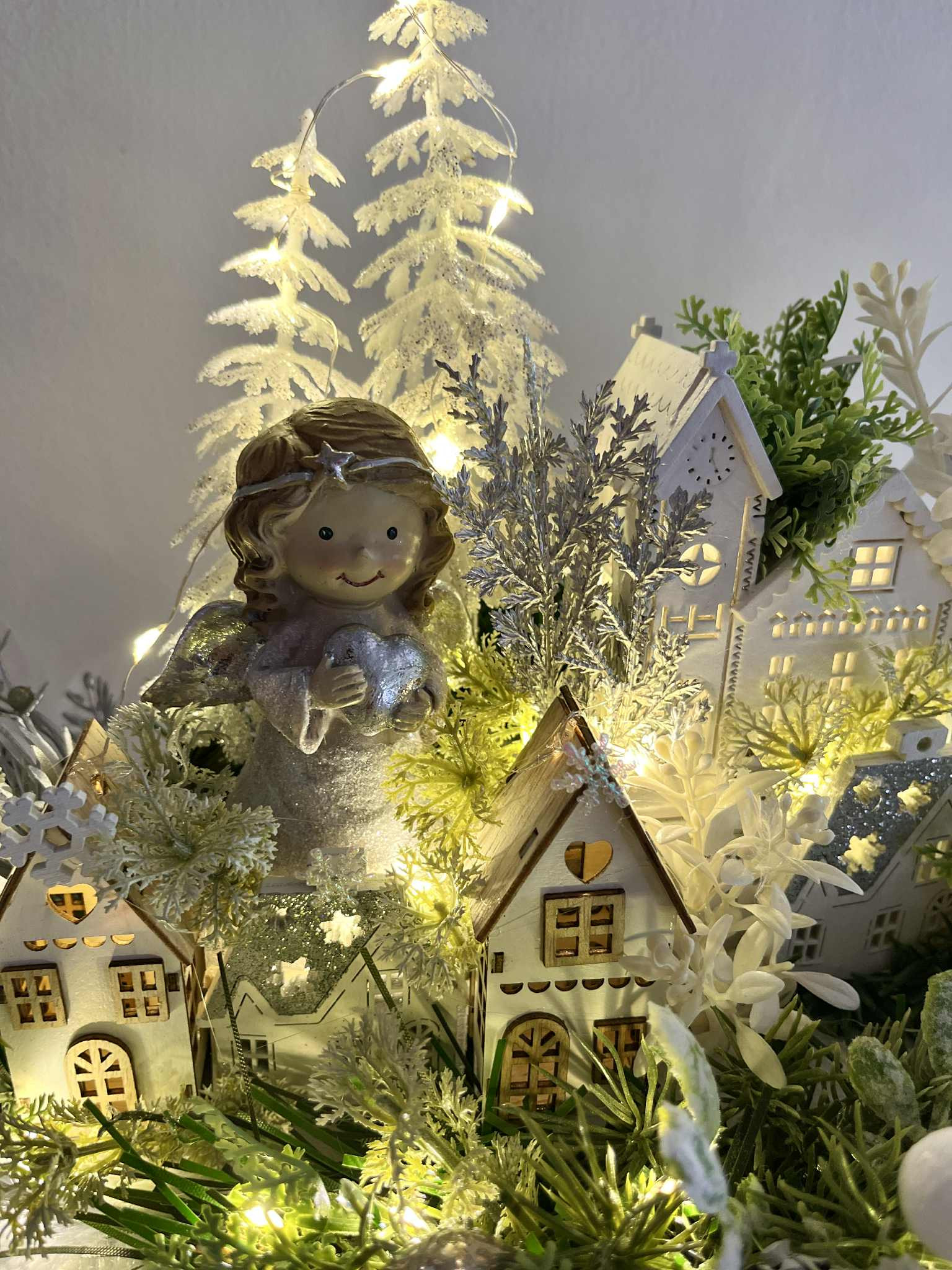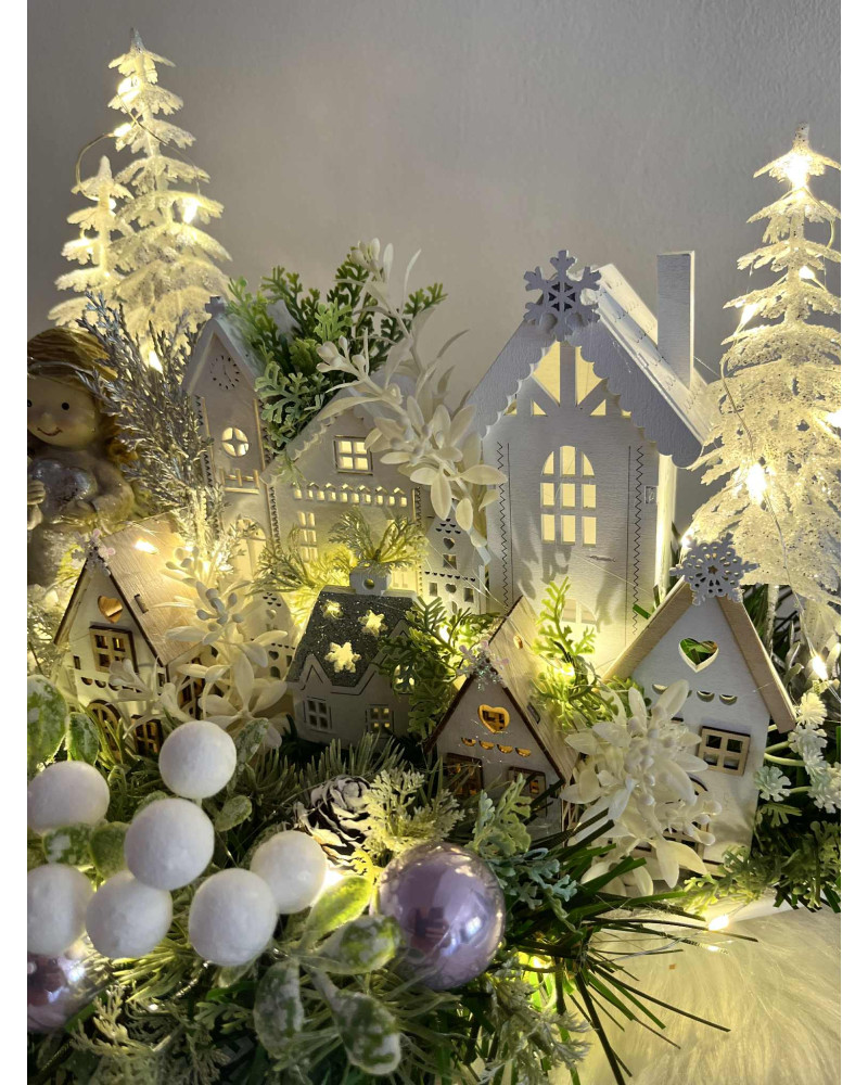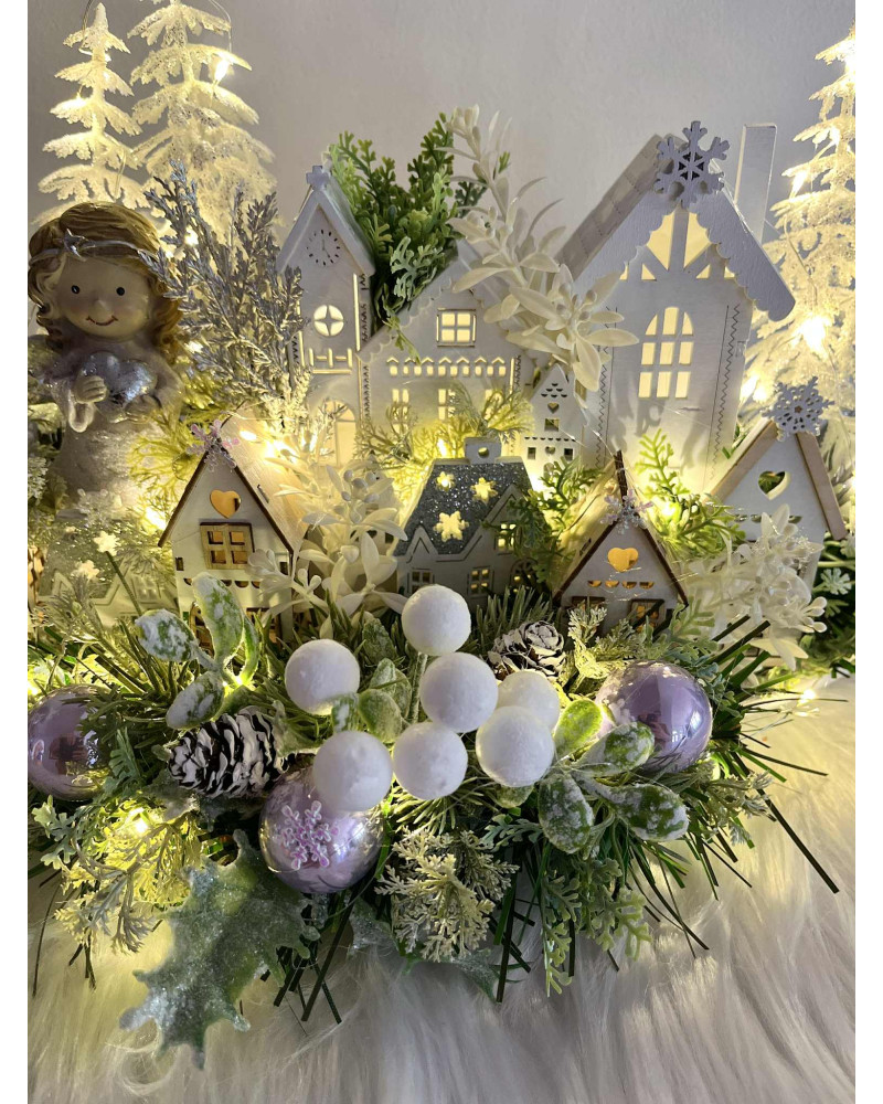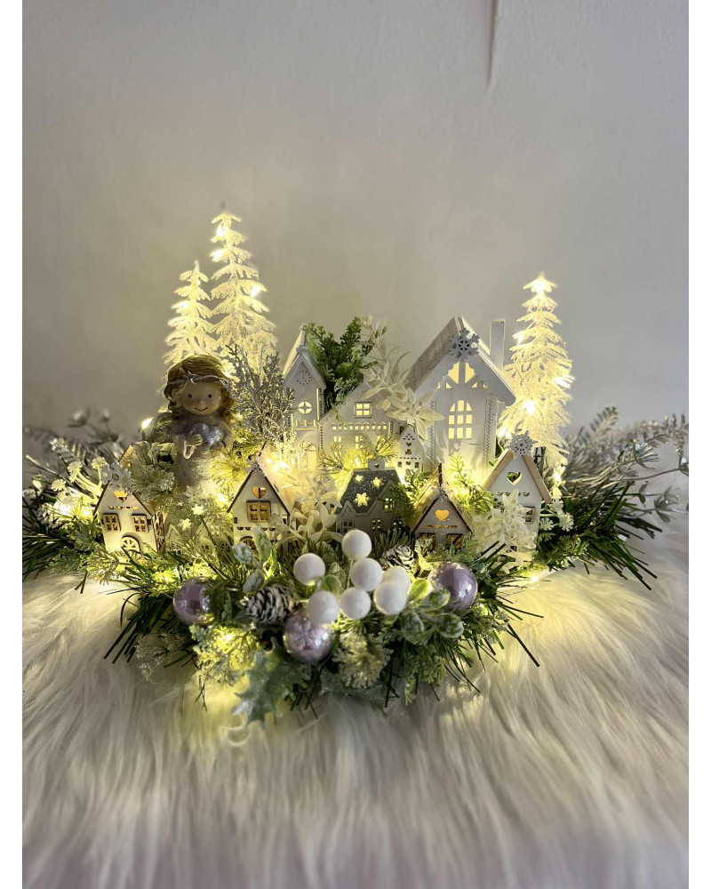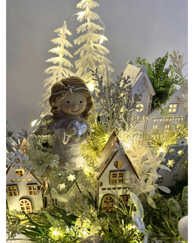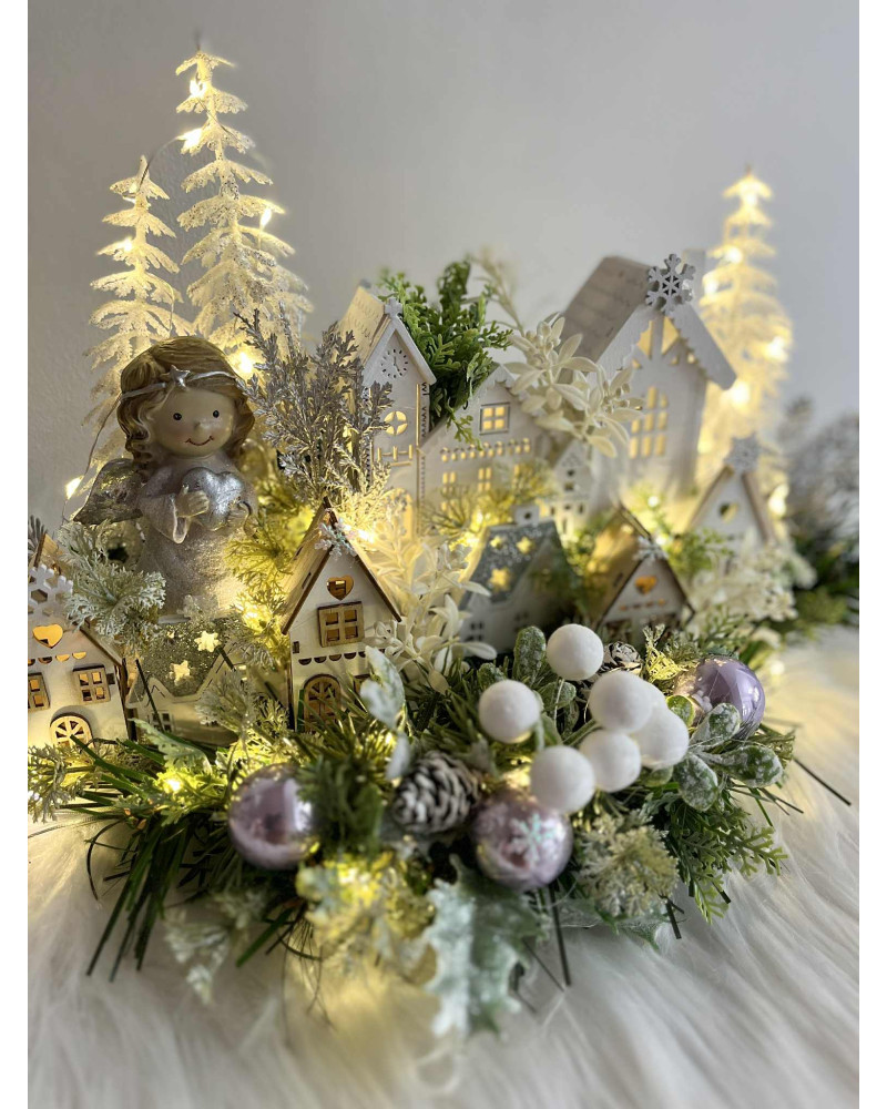 Zimná dedinka s anjelikom, v zimnej, zamrznutej a ľadovej zeleni, s drevenými domčekmi. Dedinka je podsvietená svetielkami na baterky, ktoré sú súčasťou dekorácie.