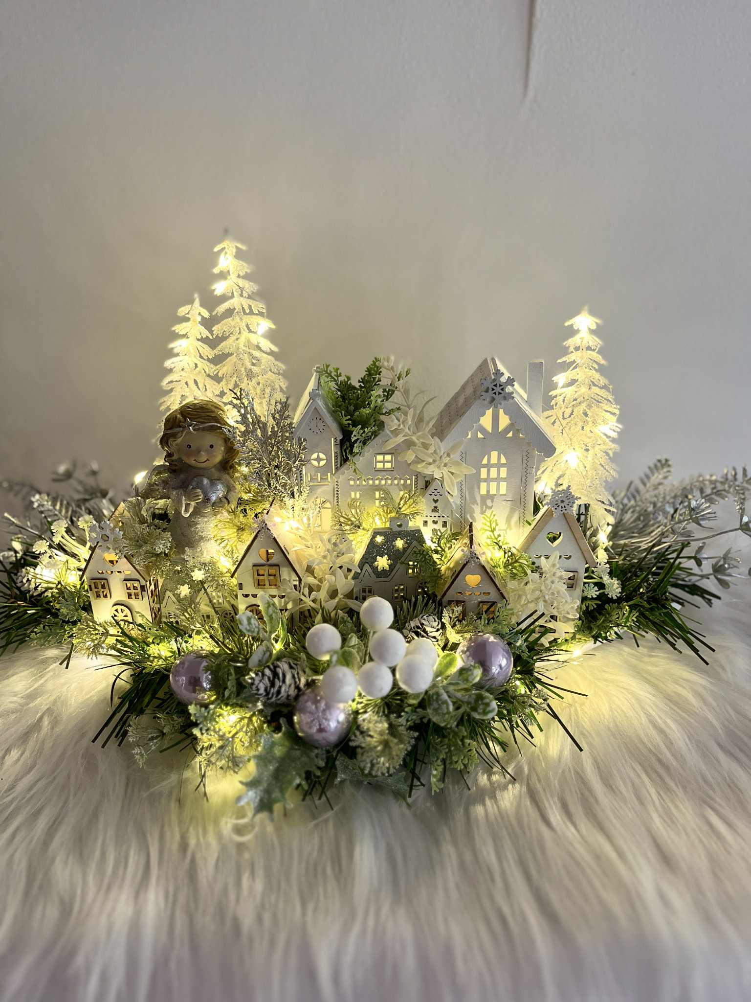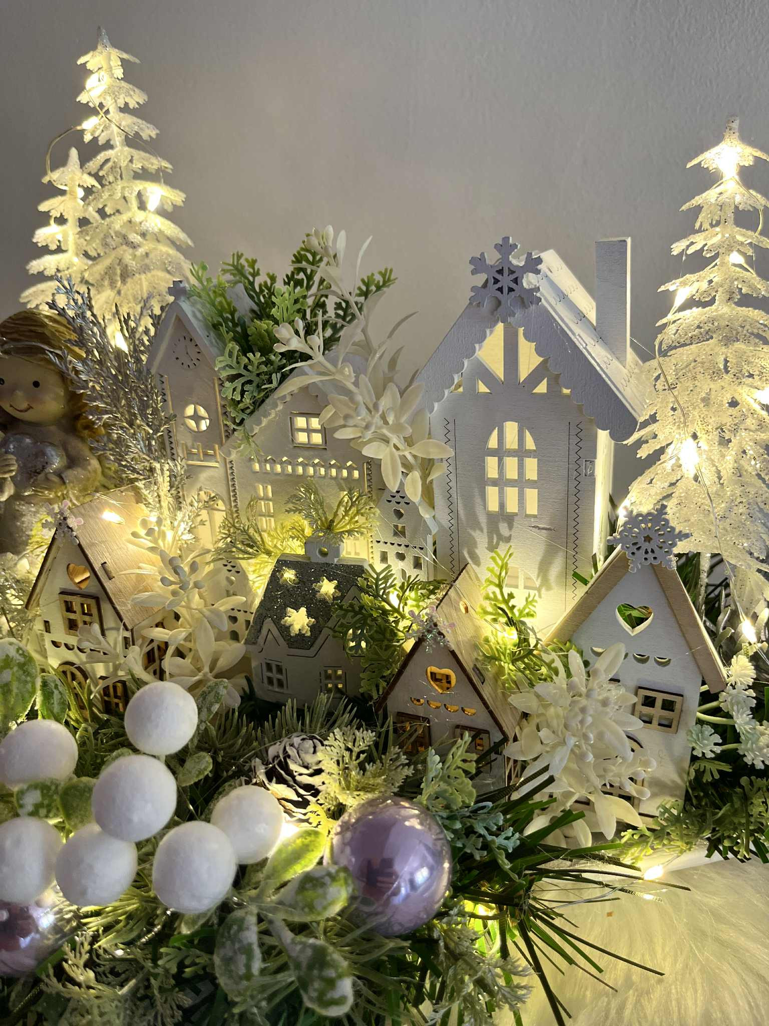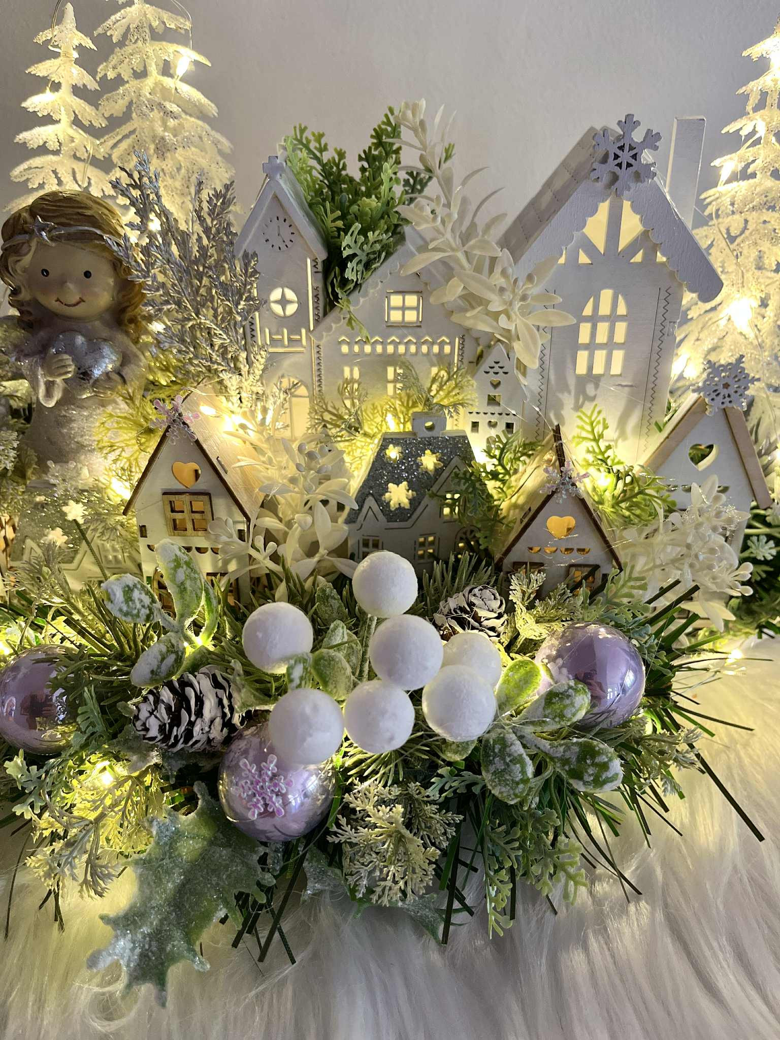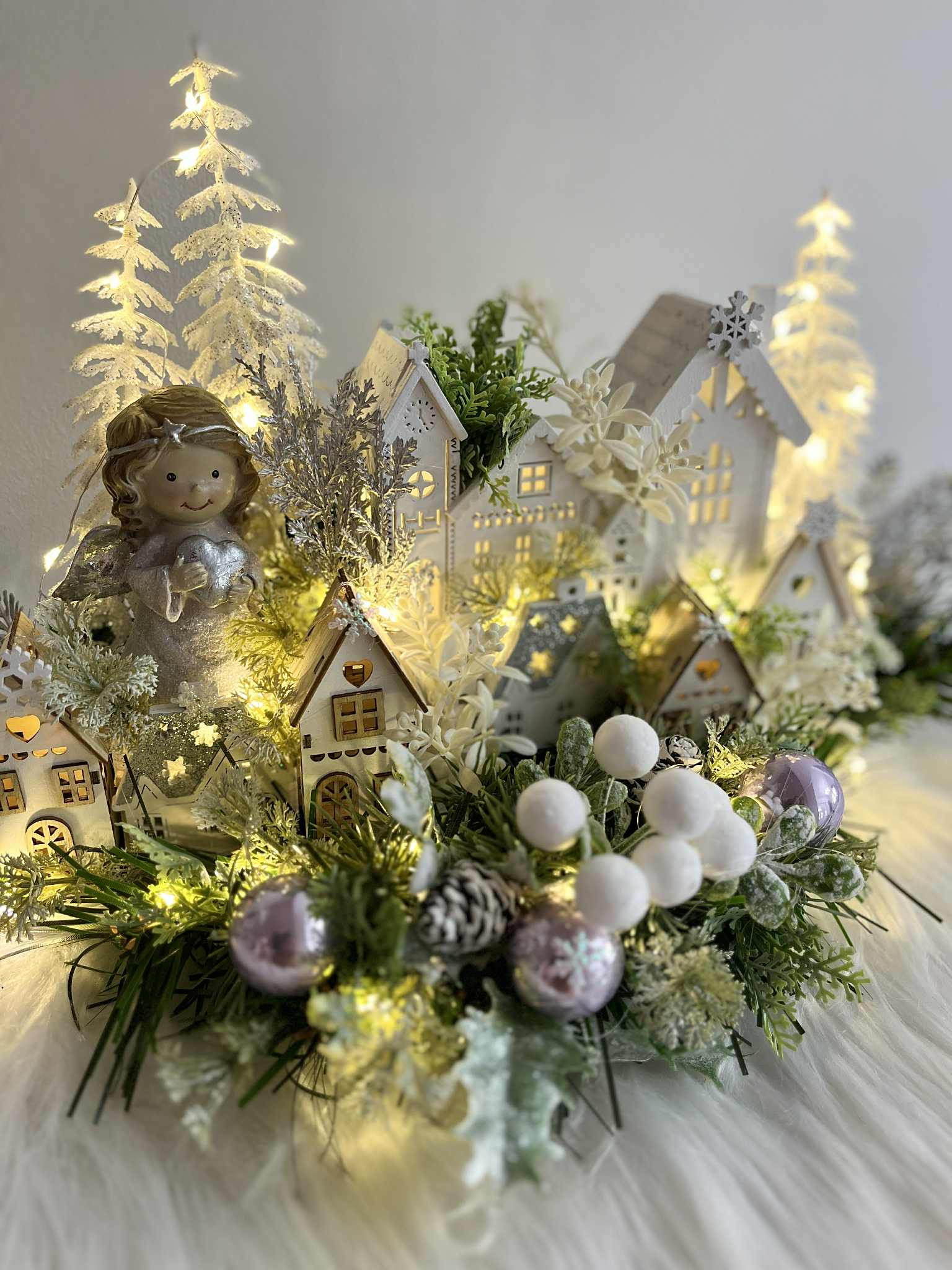 Zimná dedinka s anjelikom, v zimnej, zamrznutej a ľadovej zeleni, s drevenými domčekmi. Dedinka je podsvietená svetielkami na baterky, ktoré sú súčasťou dekorácie.