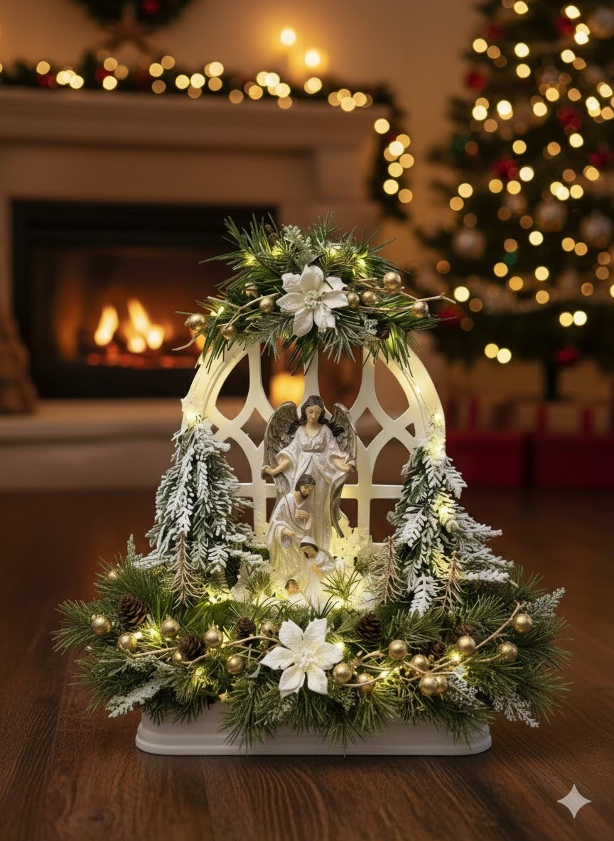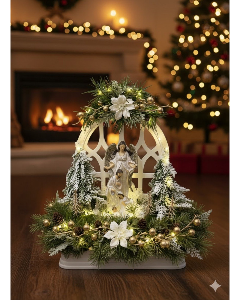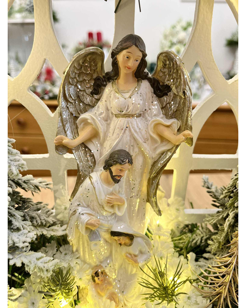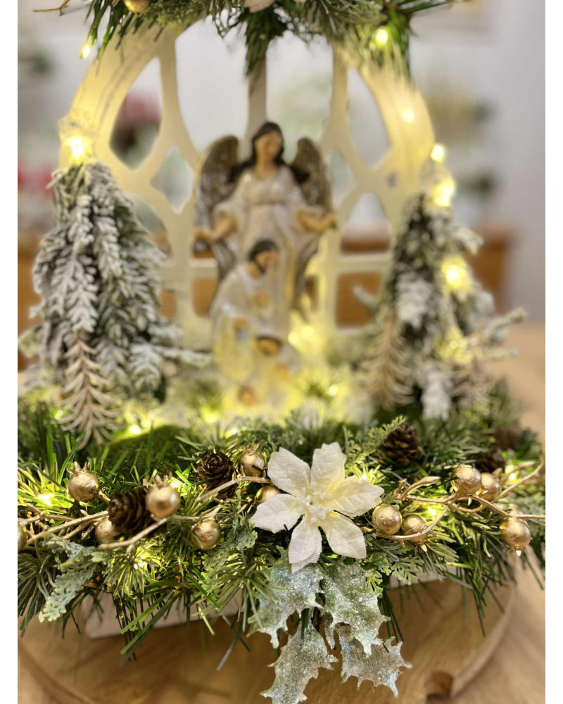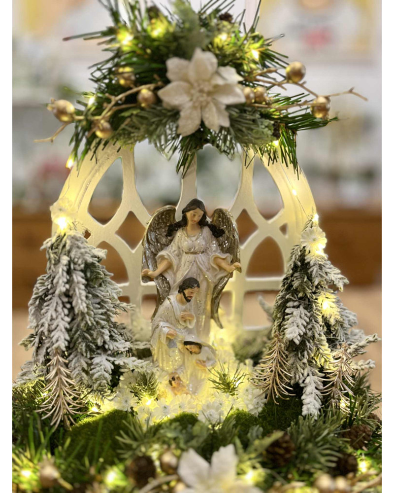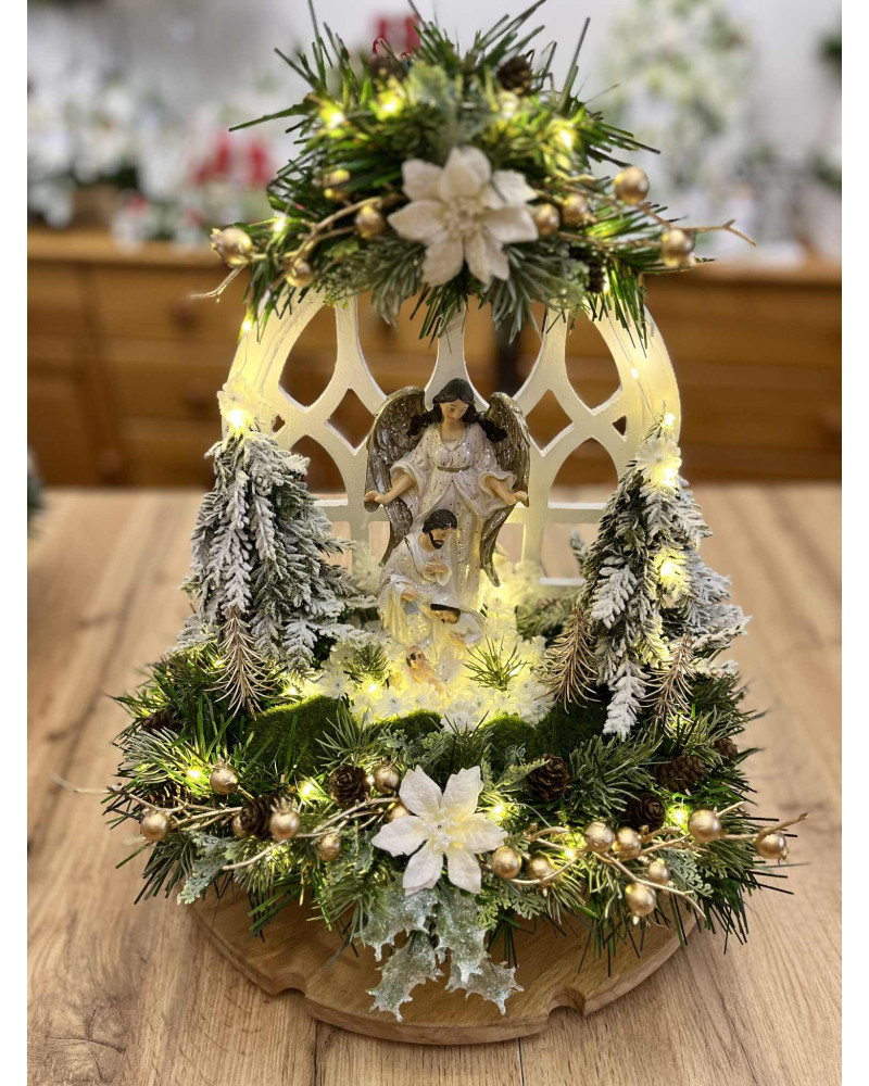 Betlehem v bielej farbe so strieborným ligotom v bielom drevenom okne, bohato zdobený zasneženou zeleňou a stromčekmi, vpredu sú machové kamene. Celý Betlehem je podsvietený svetielkami na baterky, ktoré sú súčasťou dekorácie.